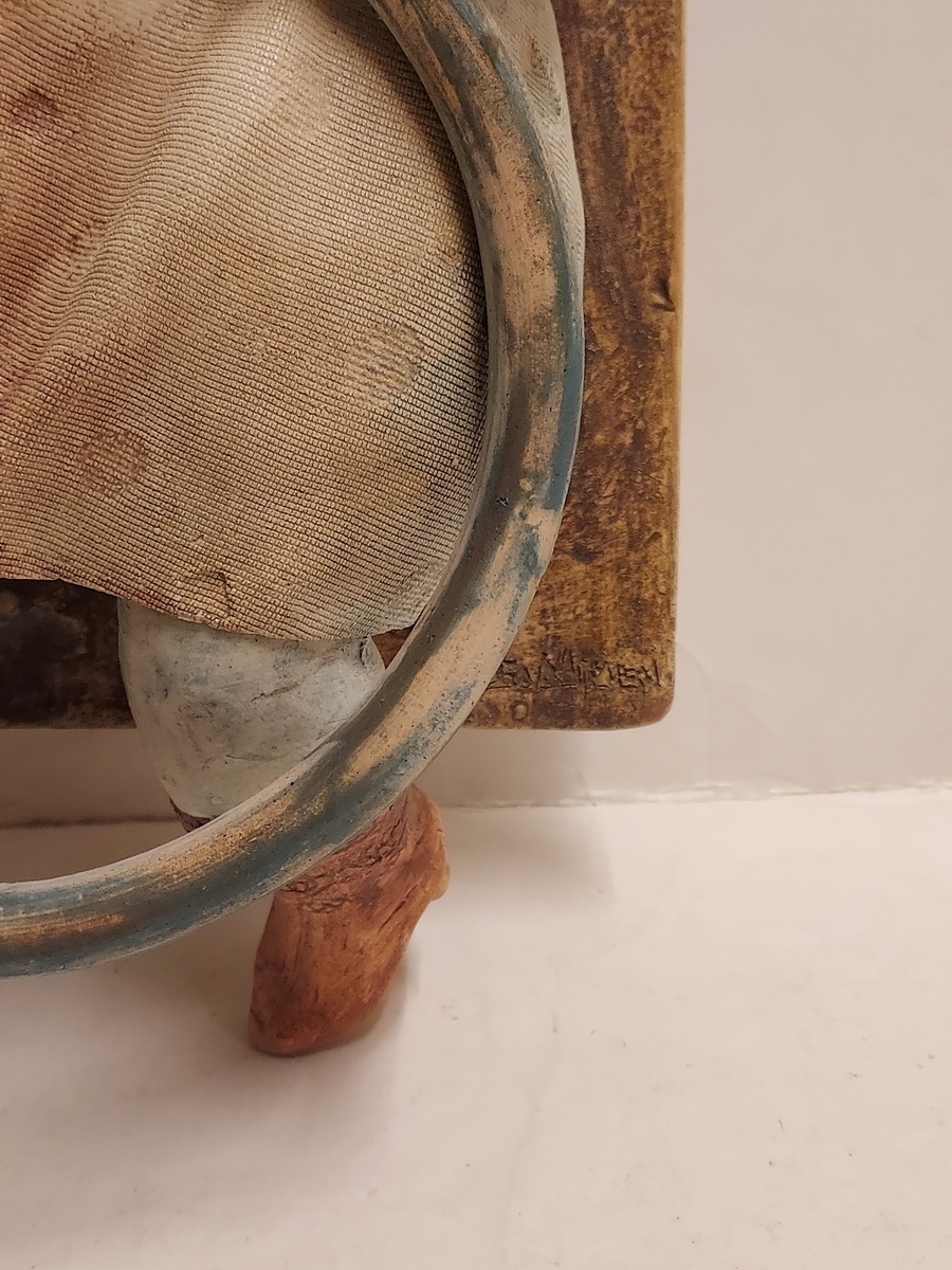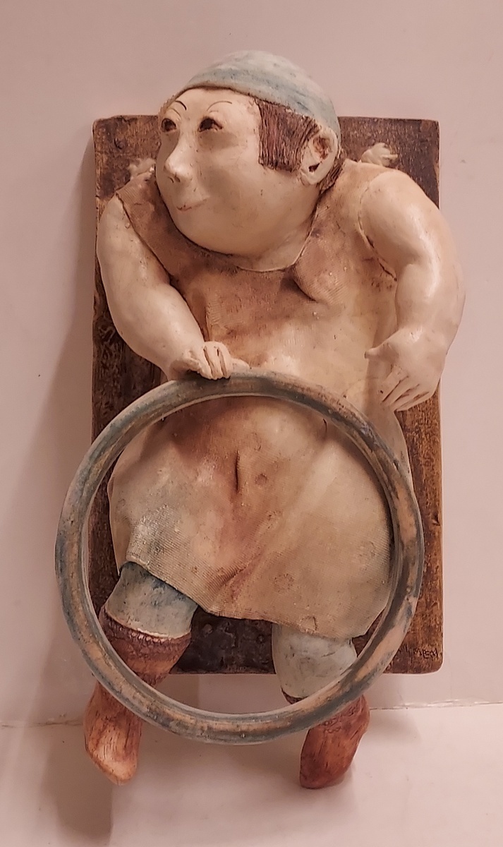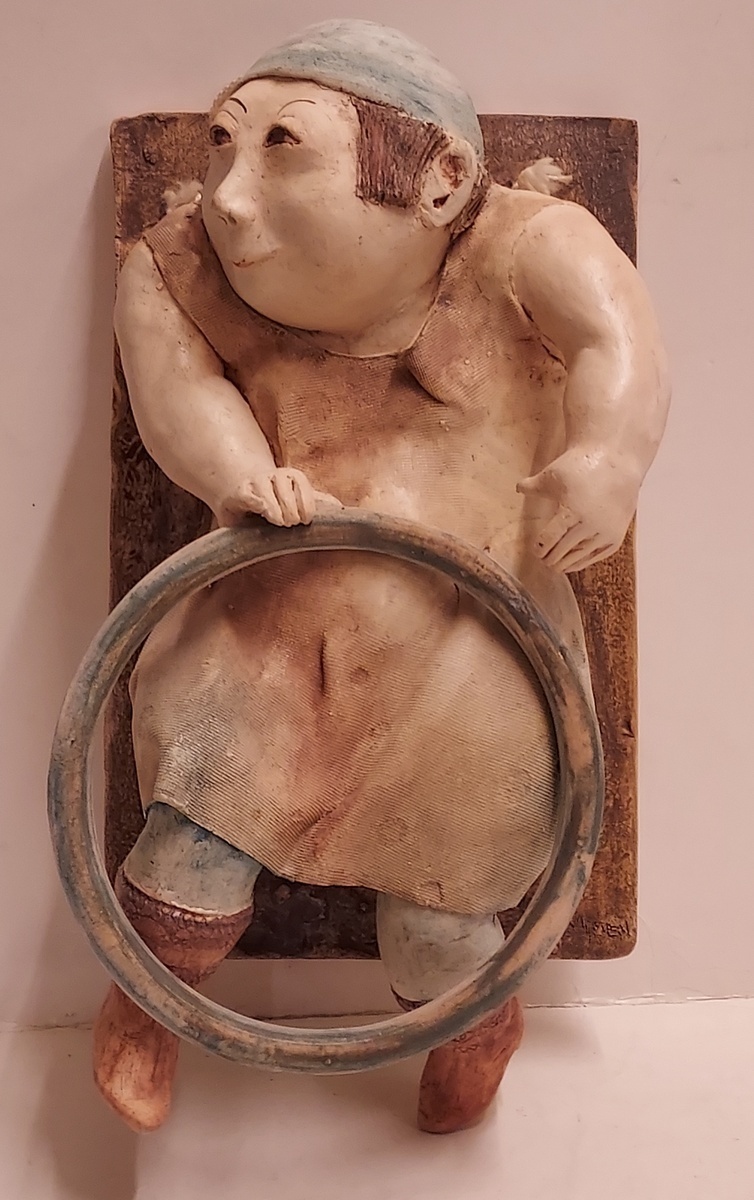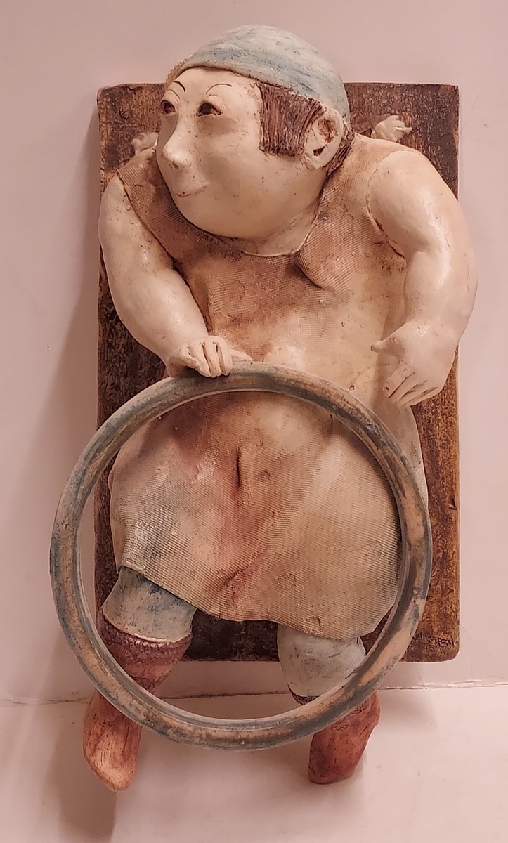 Ceramic wall sculpture of a girl with a hoop. Signed on the lower right.