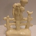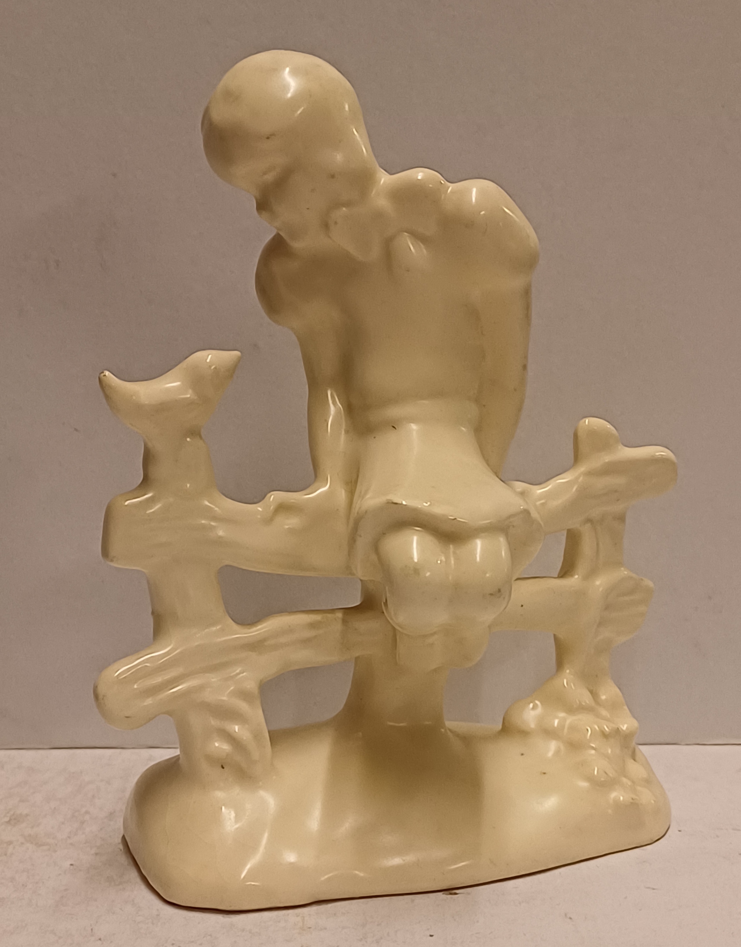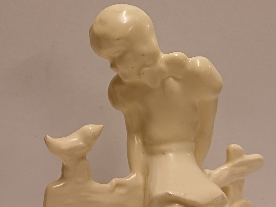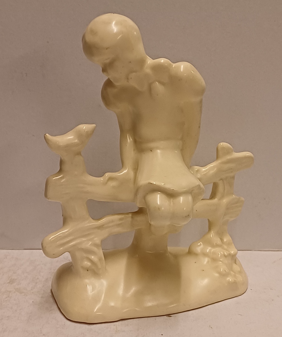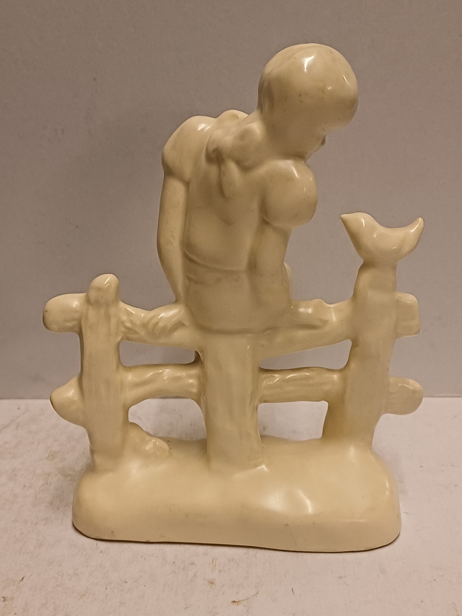 Platelen plastiek van een meisje zittend op een hek met vogel. Achterzijde met signatuur Etha Lempke. Onderzijde met gestempeld fabrieksmerk.