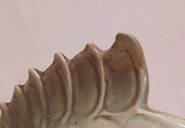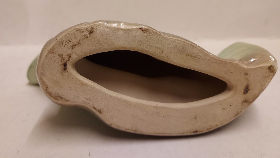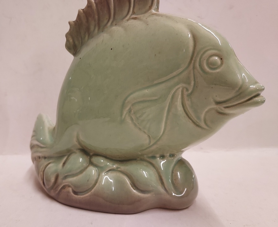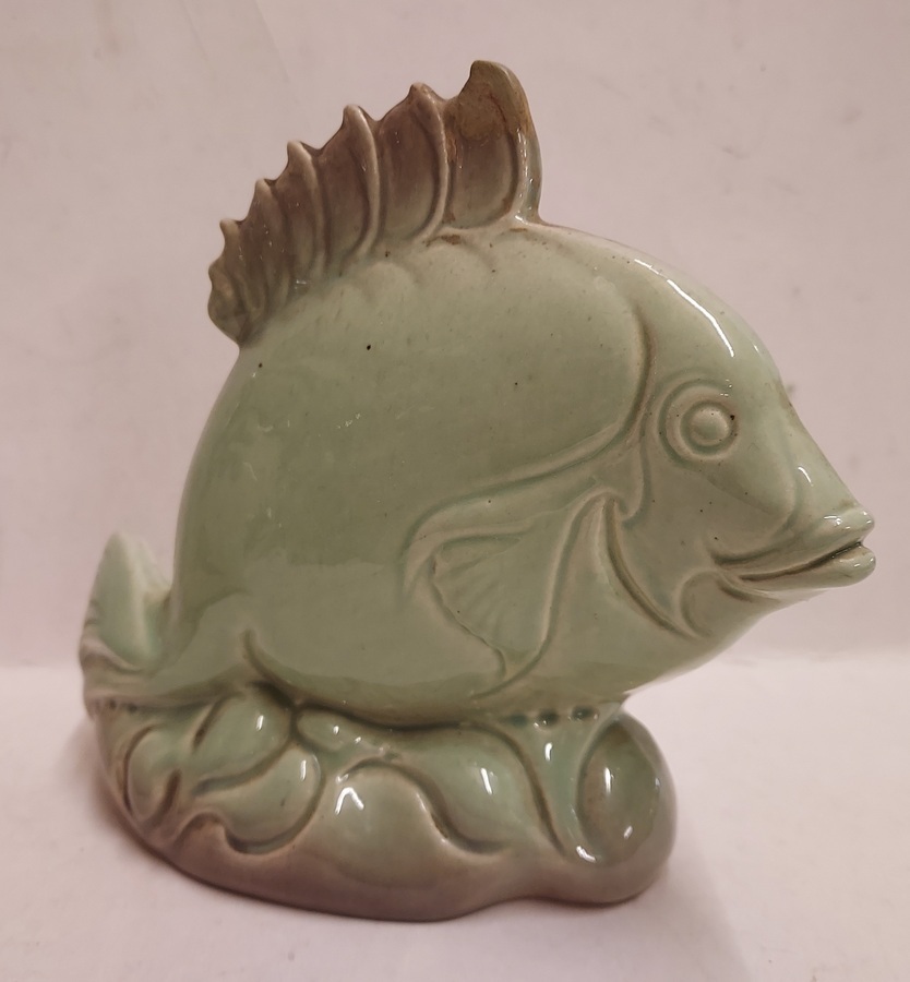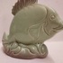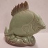 Cast sculpture of a fish in green glaze with brown accents. Not signed.