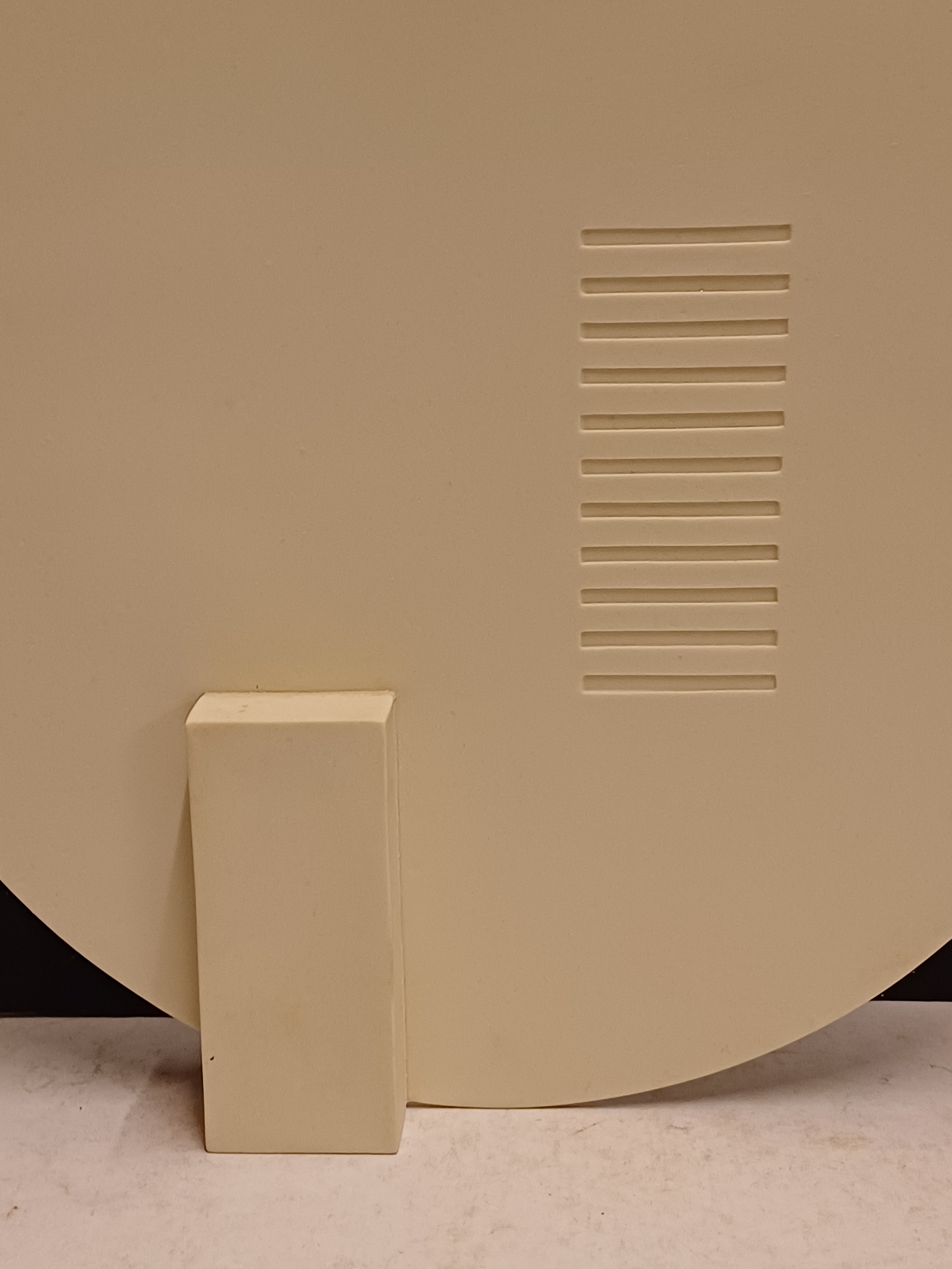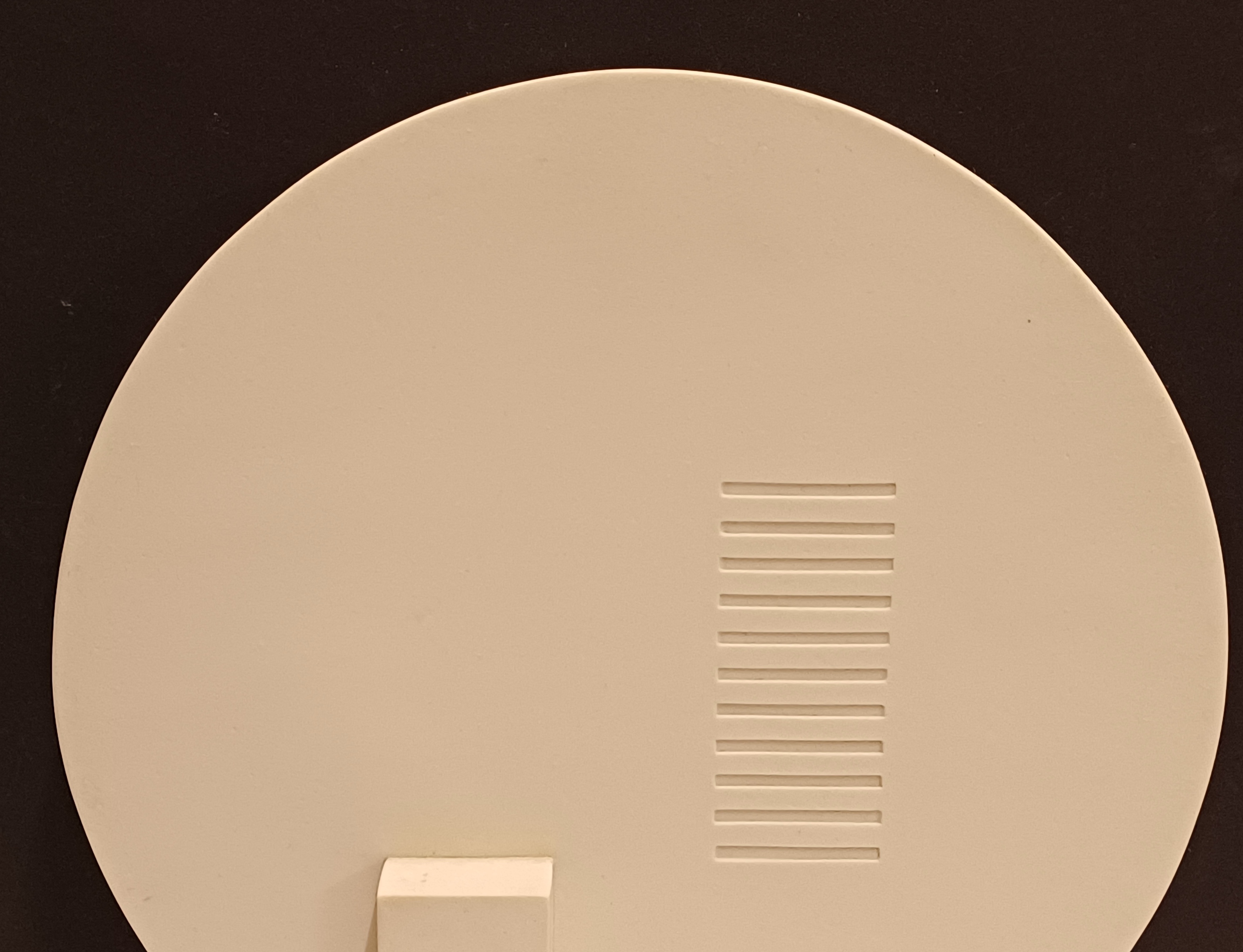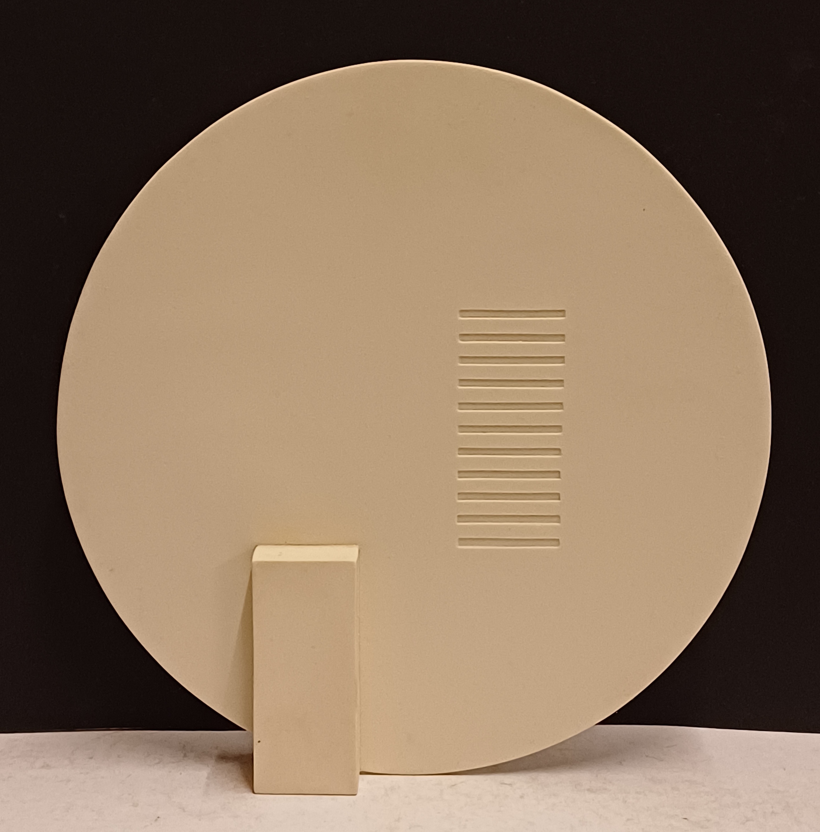 Porseleinen schijf met verticale lijnen op rechthoekig voetstuk. Aan de zijkant gesigneerd.