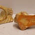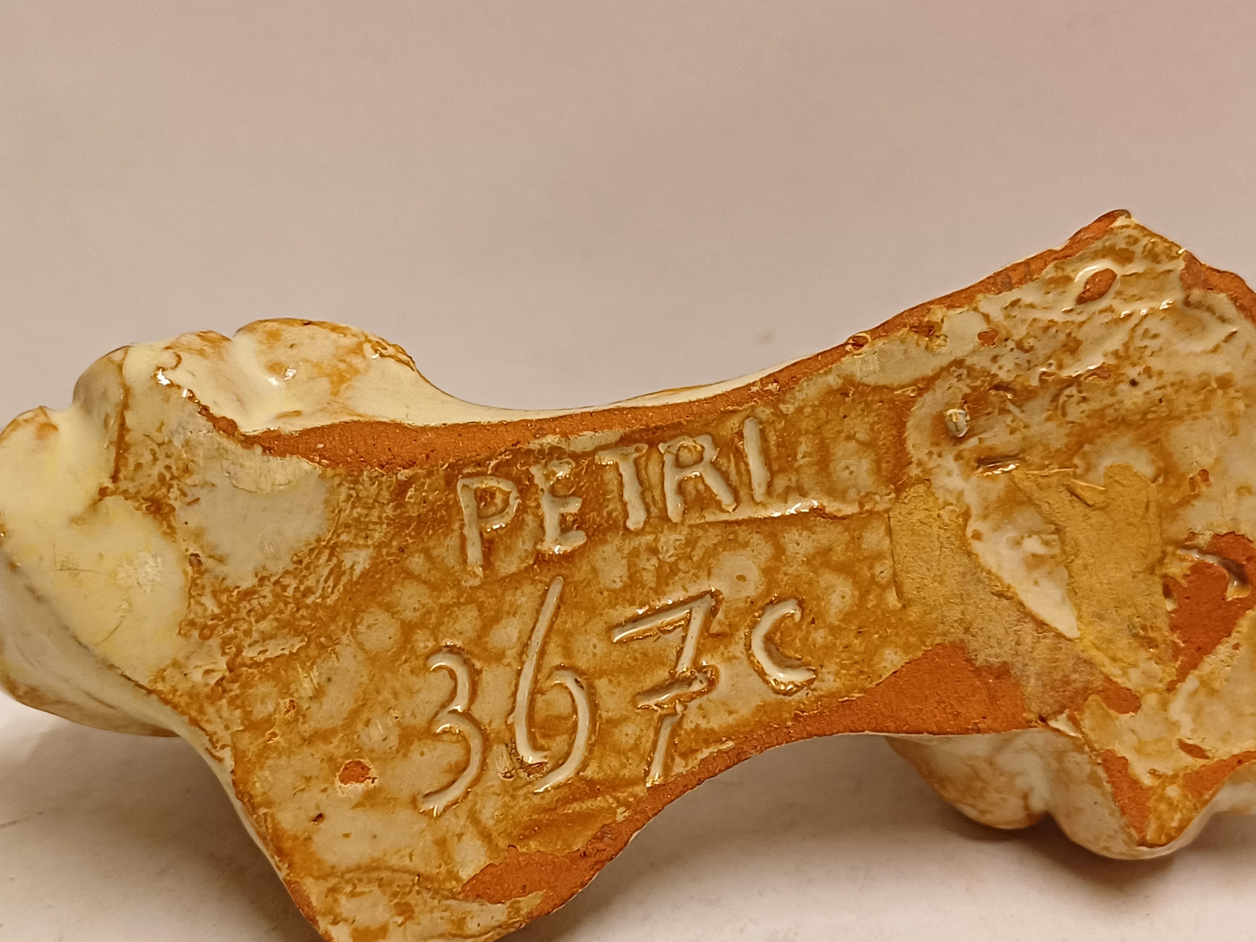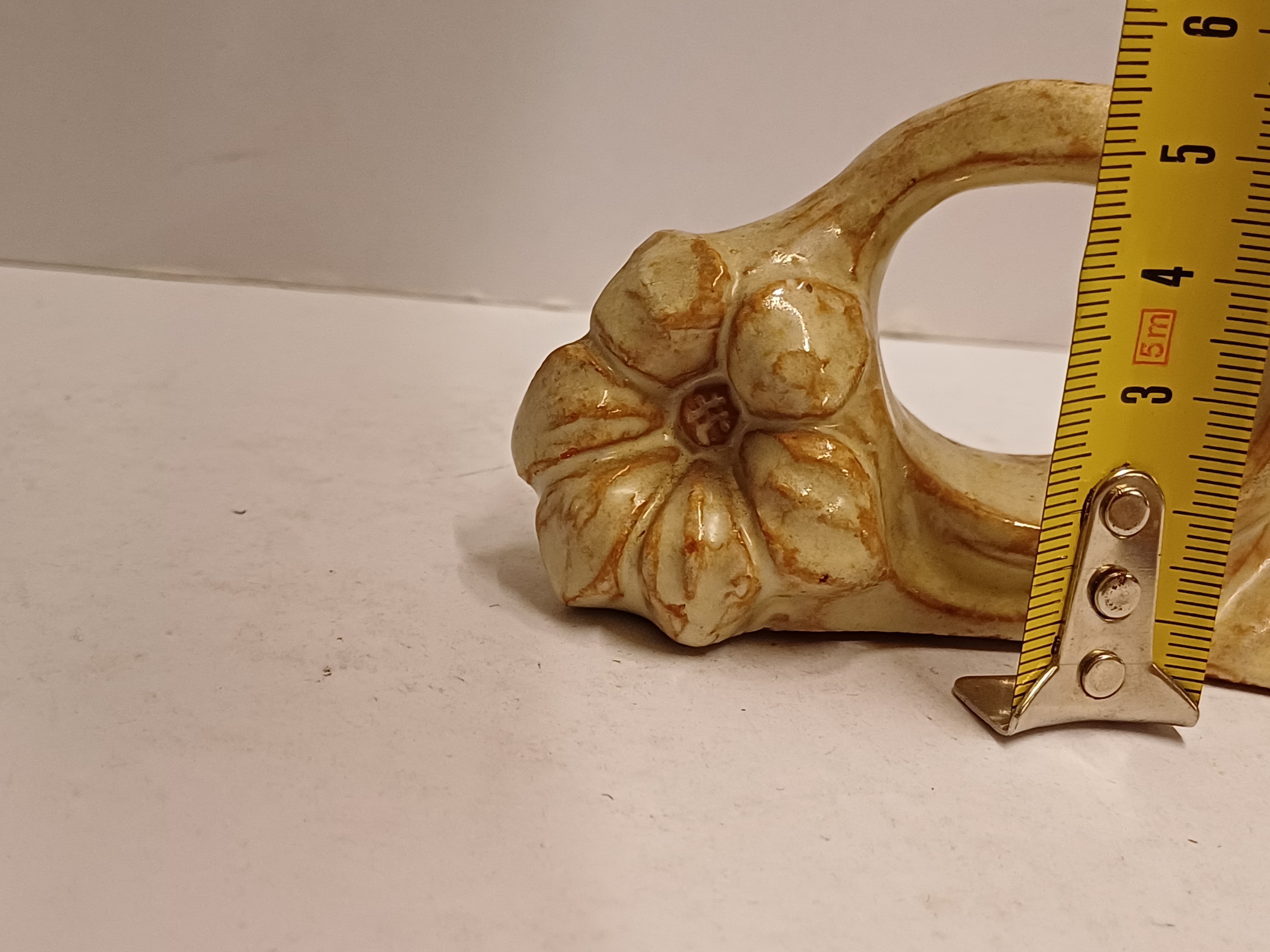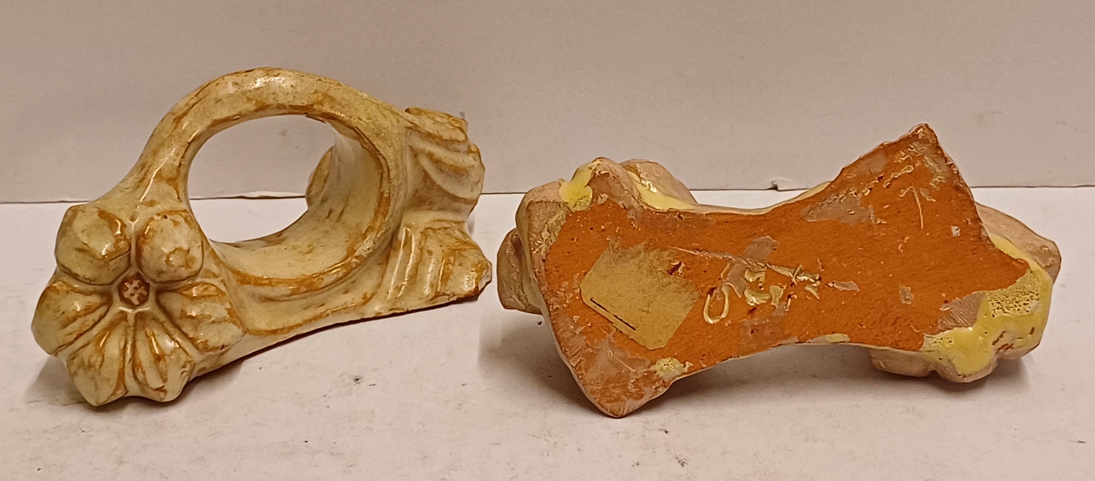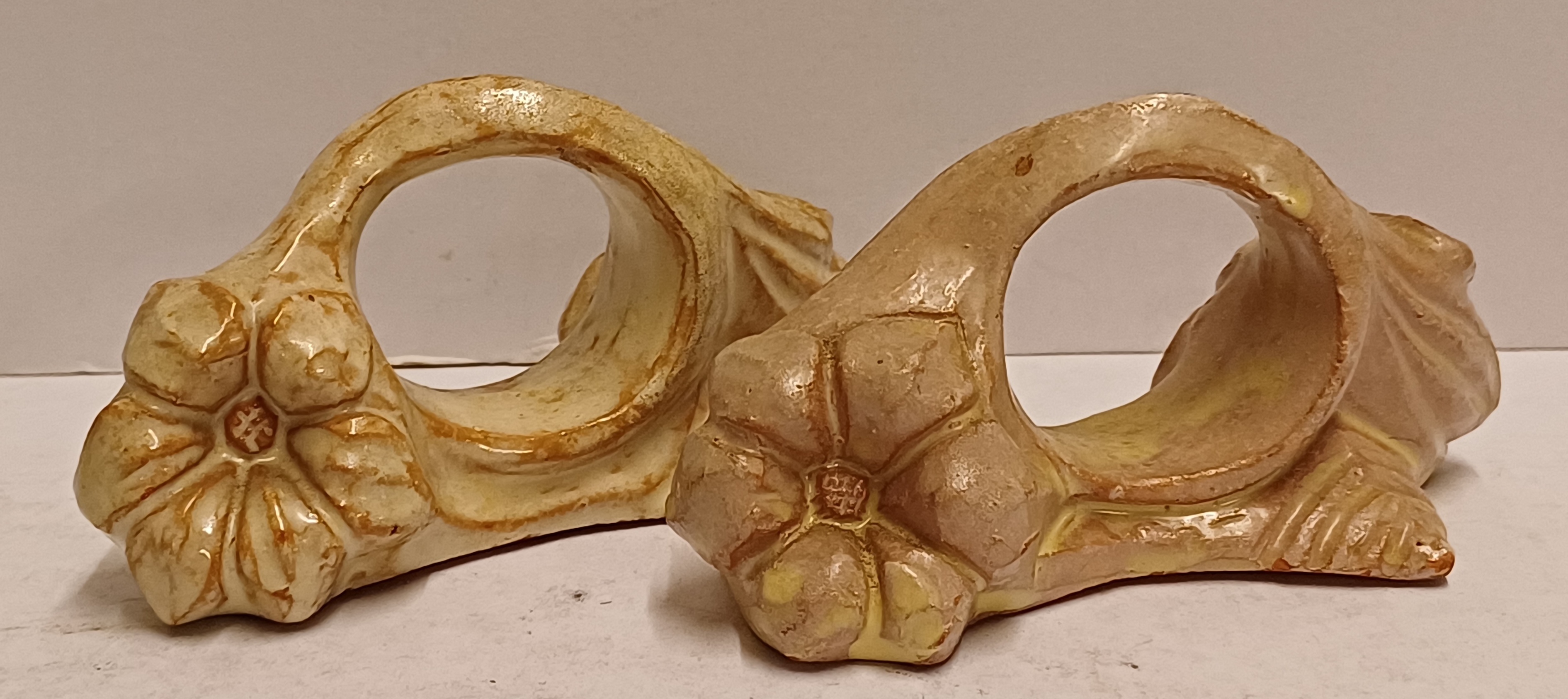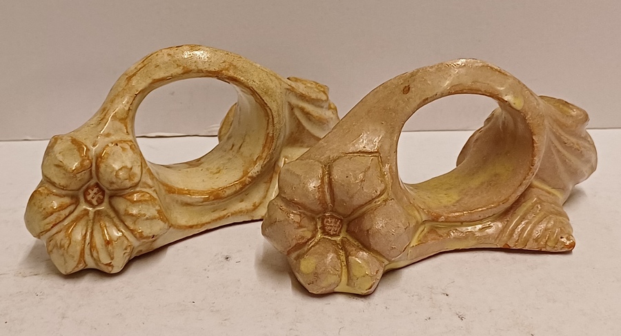 2 terracotta napkin rings with a flower decoration. 1 marked on the bottom.