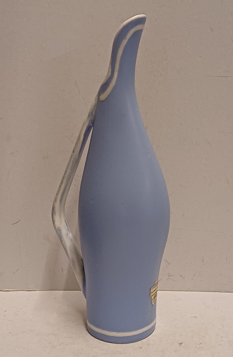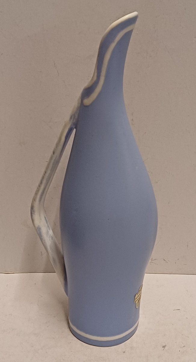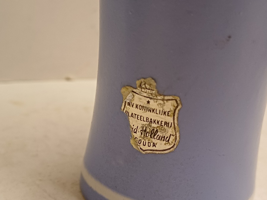 Blauw wit geglazuurd kannetje met decor Blue sky. Onderzijde met fabrieksmerk en restant van etiket.