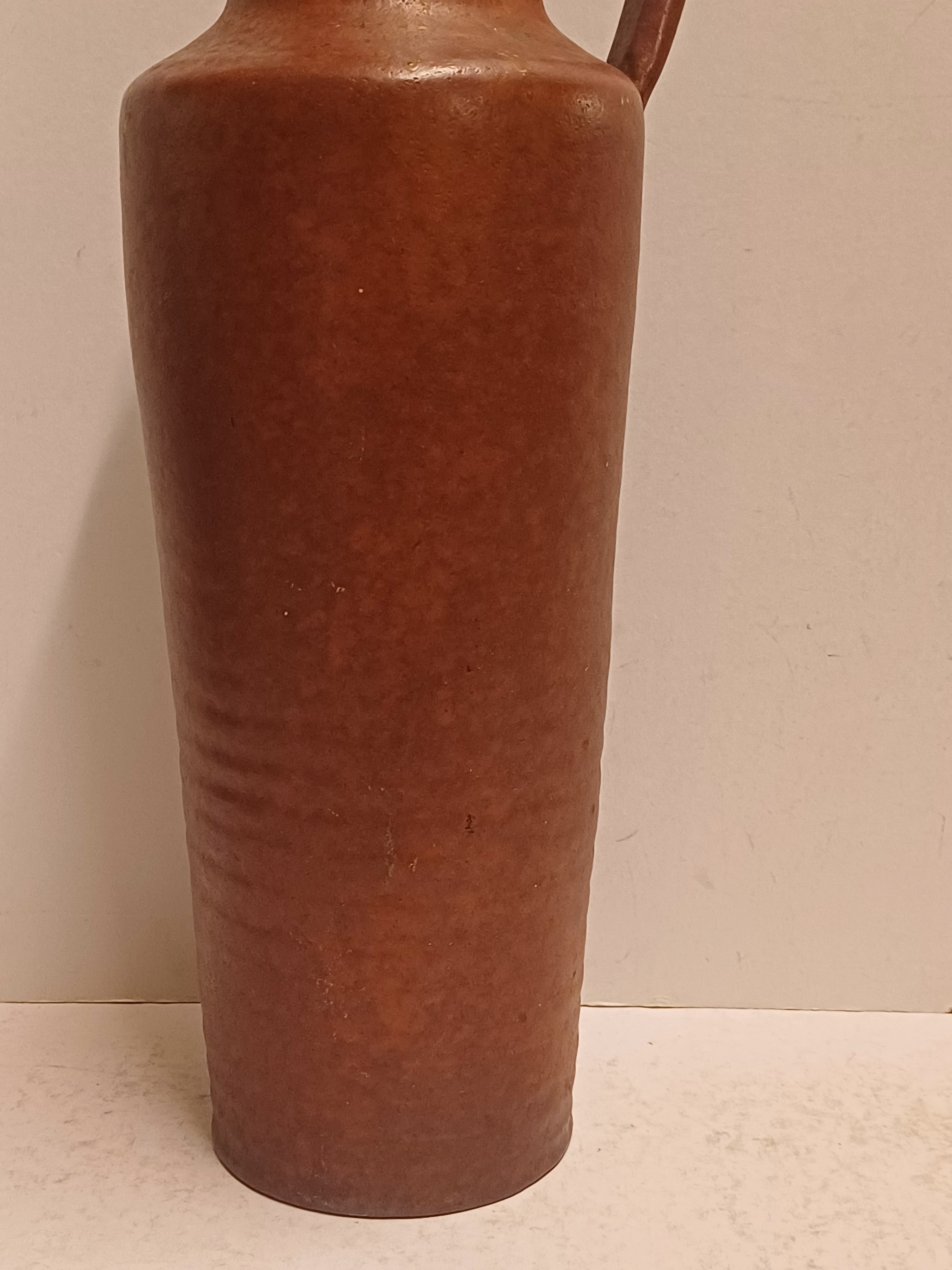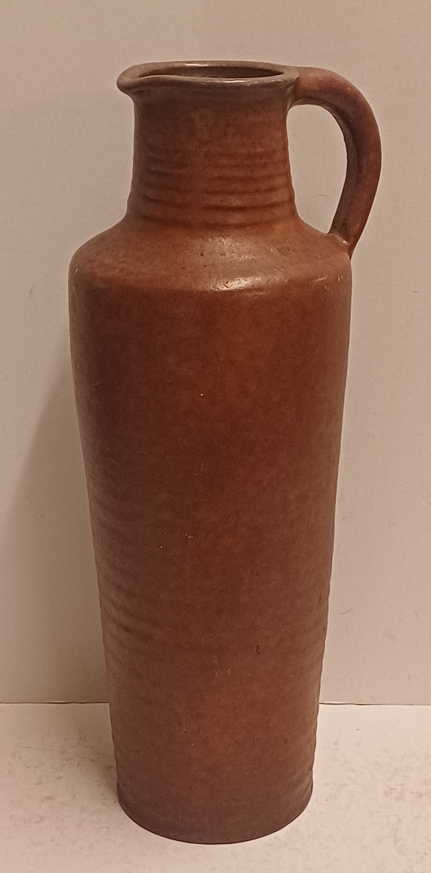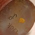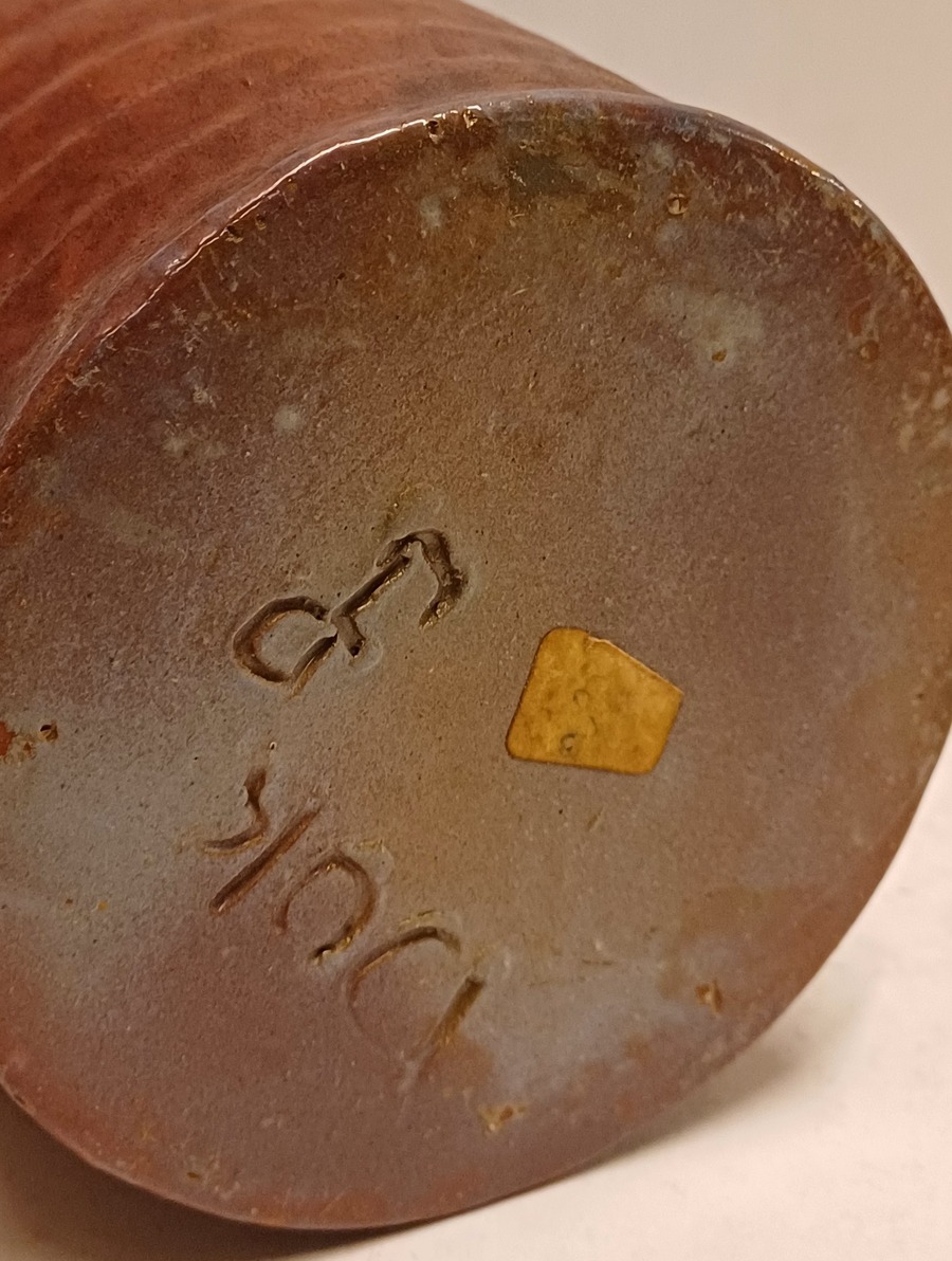 Grote handgedraaide sierkan met bordeaux rode glazuur. Onderzijde gesigneerd en draaiers monogram.