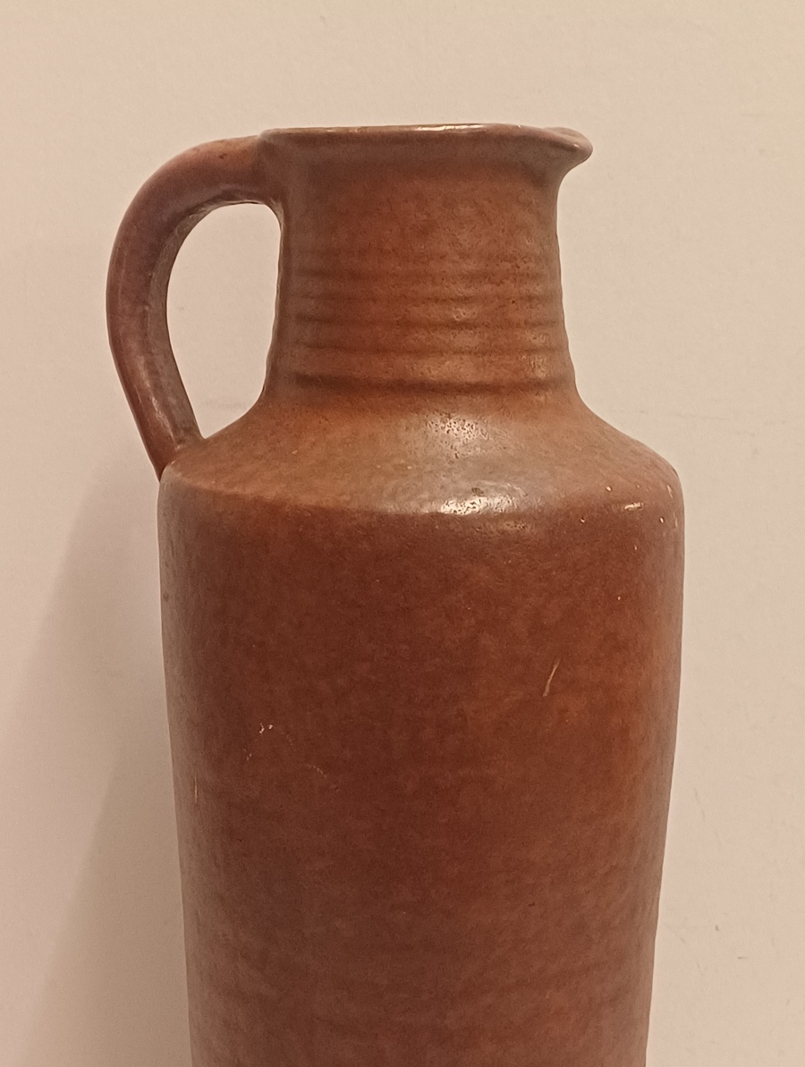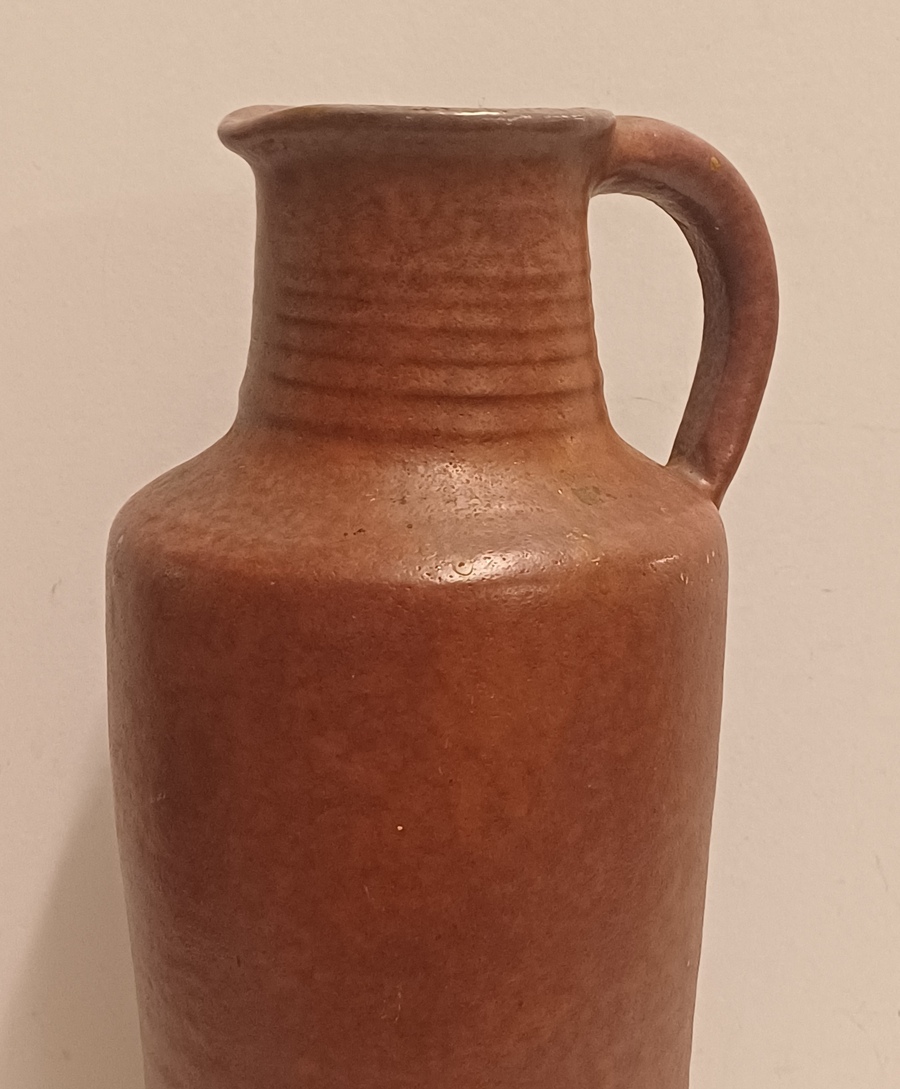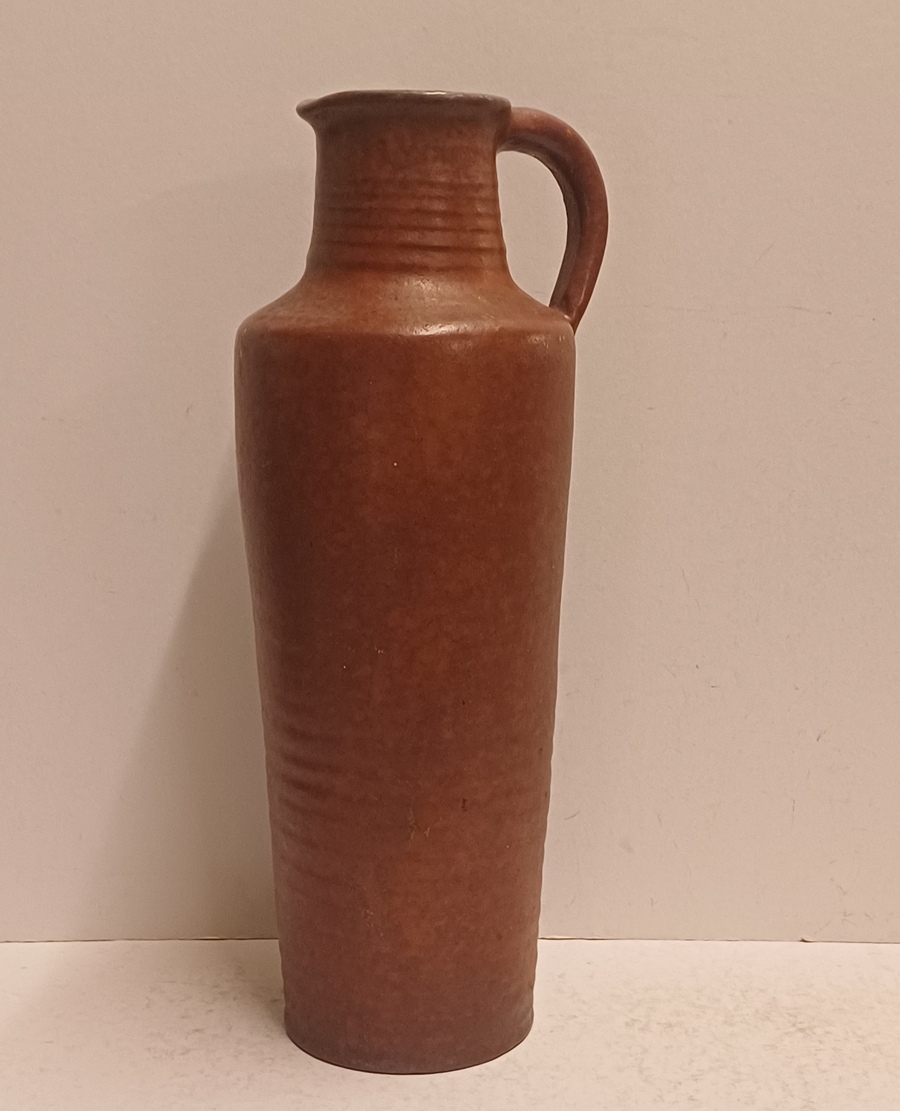 Grote handgedraaide sierkan met bordeaux rode glazuur. Onderzijde gesigneerd en draaiers monogram.