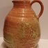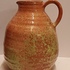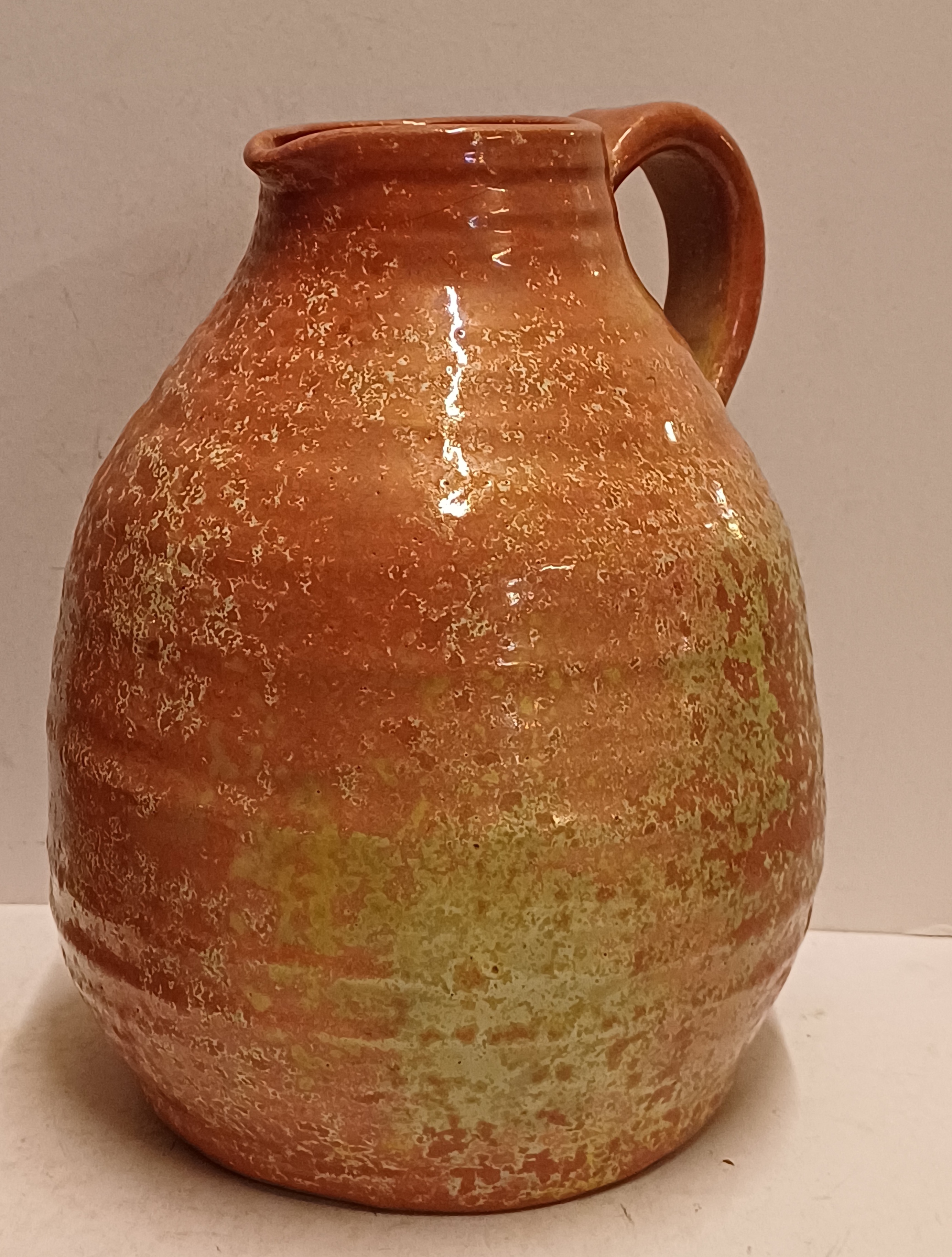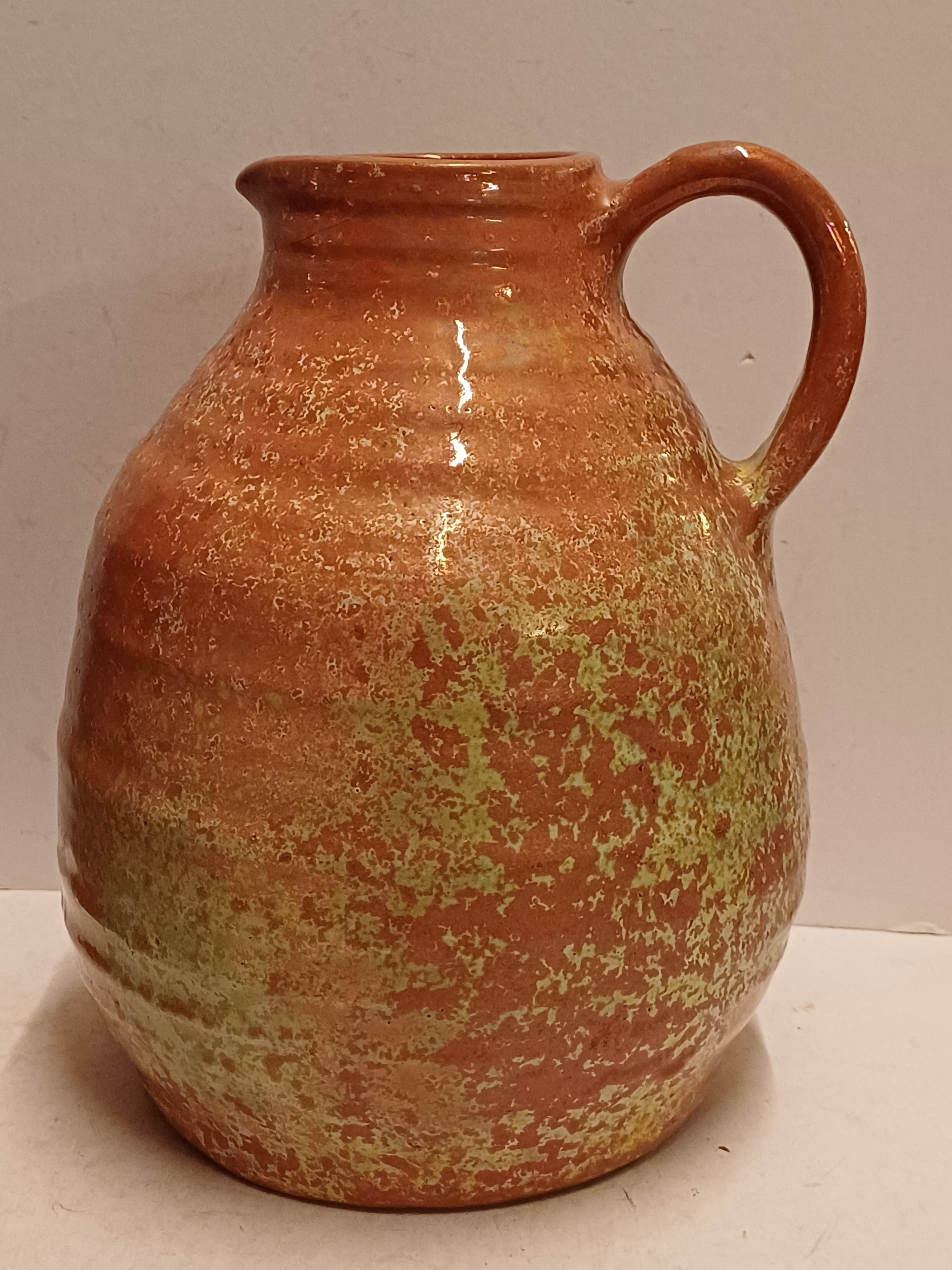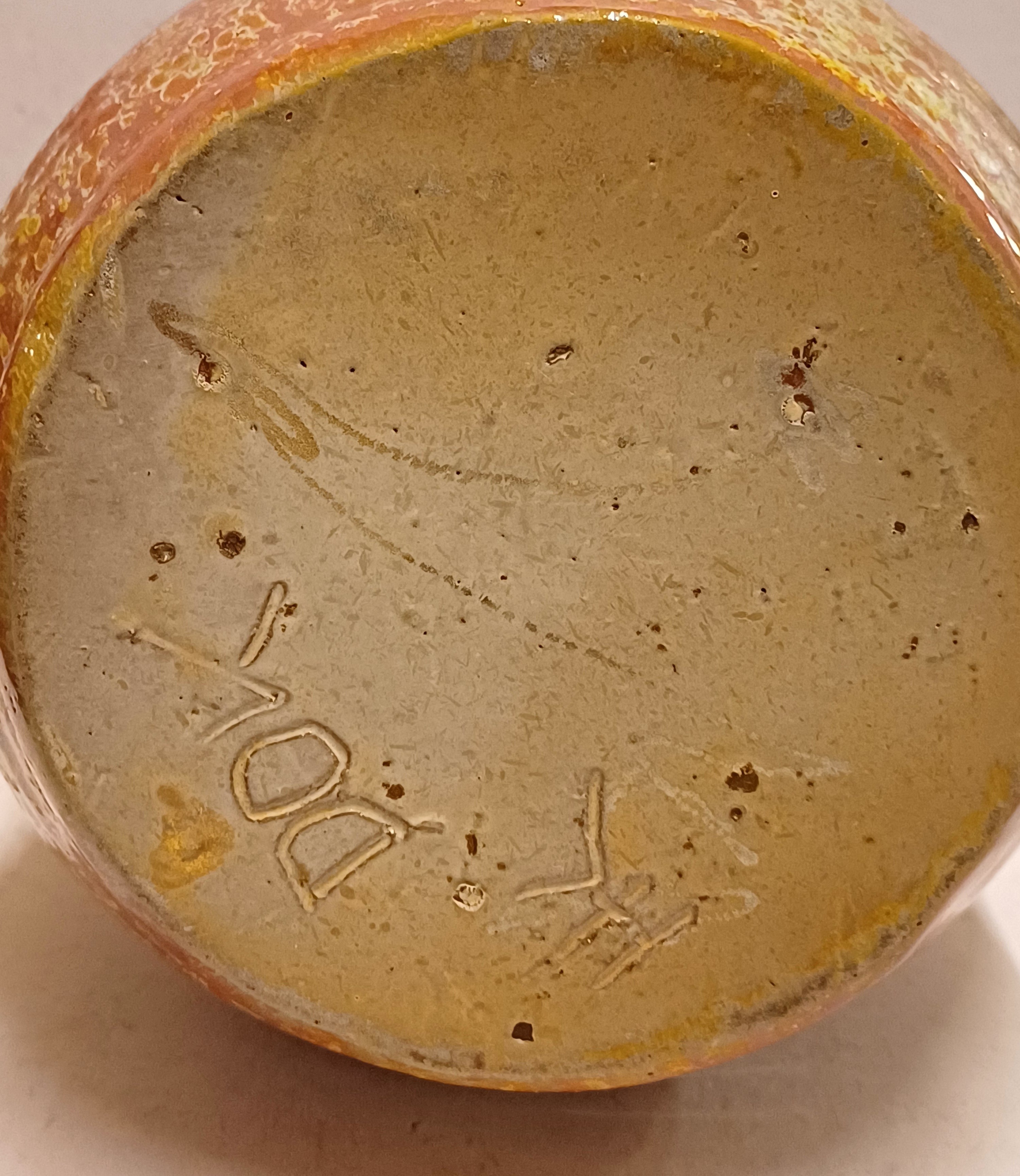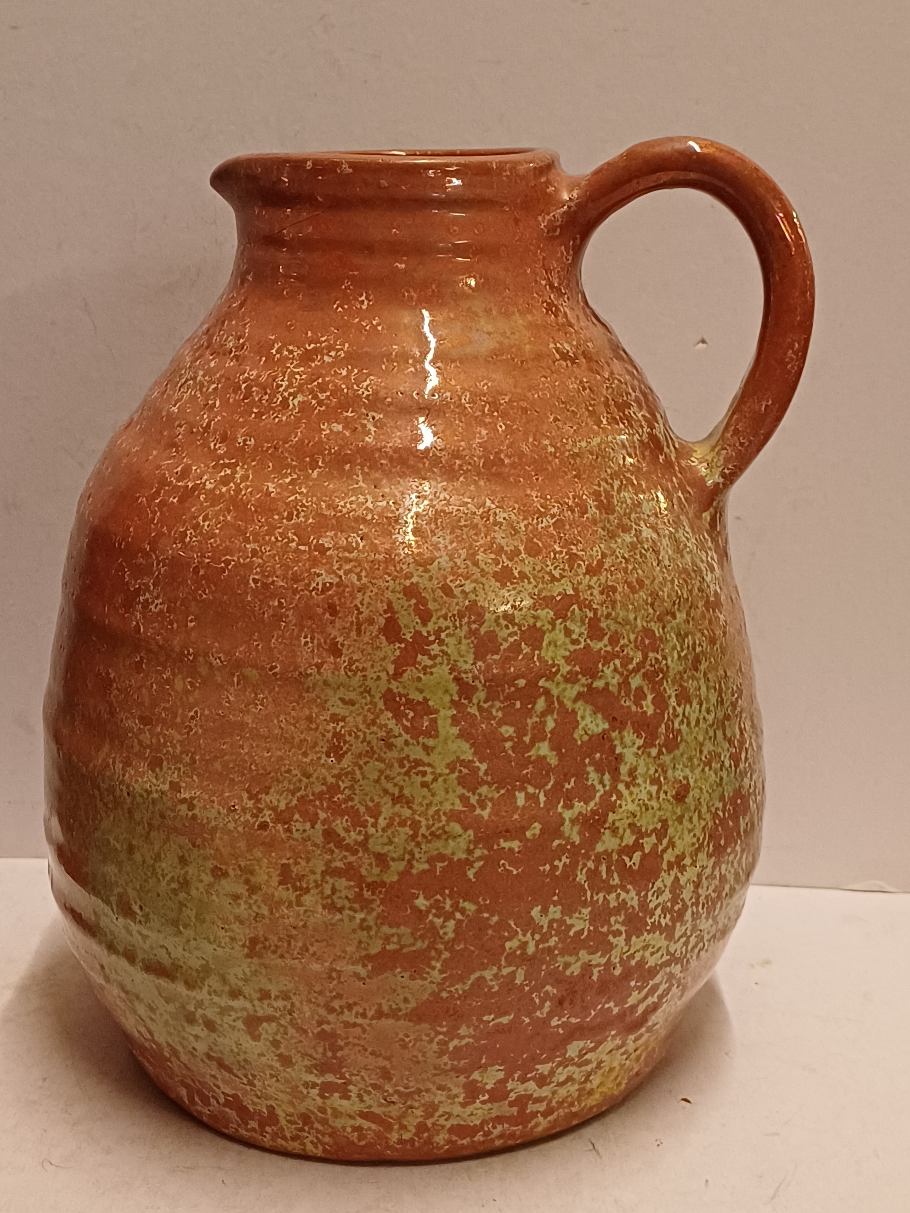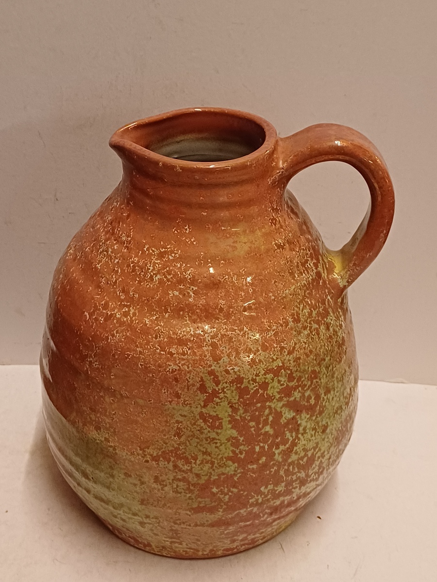 Een forse sierkan met metallic rode glazuur met groene accenten. Onderzijde gemerkt.