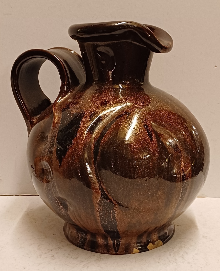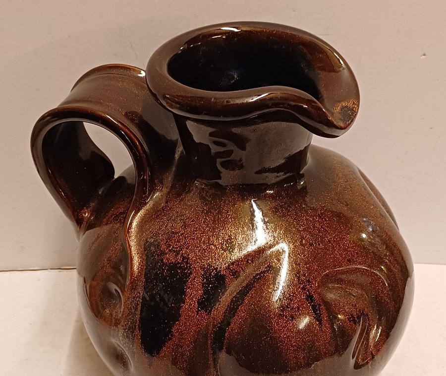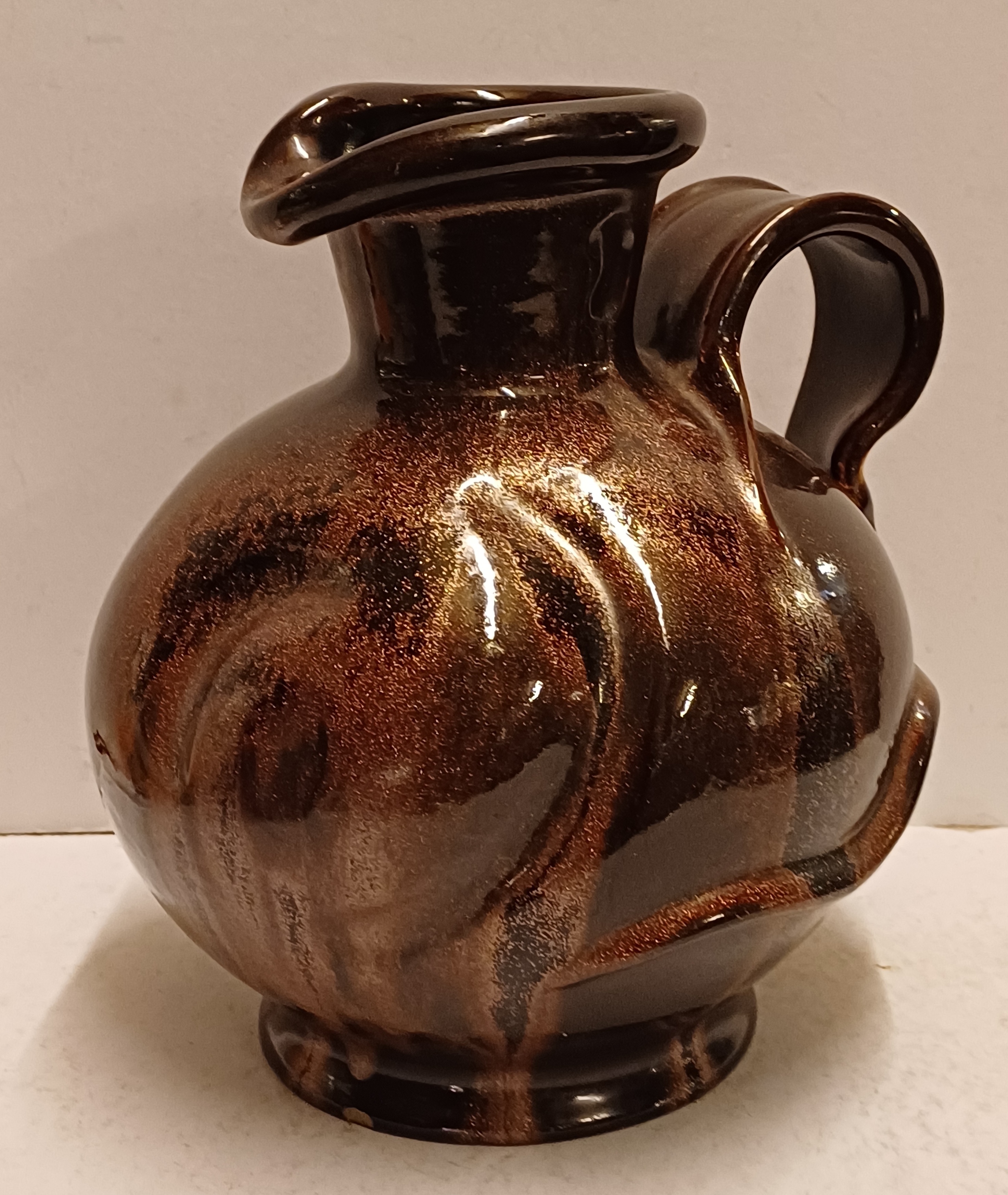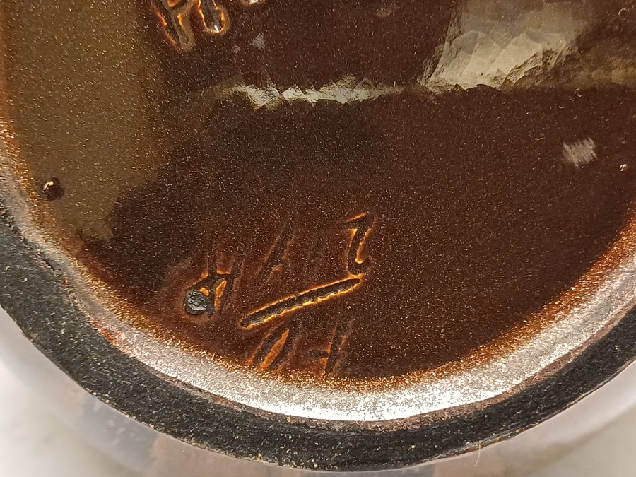 Aardewerken sierkan met grillige decoratie en bruine metallic glazuur. Onderzijde met fabrieksmerk en kunstenaars signatuur.