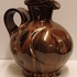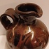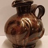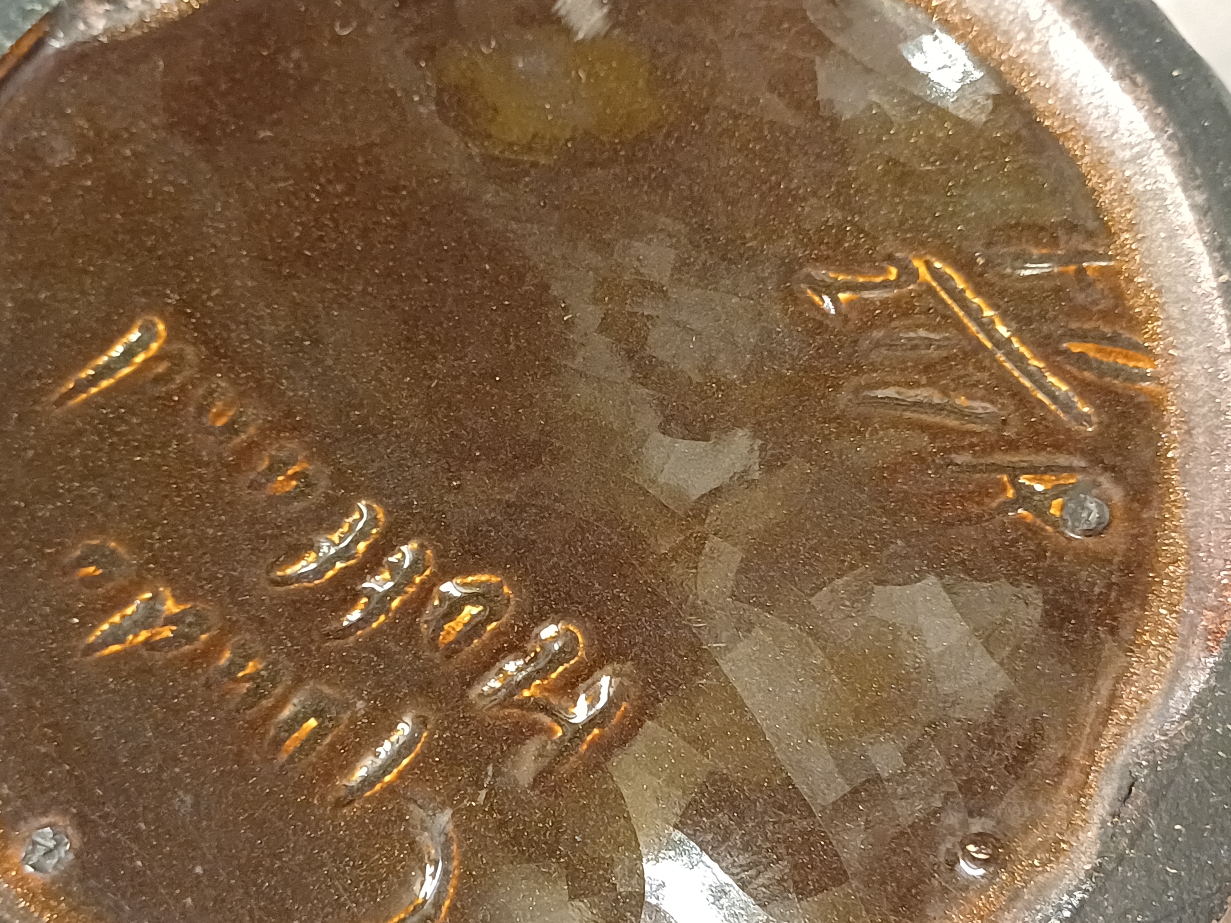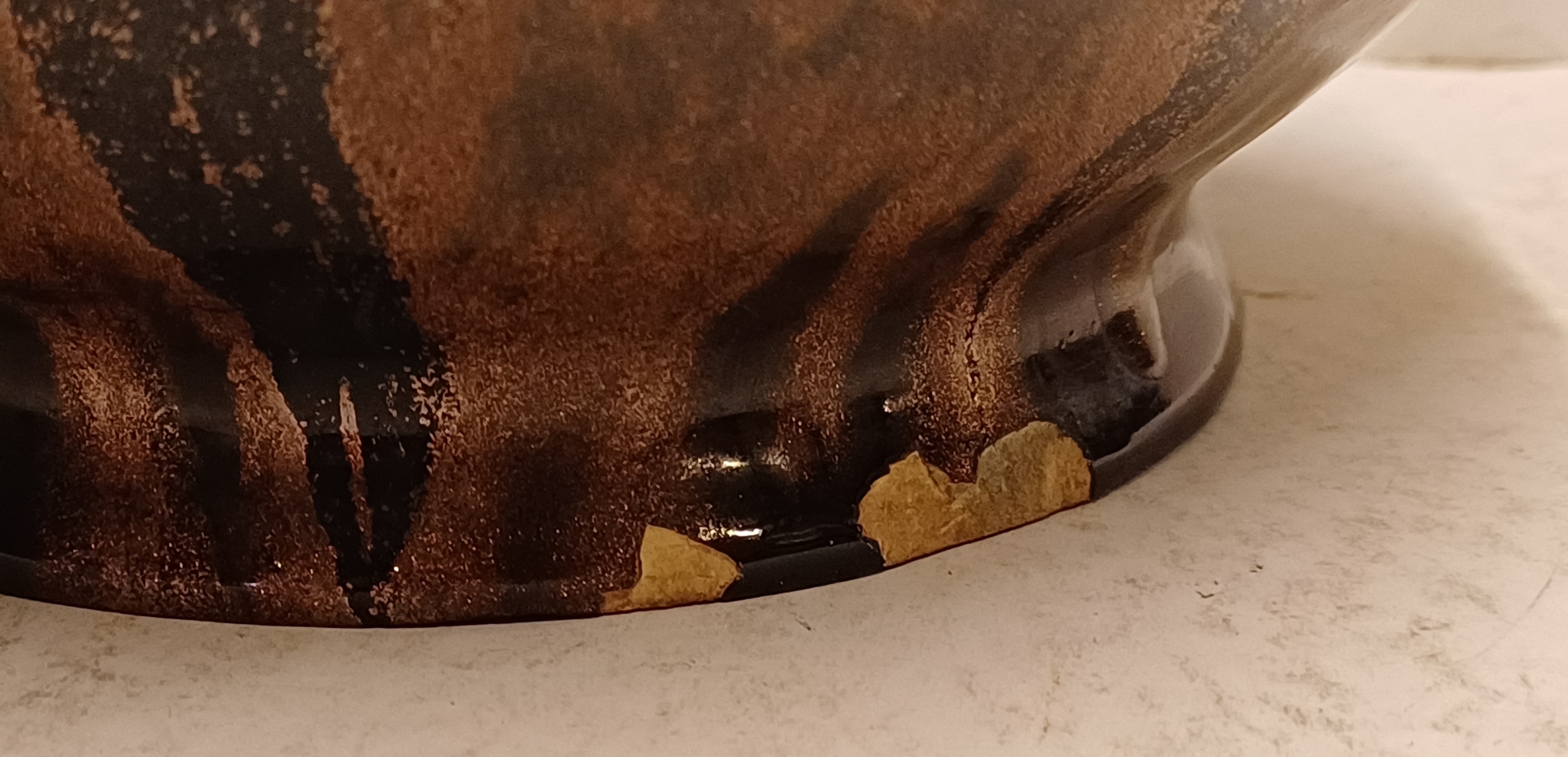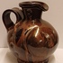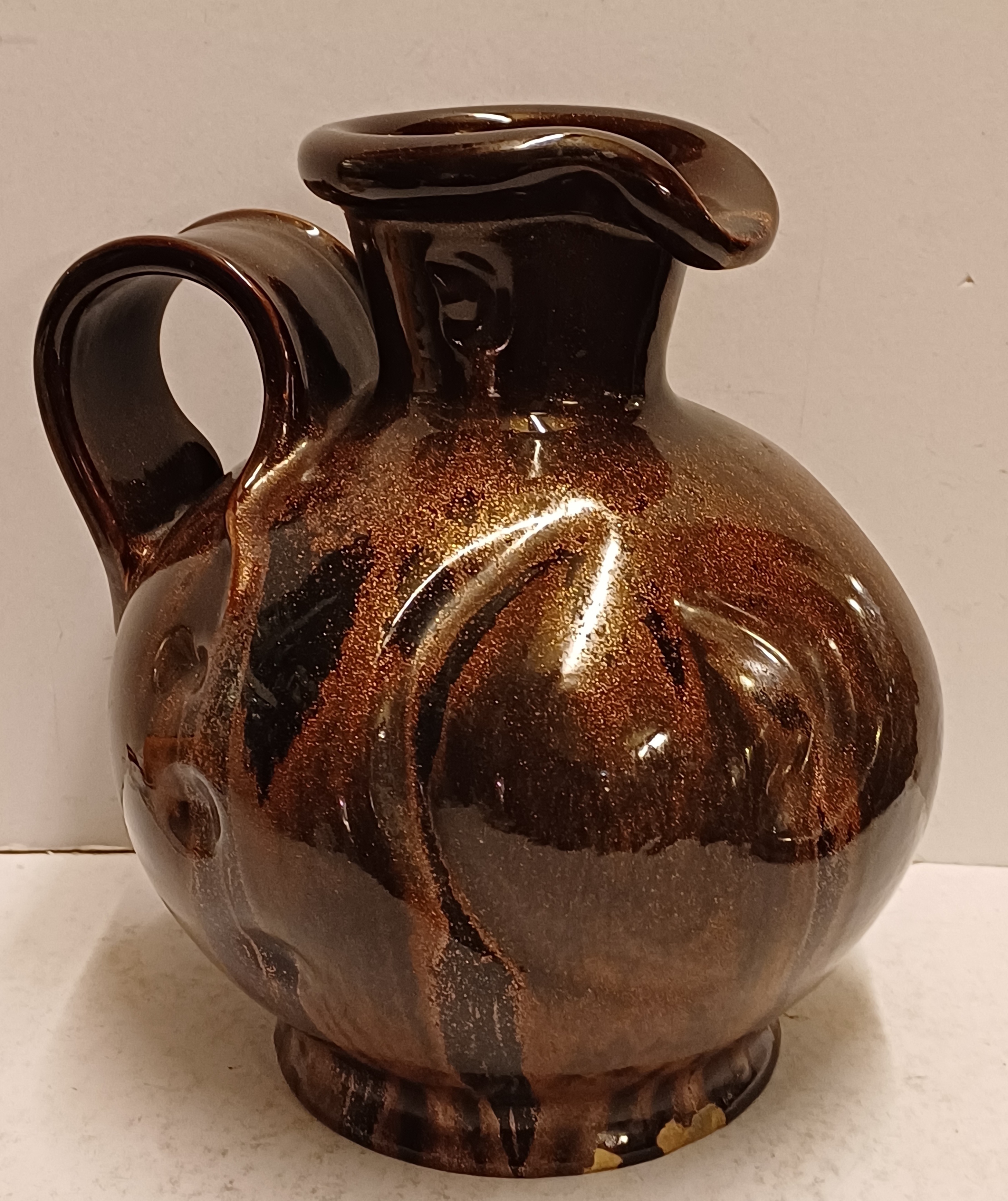 Aardewerken sierkan met grillige decoratie en bruine metallic glazuur. Onderzijde met fabrieksmerk en kunstenaars signatuur.
