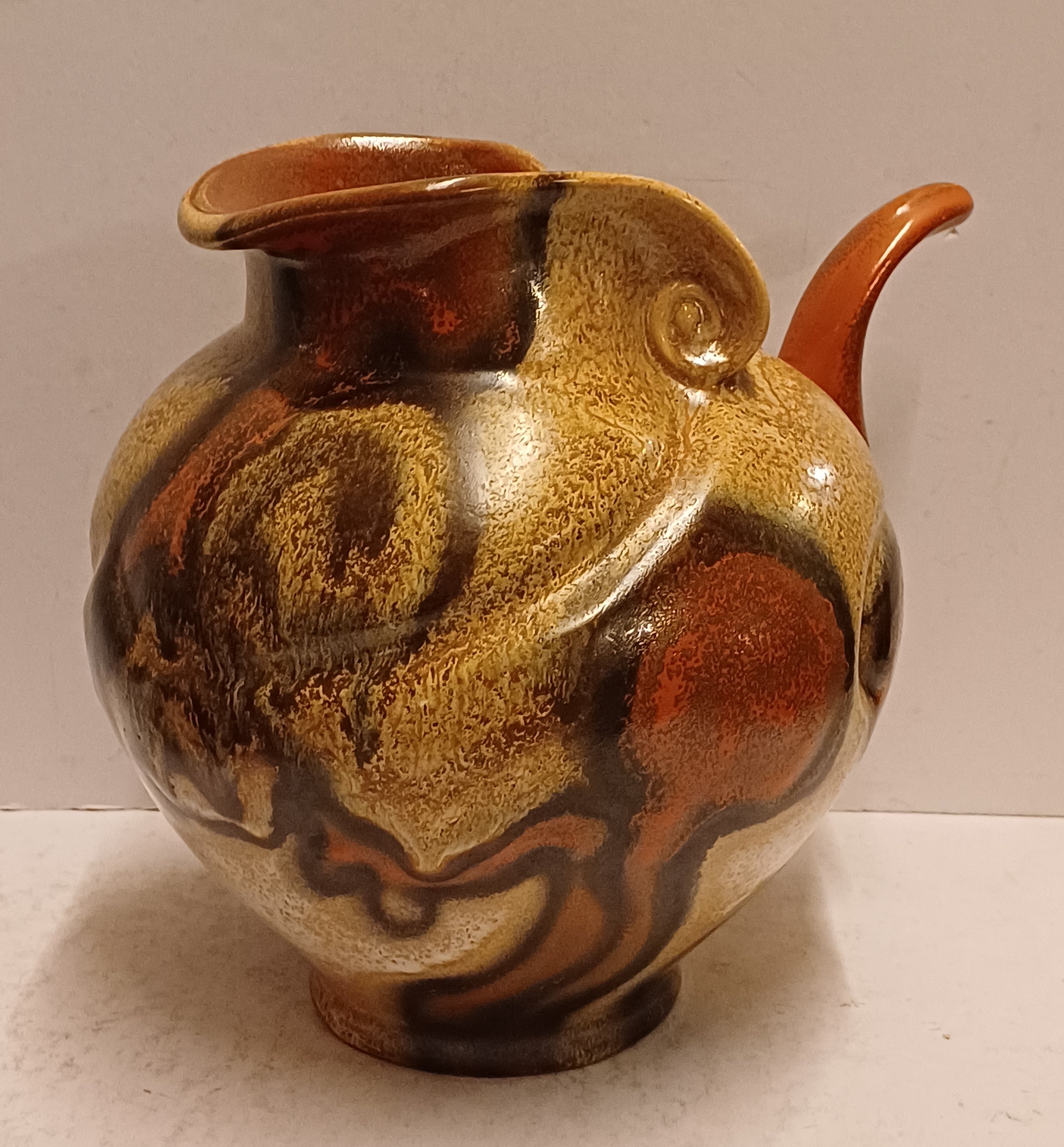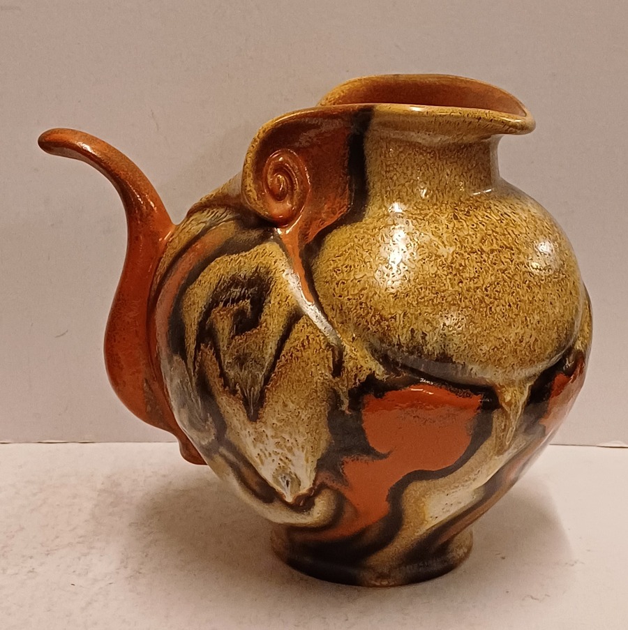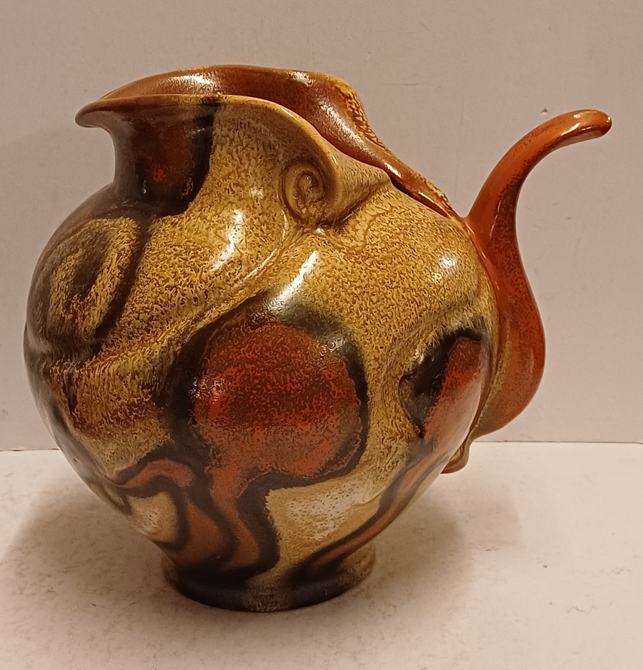 Met gemêleerde muvelee glazuur op grillige gesneden schenkkan. Ontwerp Fons Decker voor Plateelbakkerij Zuid Holland