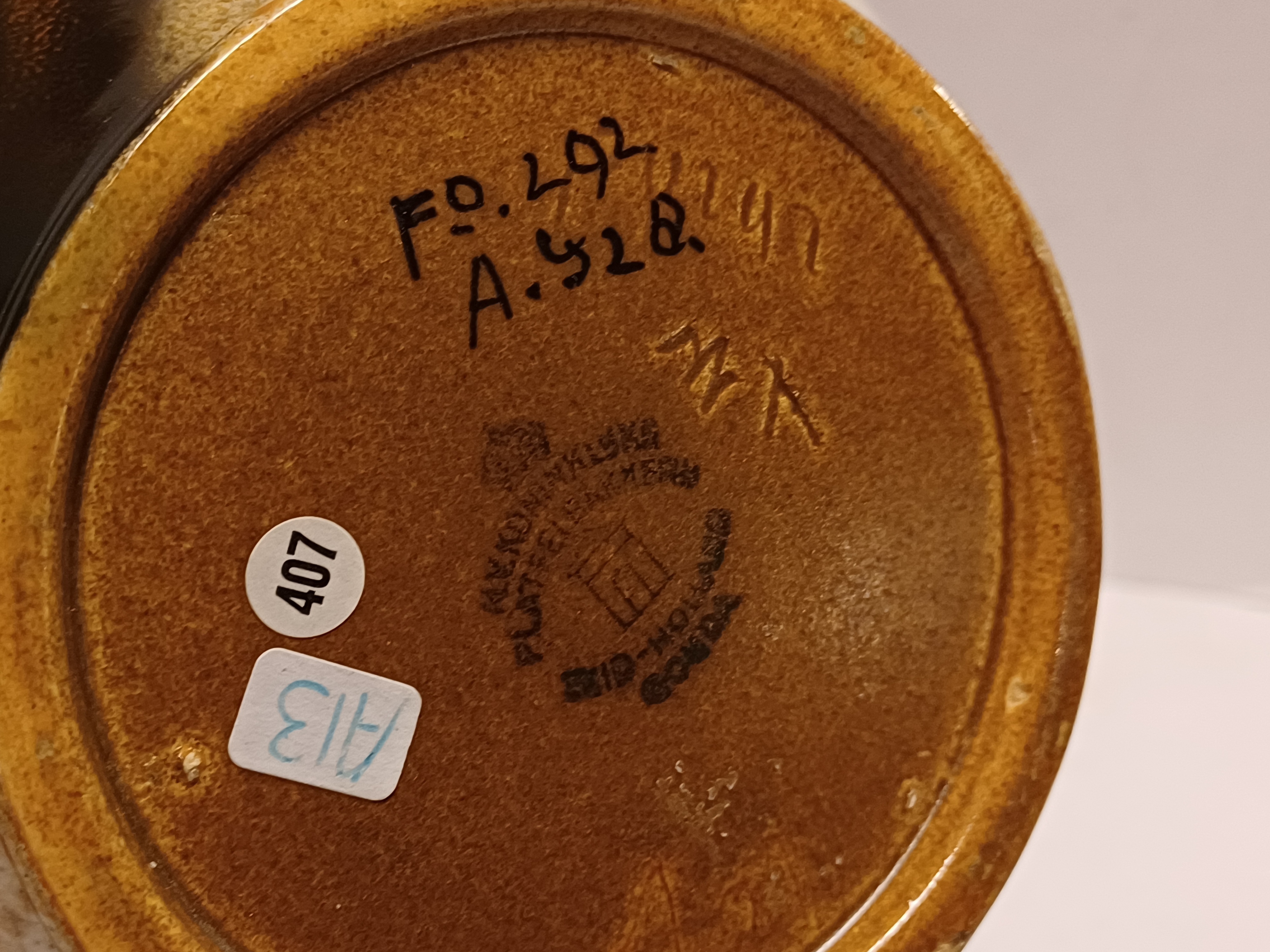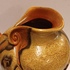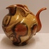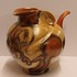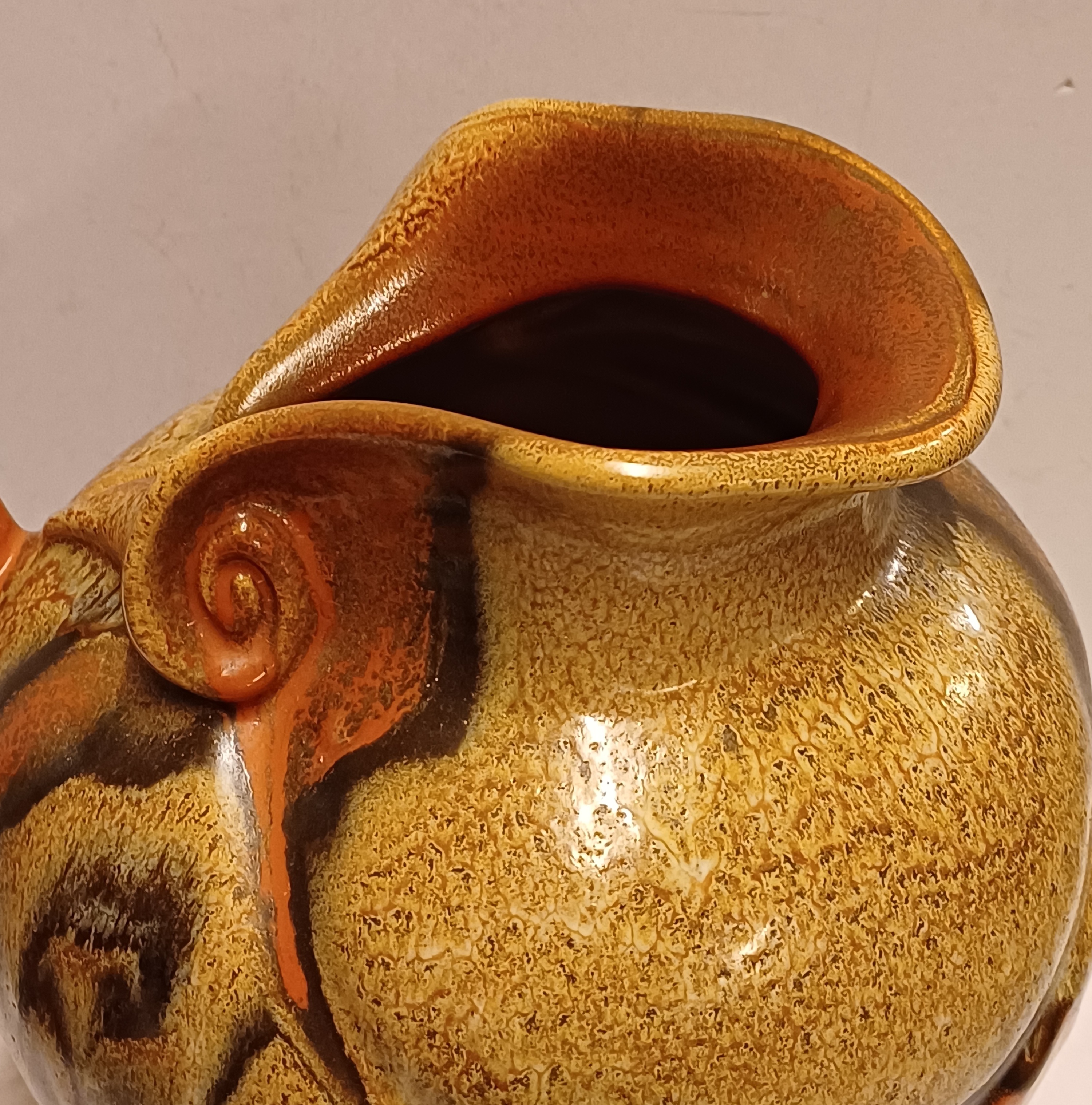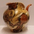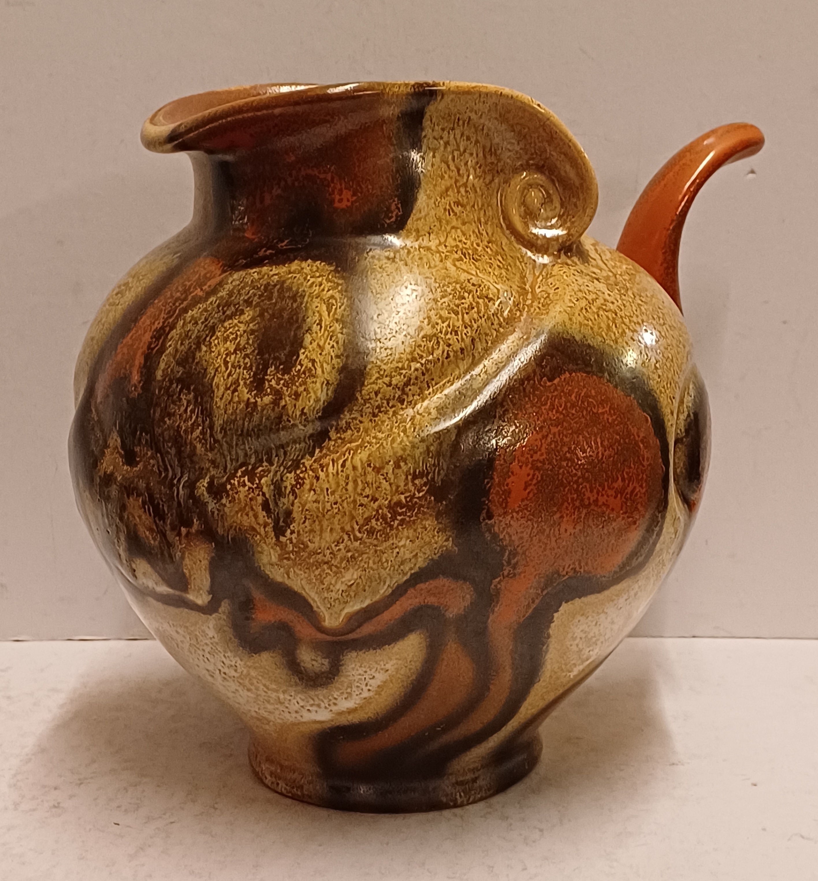Met gemêleerde muvelee glazuur op grillige gesneden schenkkan. Ontwerp Fons Decker voor Plateelbakkerij Zuid Holland