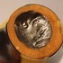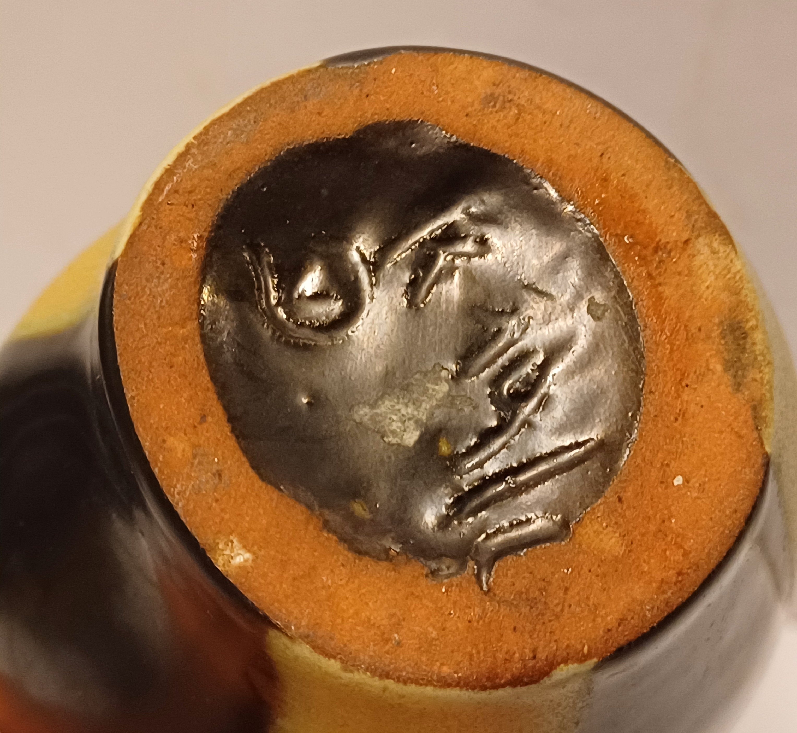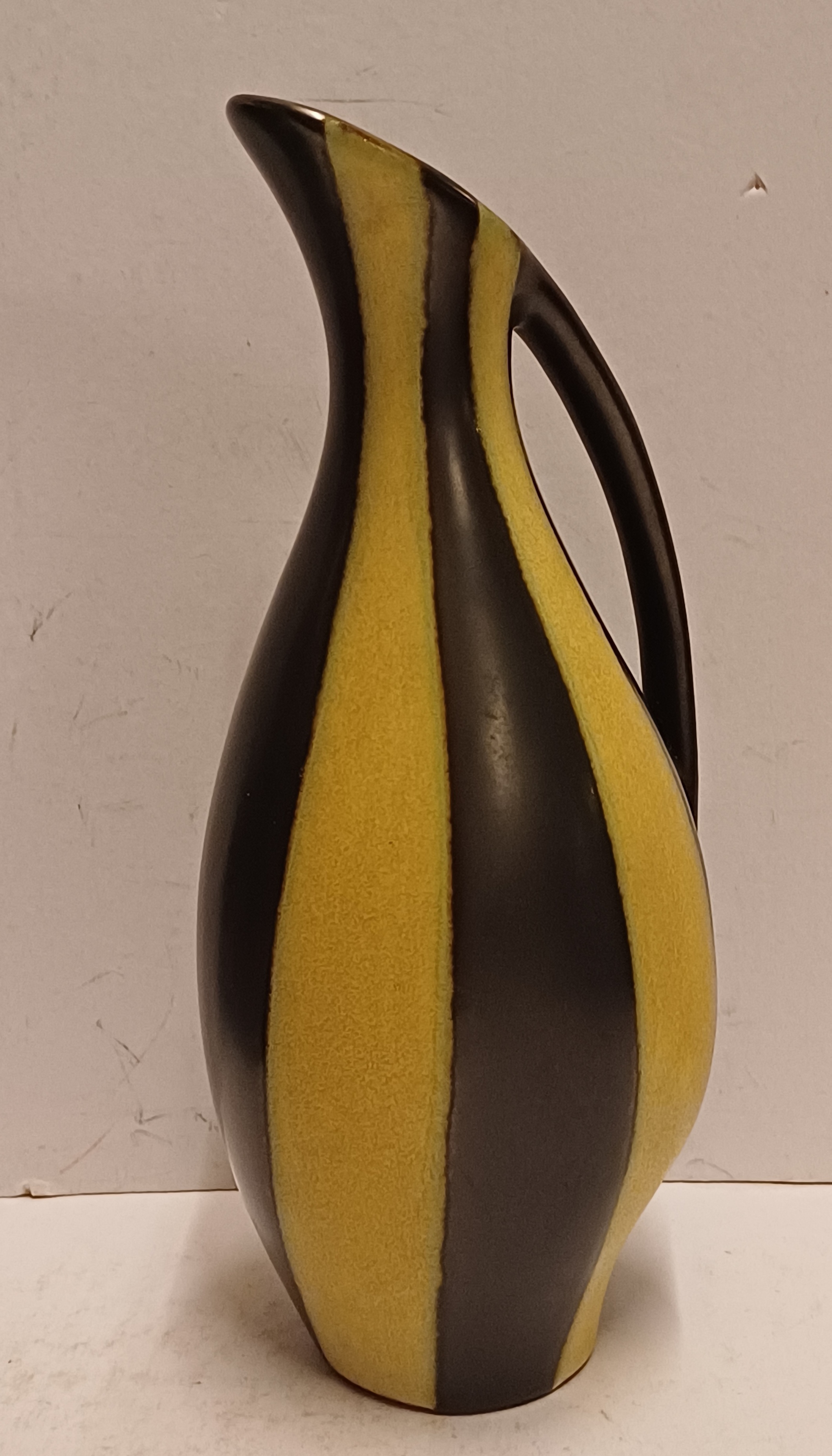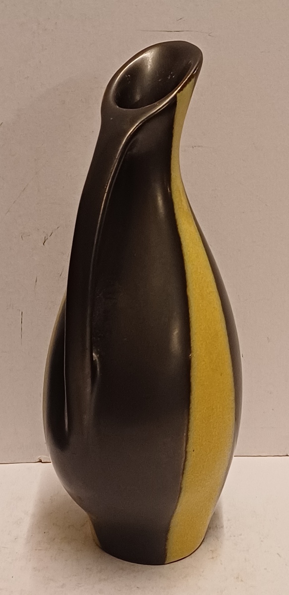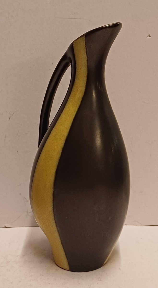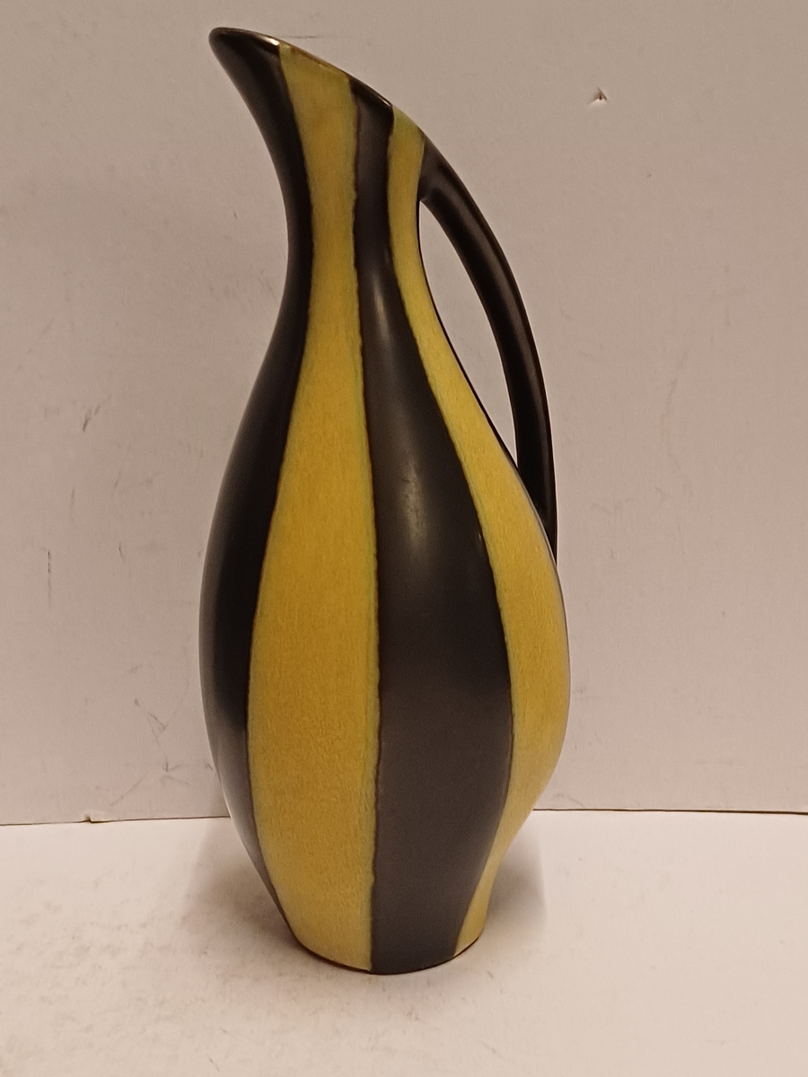 Gegoten aardewerken sierkan met gele en zwarte glazuur. Onderzijde met signatuur en modelnummer.