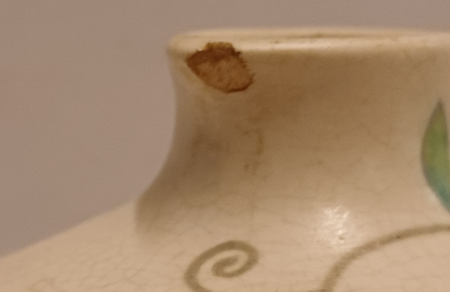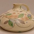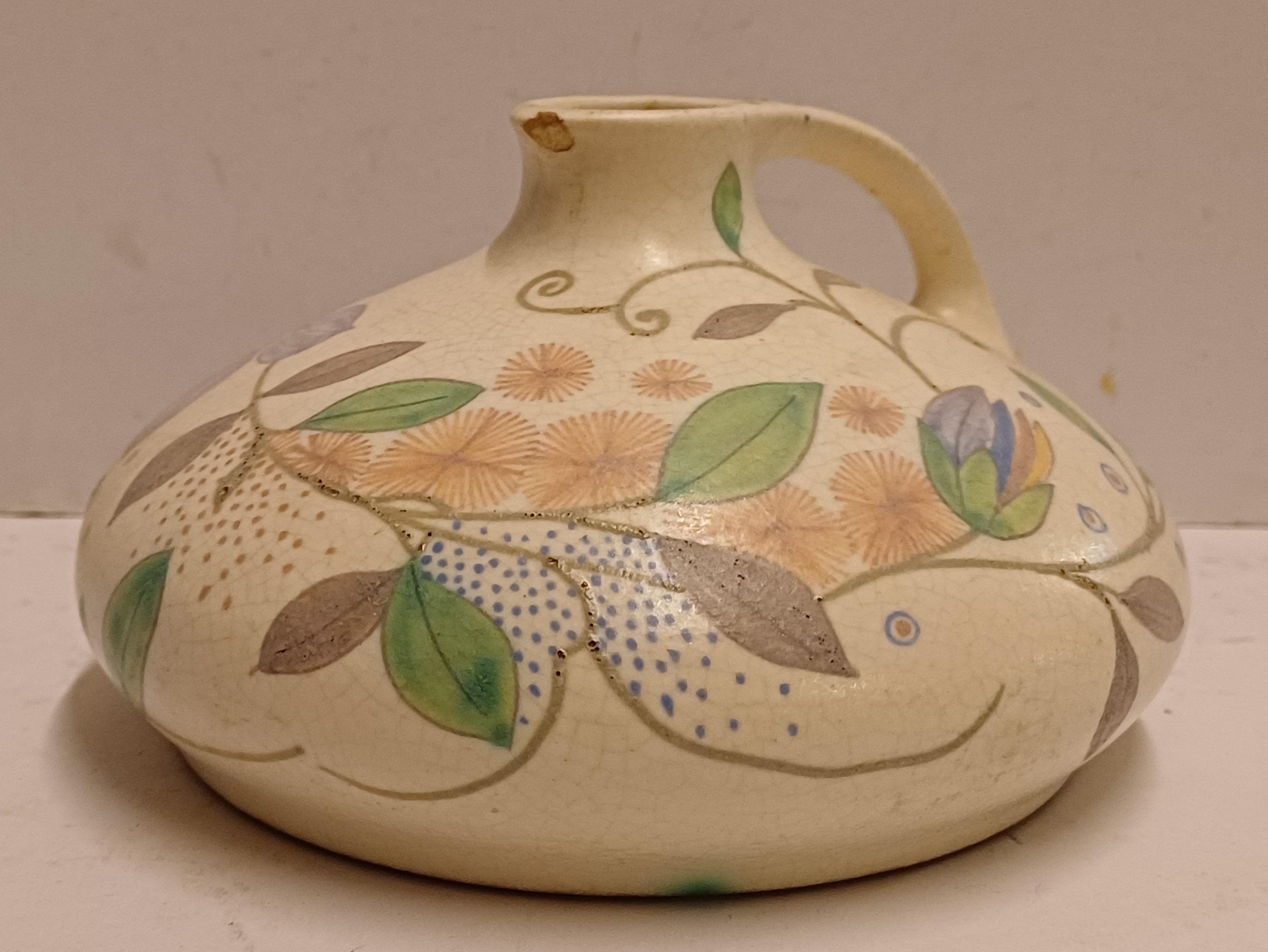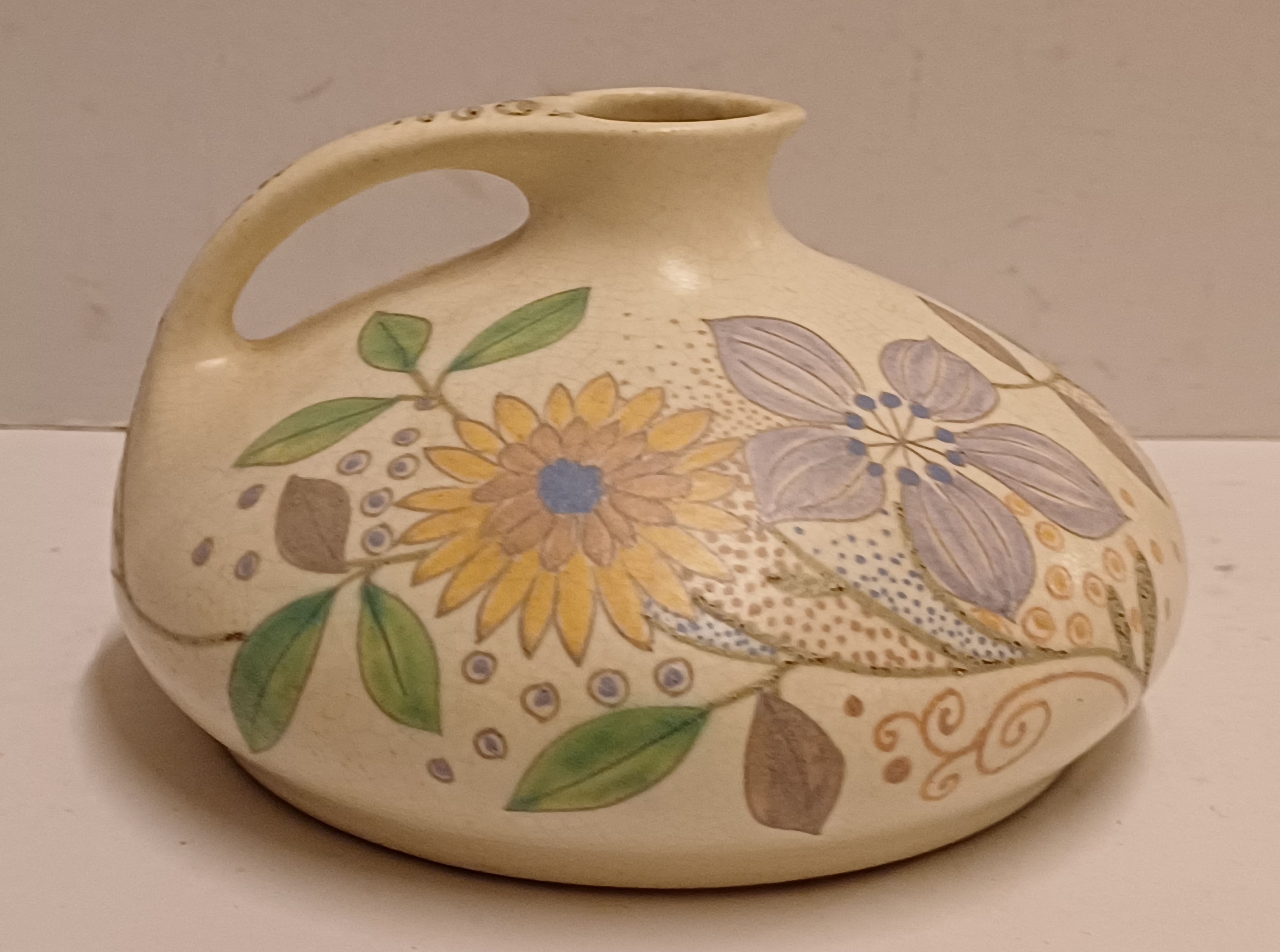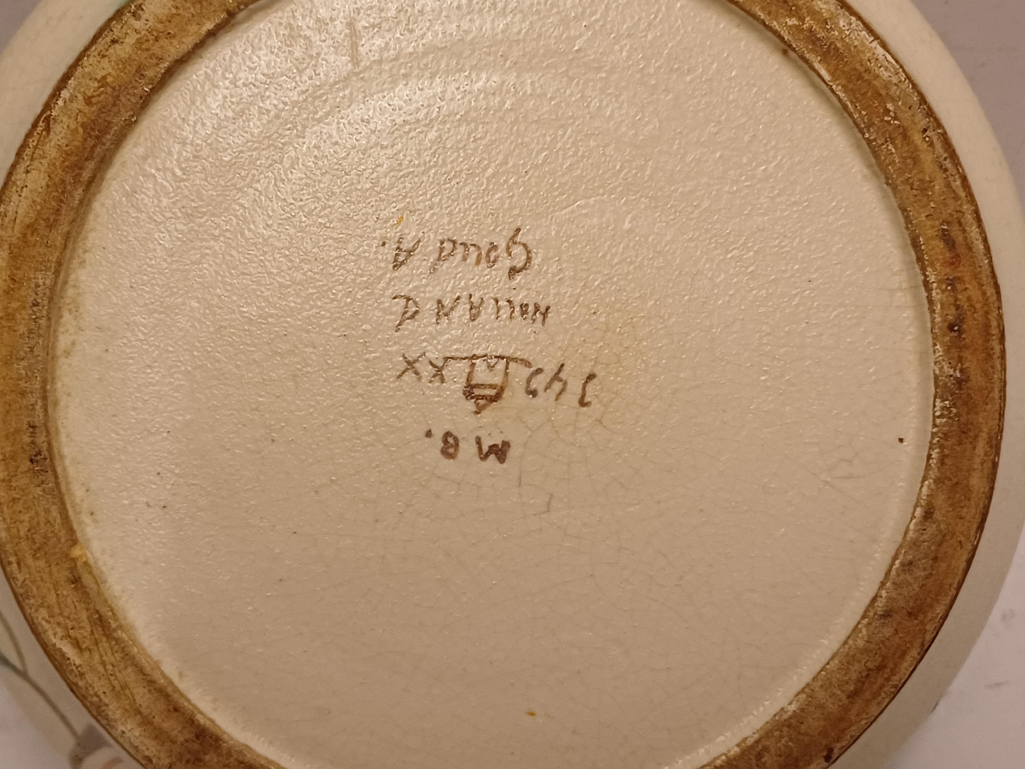 Platelen platte sierkan met decoratie M.B. (Mat Bloemen) op creme fond. Onderzijde met fabrieksmerk en decornaam.