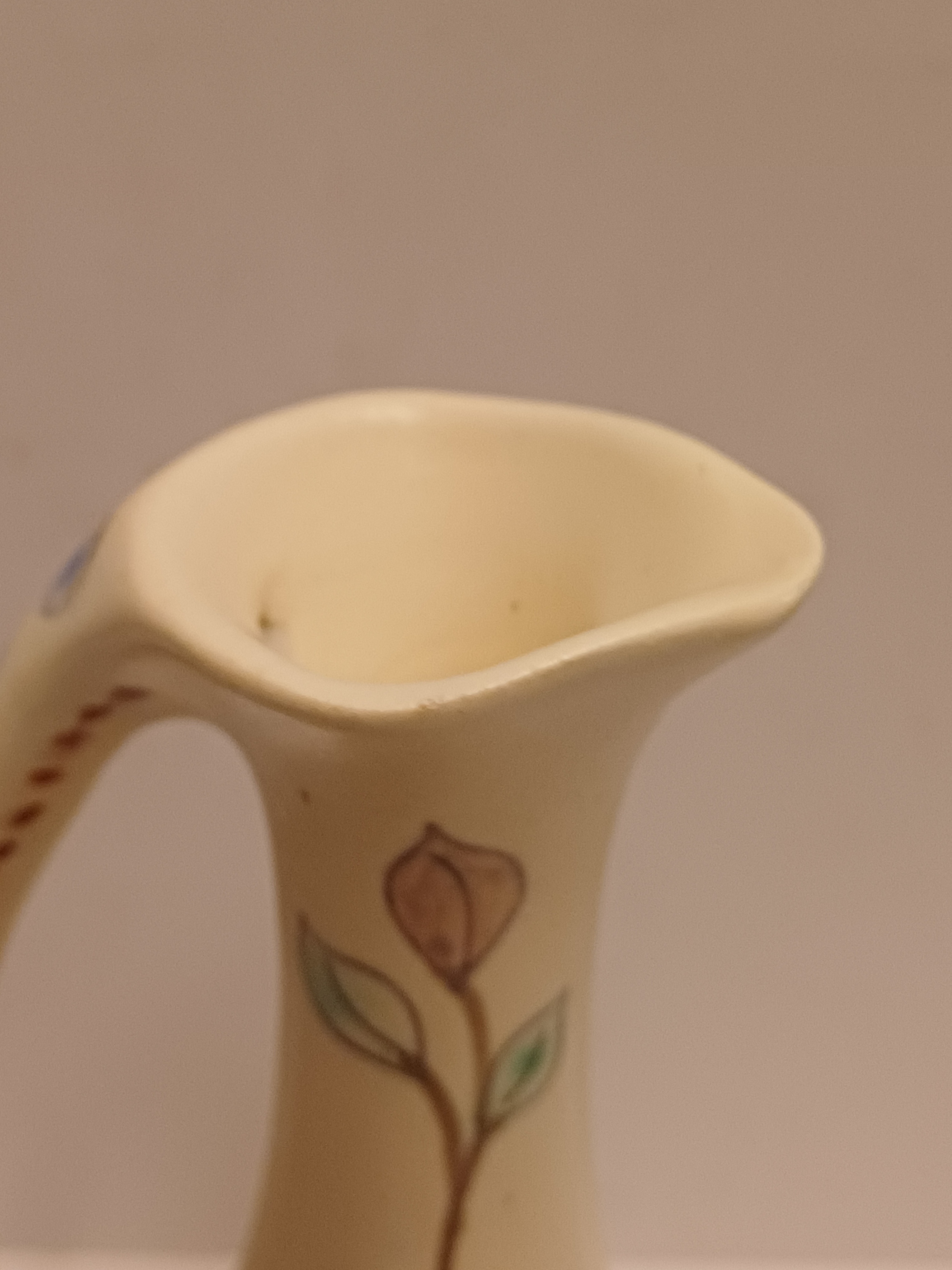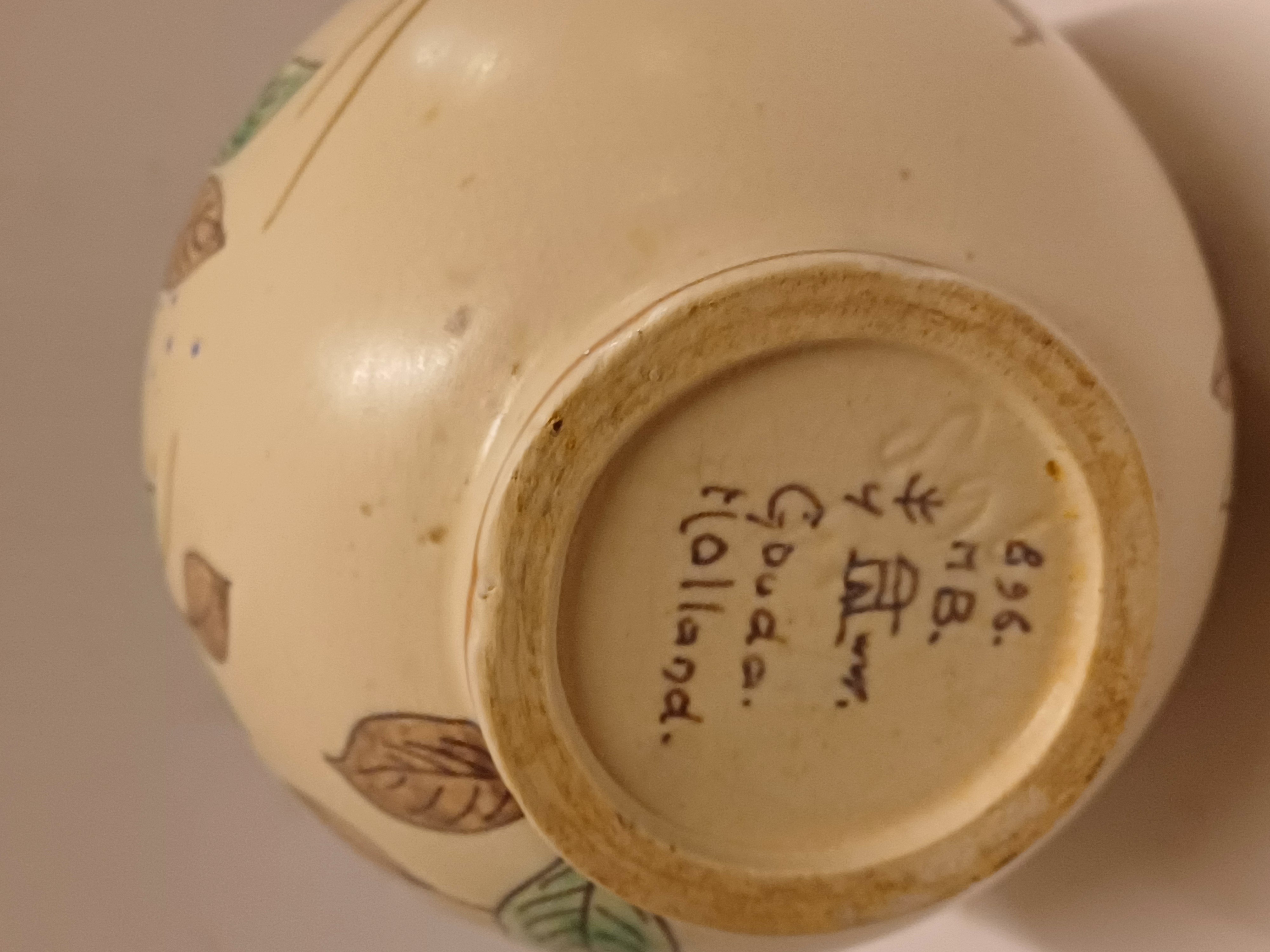 Platelen sierkan met decoratie M.B. (Mat Bloemen) op creme fond. Onderzijde met fabrieksmerk en decornaam.