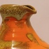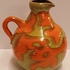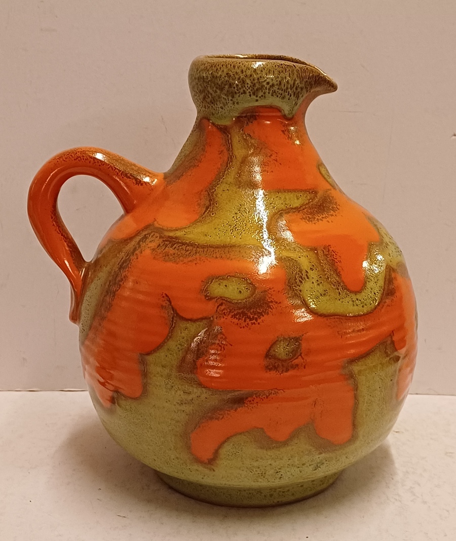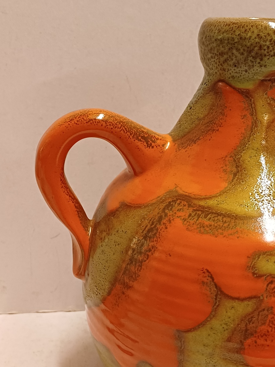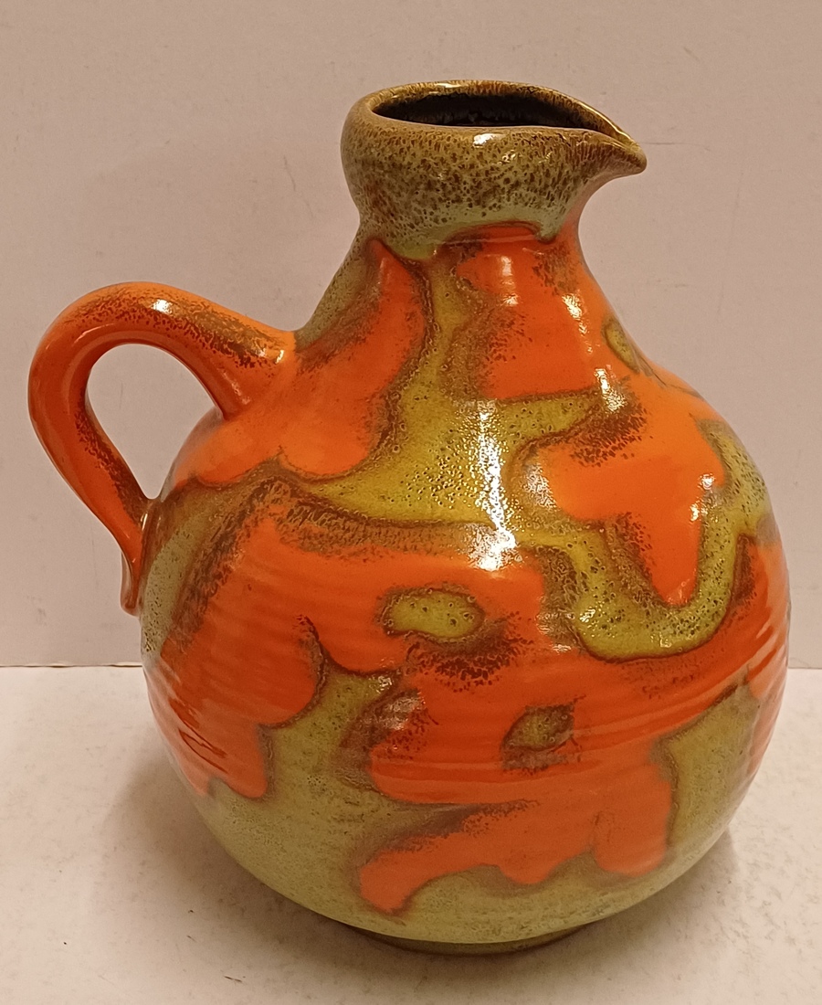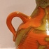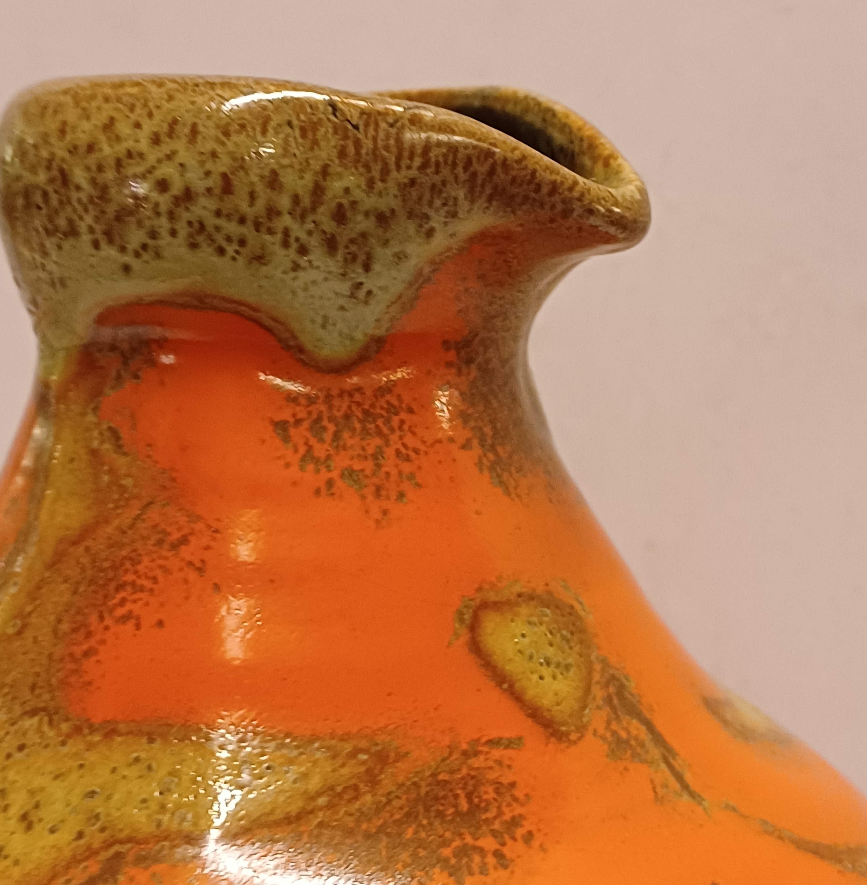 Grote sierkan met gevlamde oranje muvelee glazuur op lichtbruin fond. Onderzijde met fabrieksmerk.