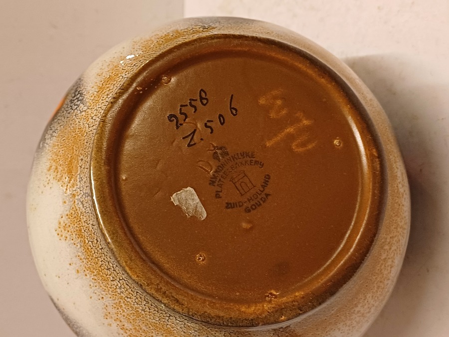 Sierkan met Muvelee decor in oranje. Onderzijde met signatuur en coderingen.