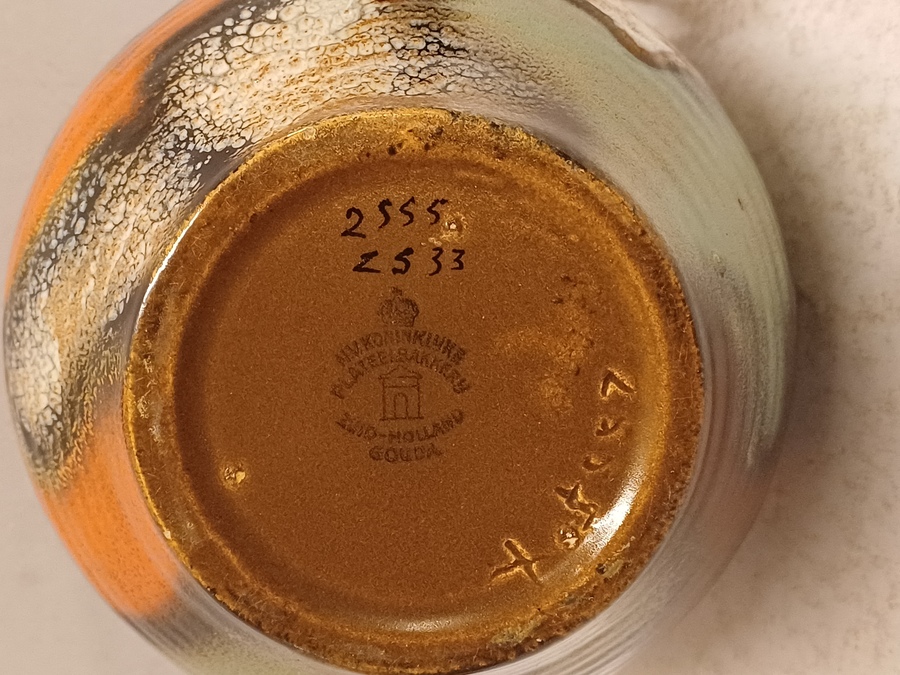Sierkan met Muvelee decor in oranje. Onderzijde met signatuur en coderingen.