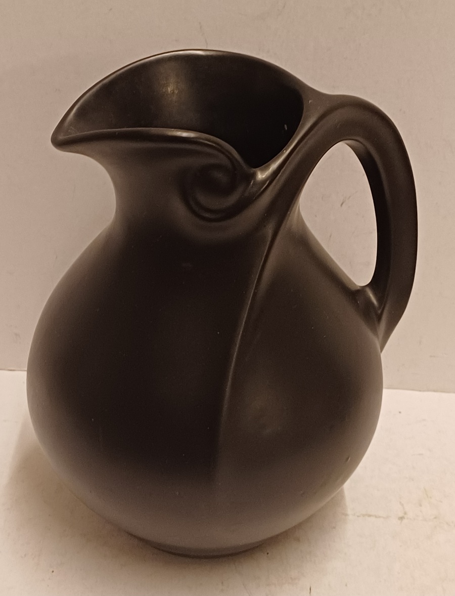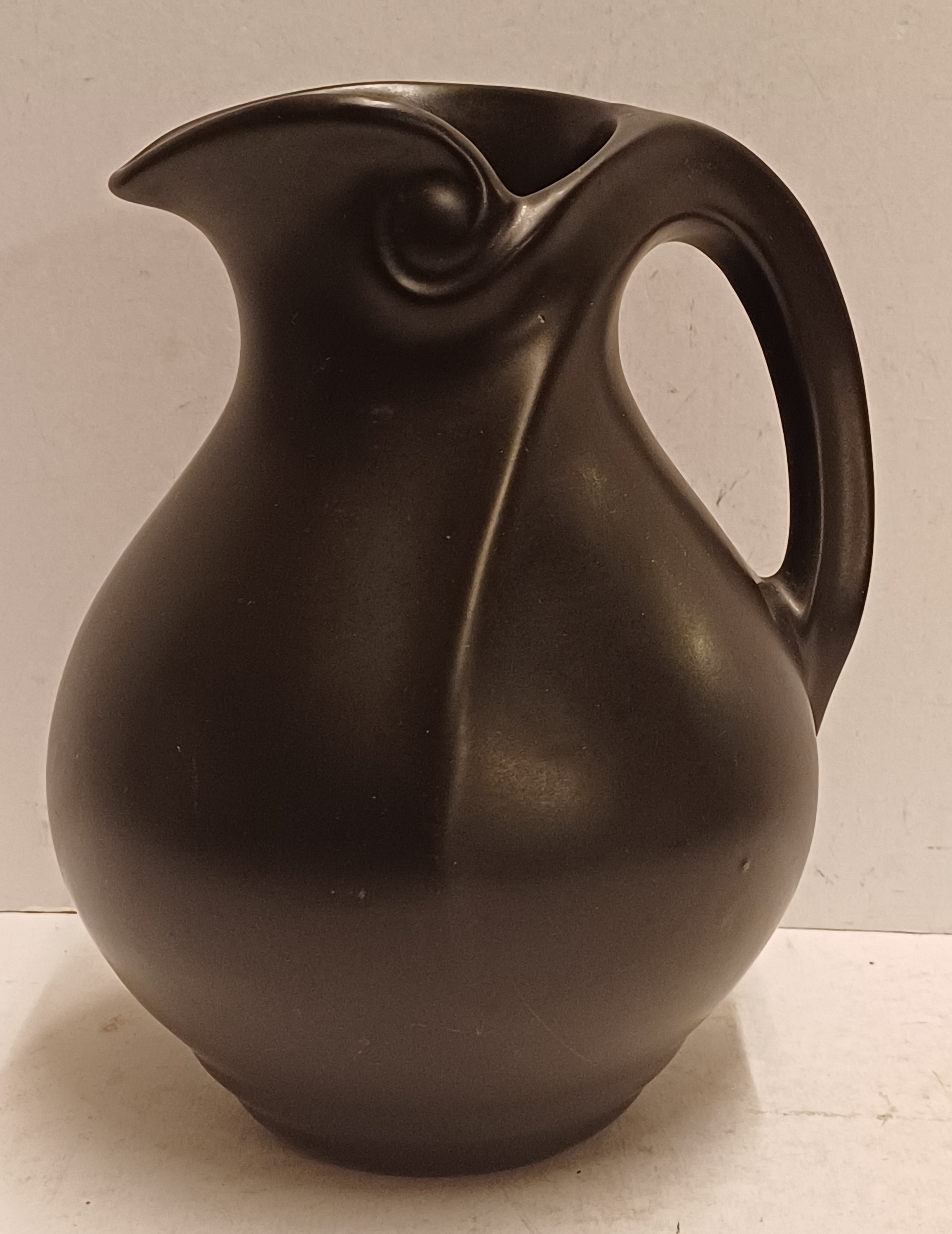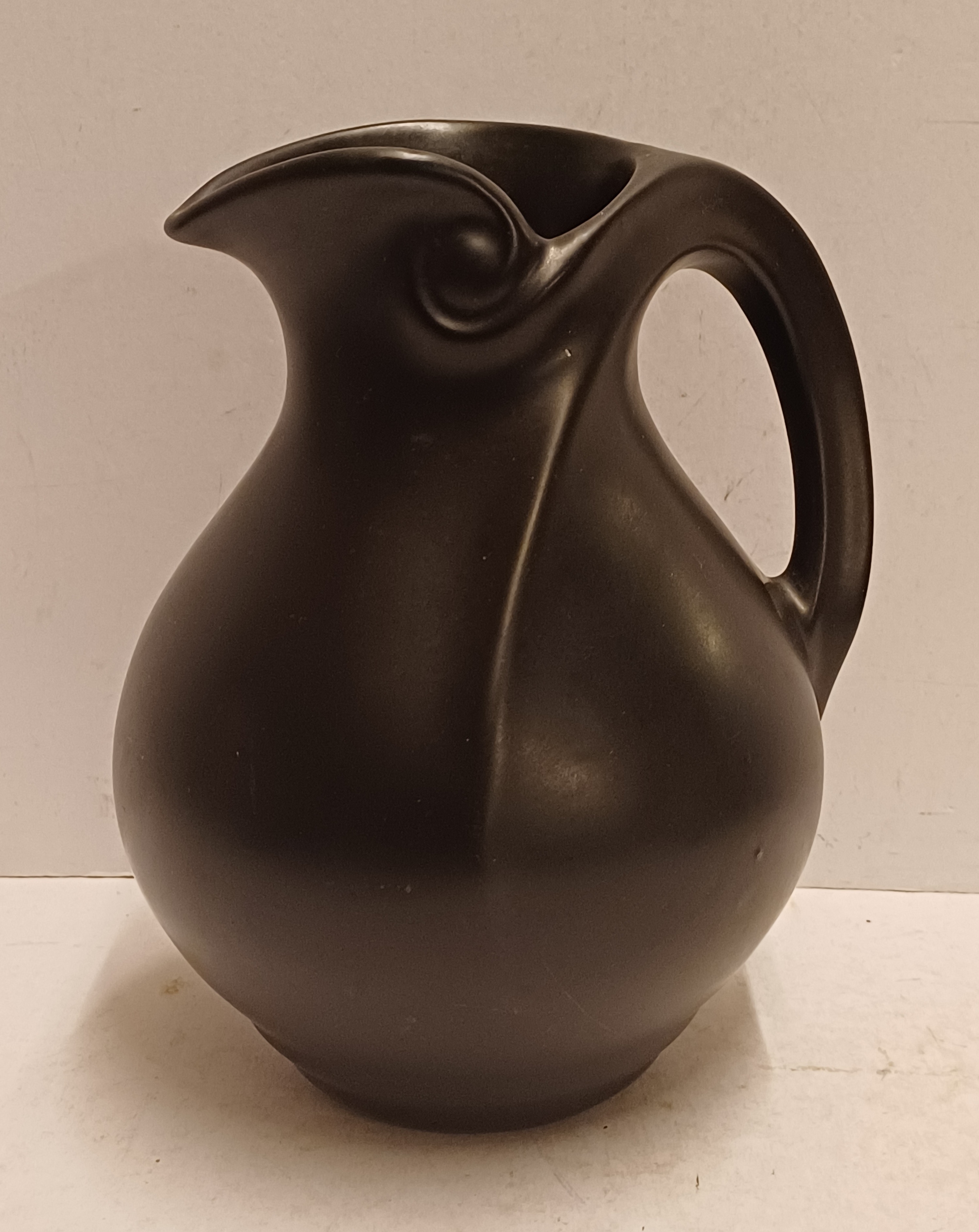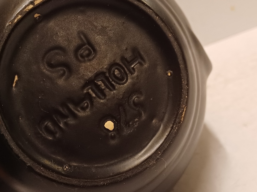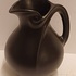 Gegoten zwart geglazuurde sierkan met grillige decoratie. Ontwerp Frans van Katwijk, uitvoering Plateelbakkerij Schoonhoven.