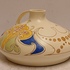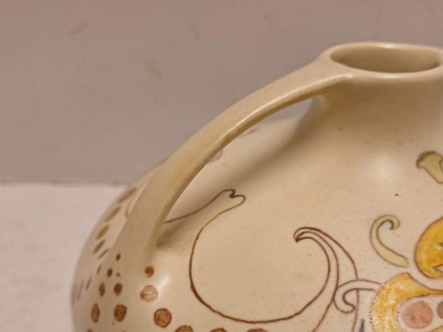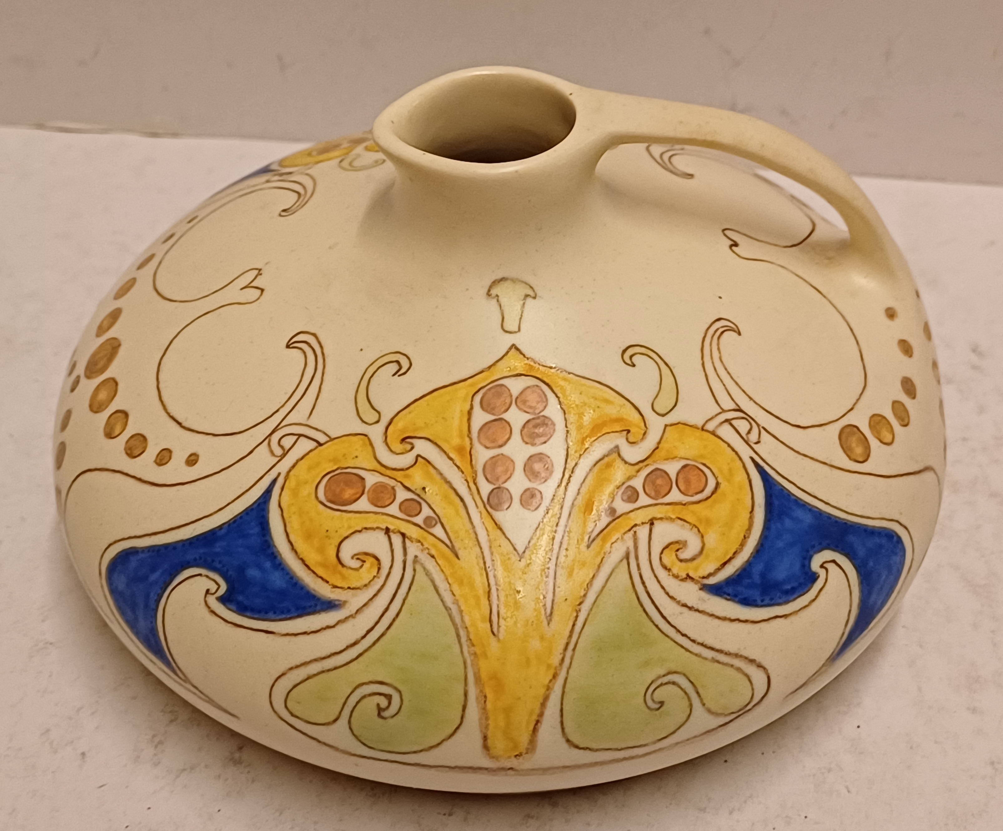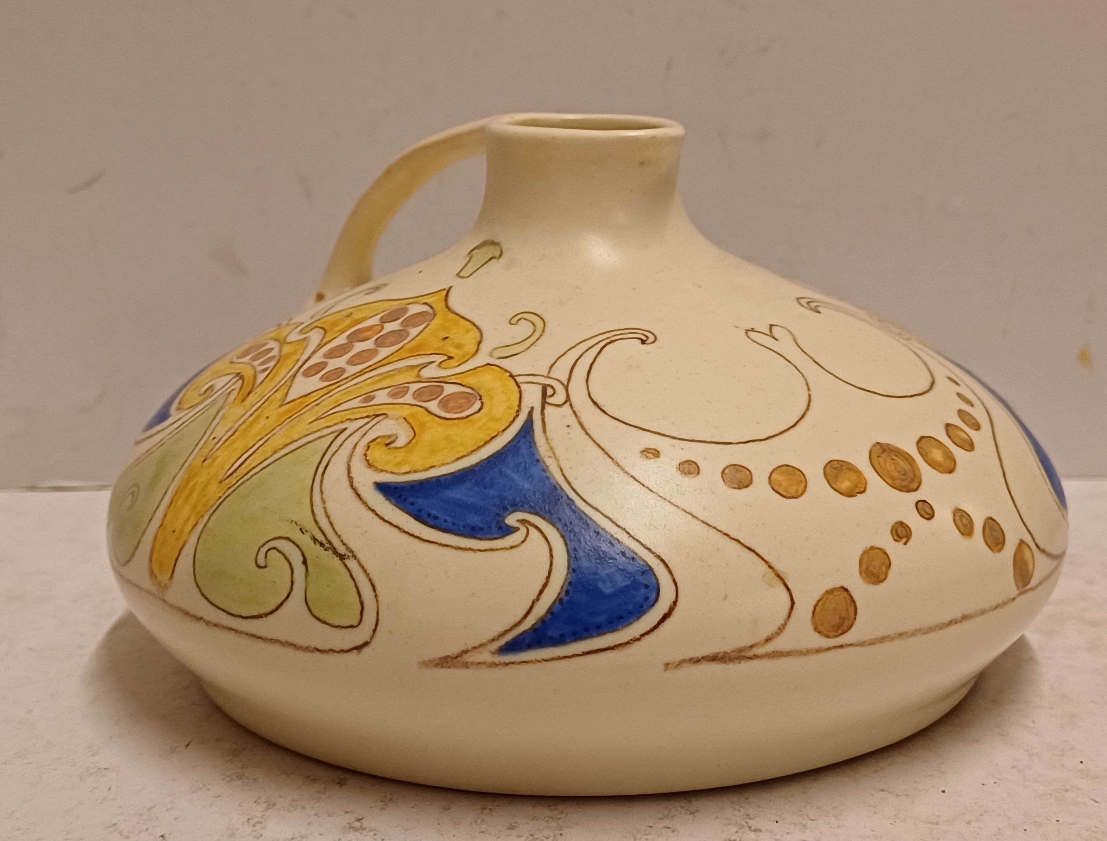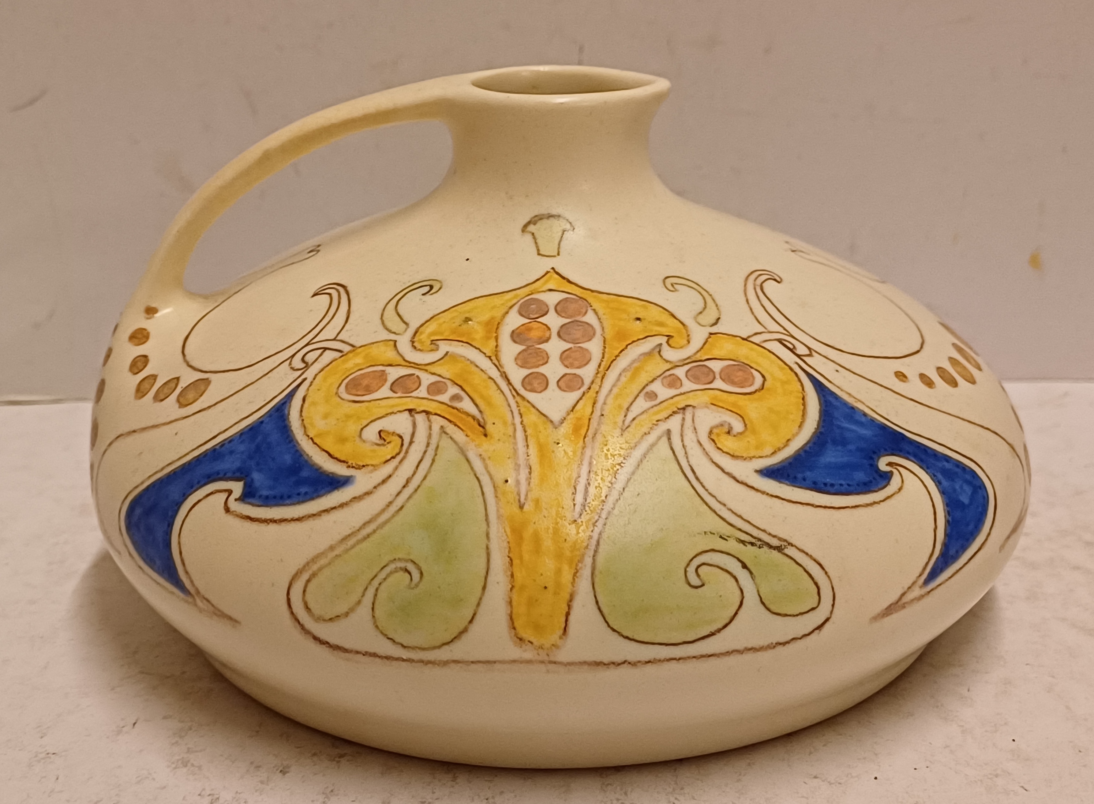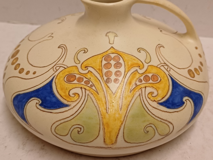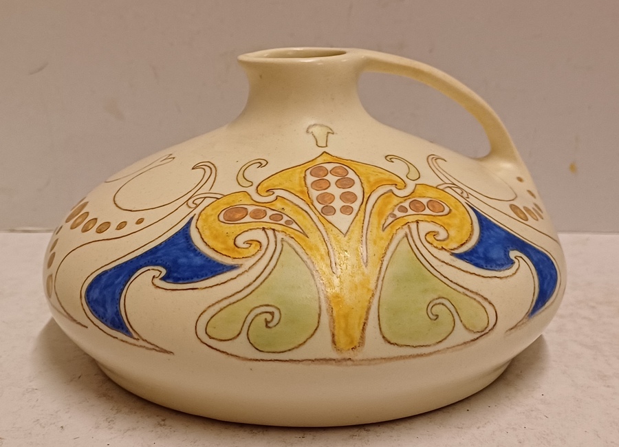 Aardwerken gegoten sierkan met gestileerd lineair decor op creme fond. Onderzijde met geschilderd fabrieksmerk.
