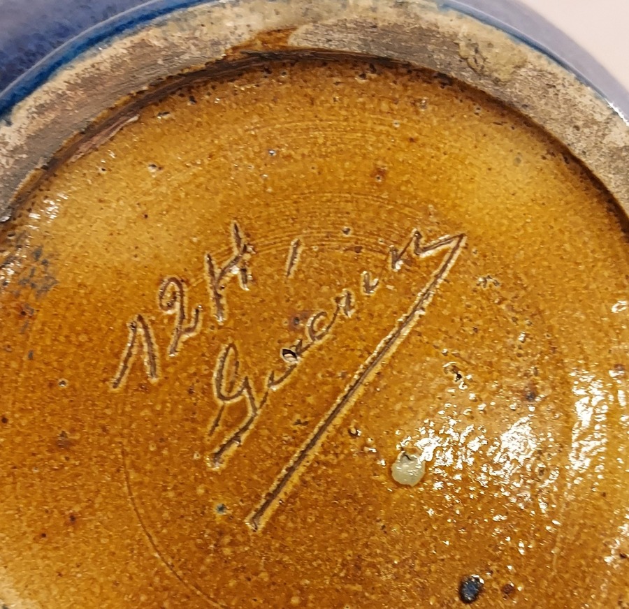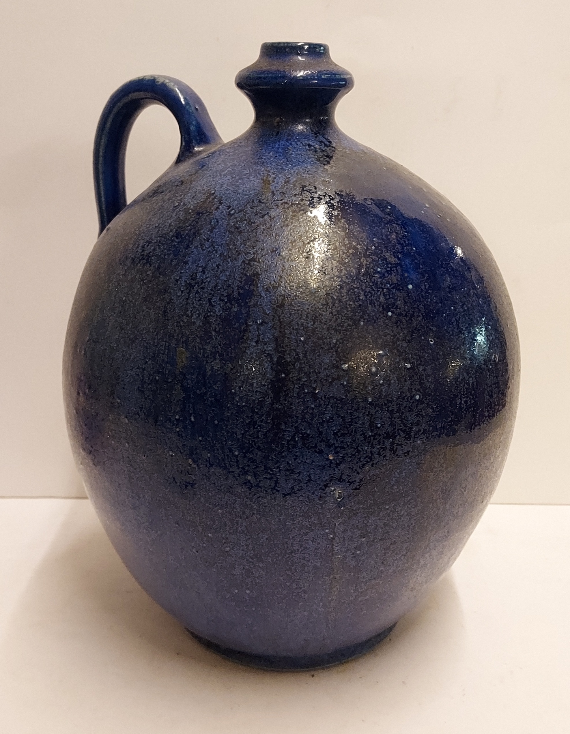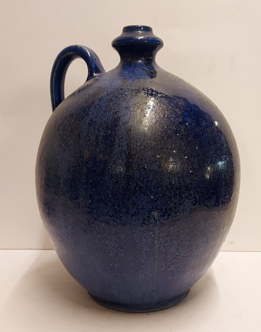Bulbous vase with handle, with dark blue glaze. Bottom with signature and model number.