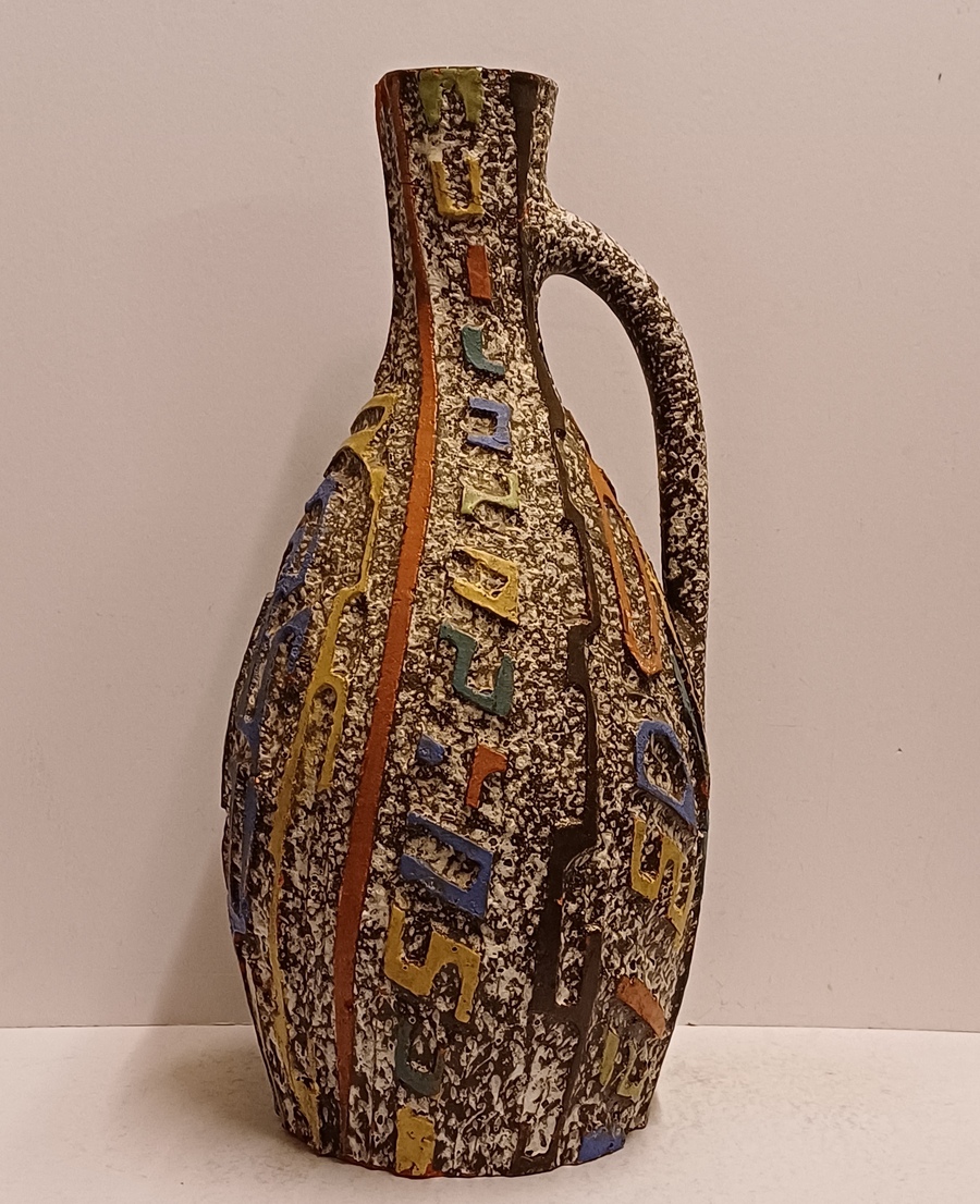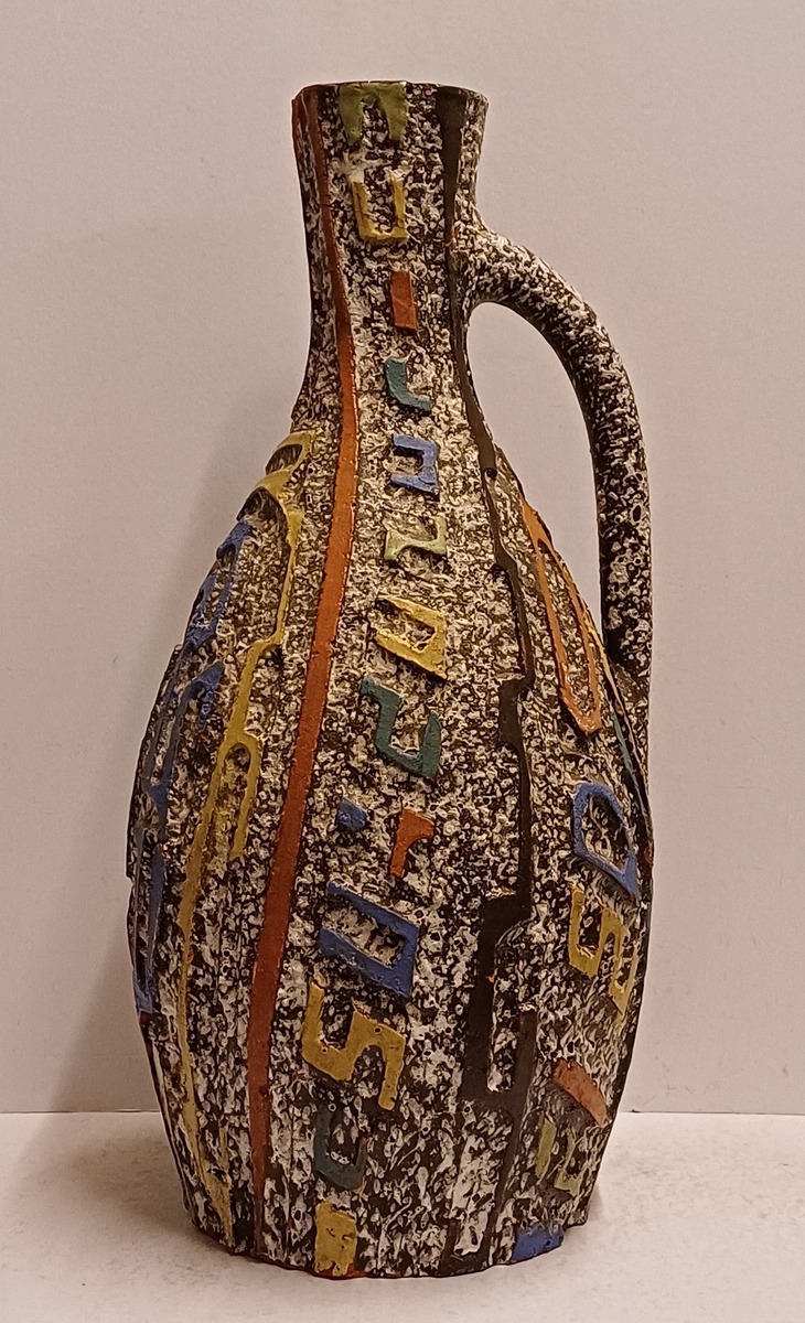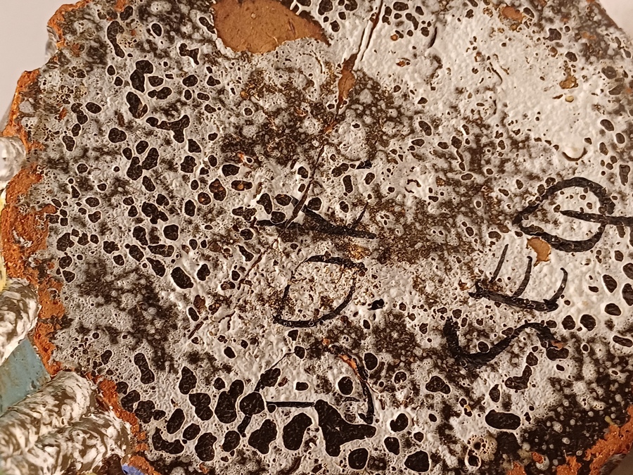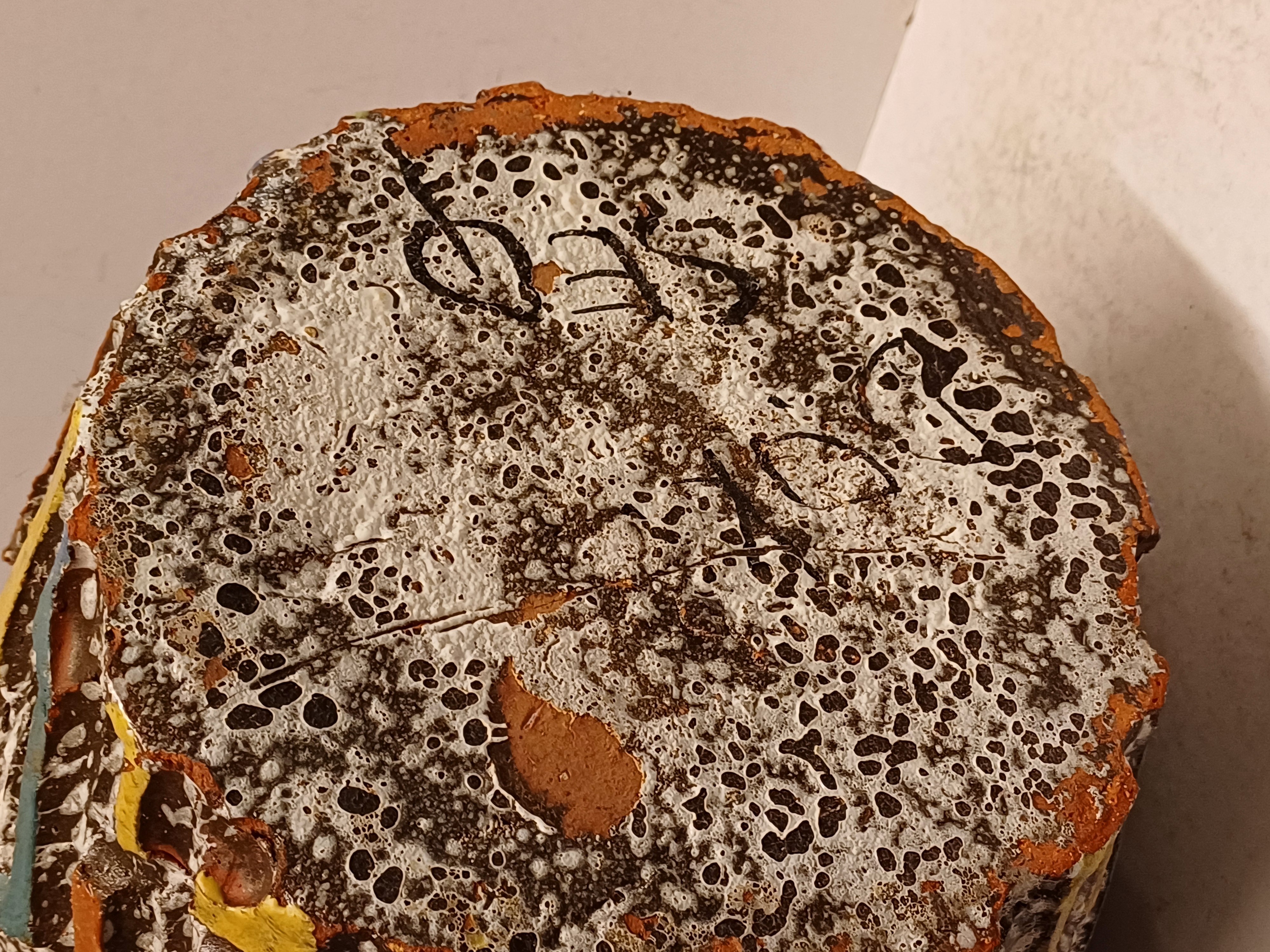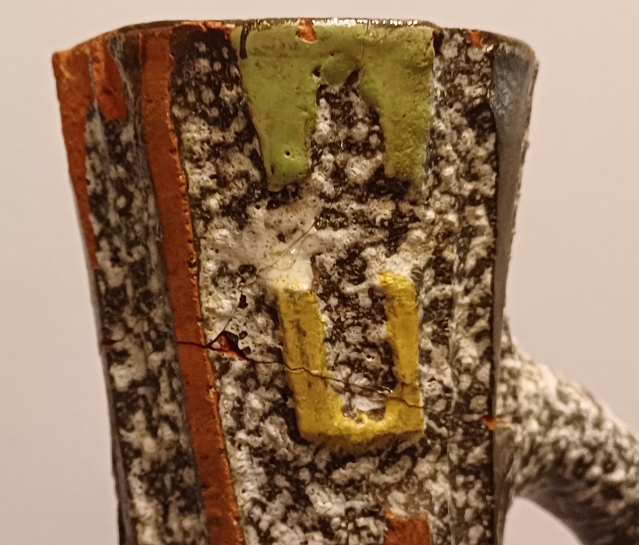 Aardewerken kan met uitgesneden decor met meerkleurige glazuur. Zogenaamd Sequoia aardewerk. Onderzijde gesigneerd.