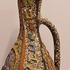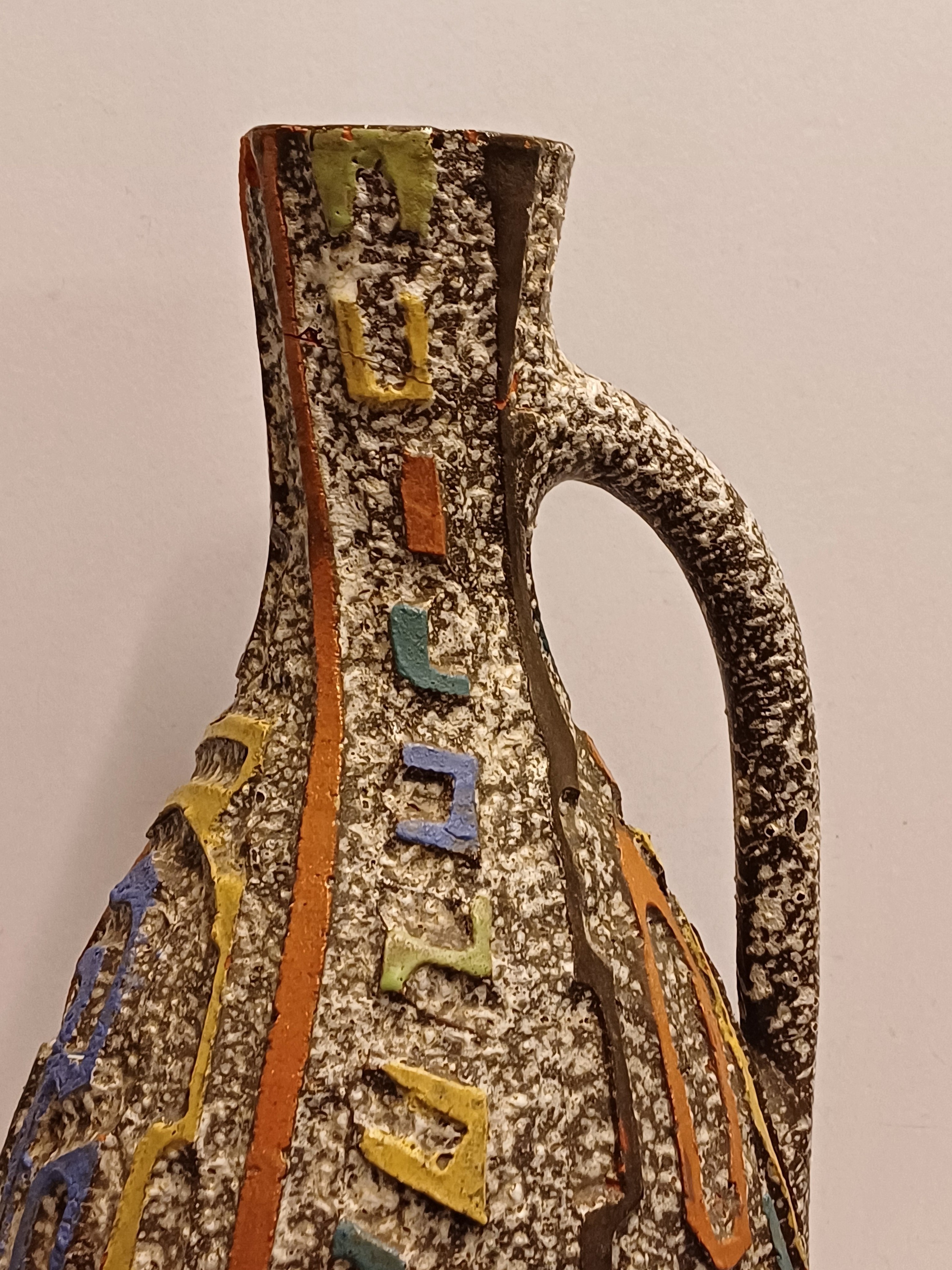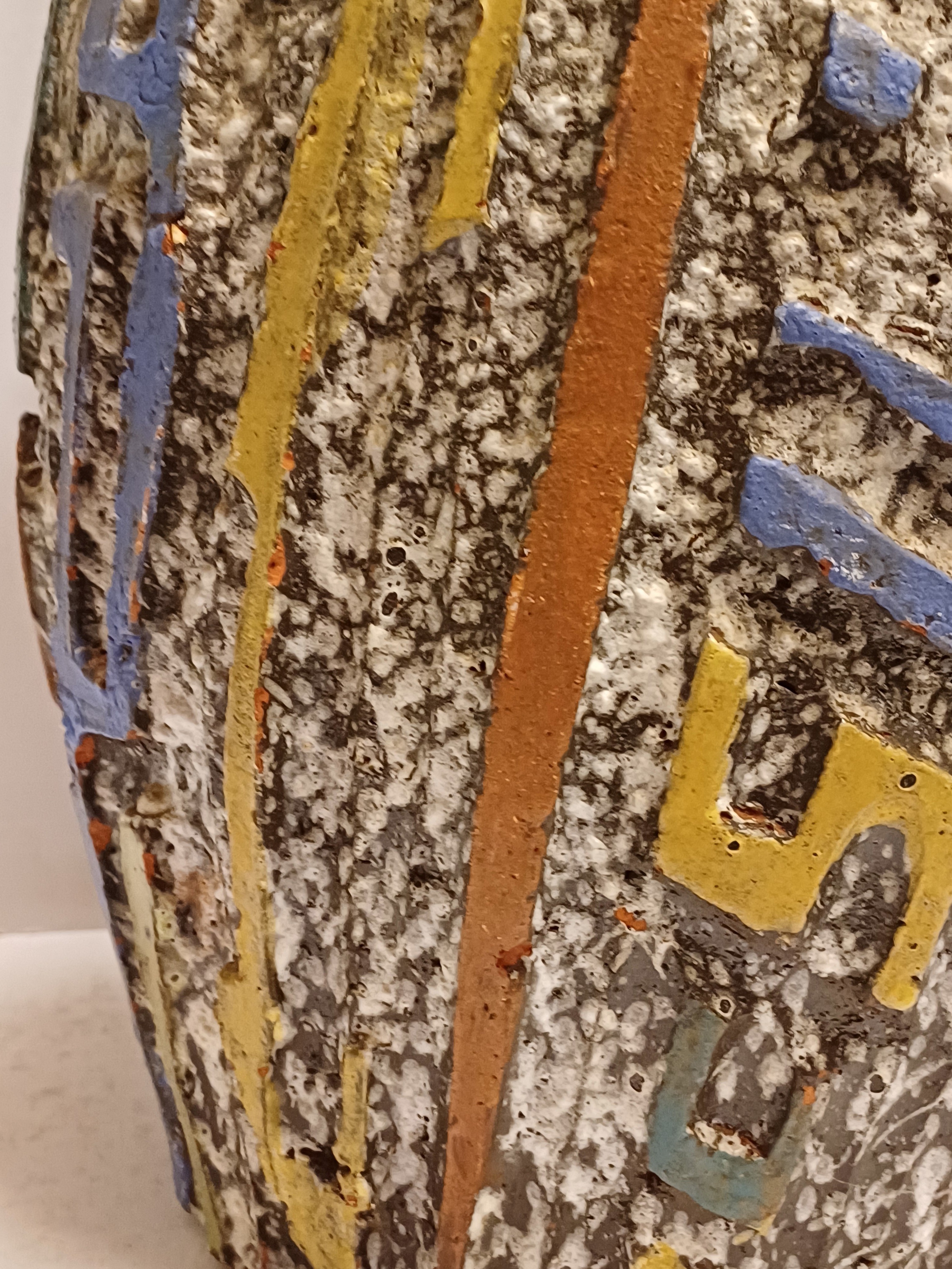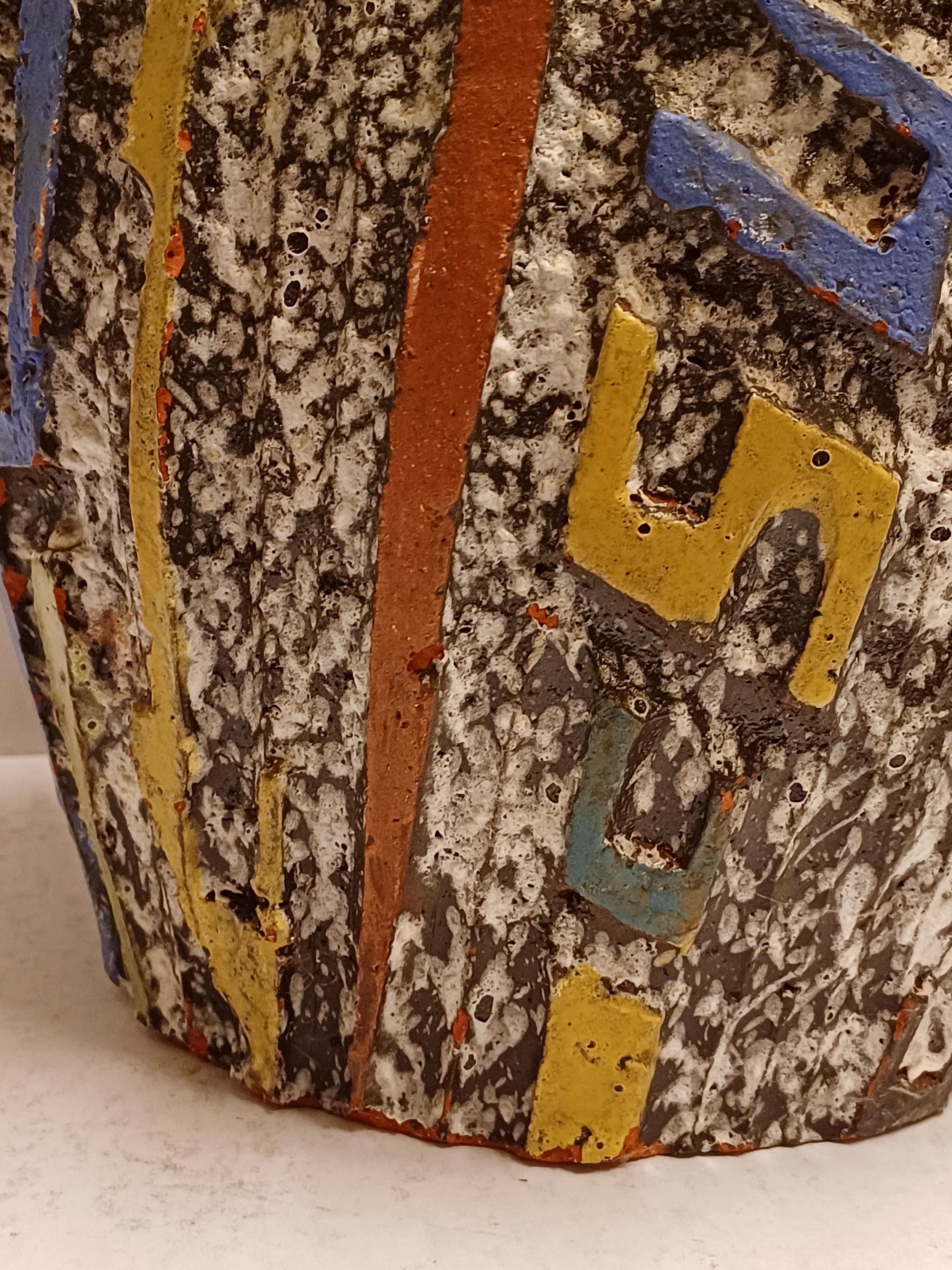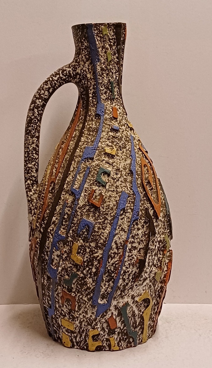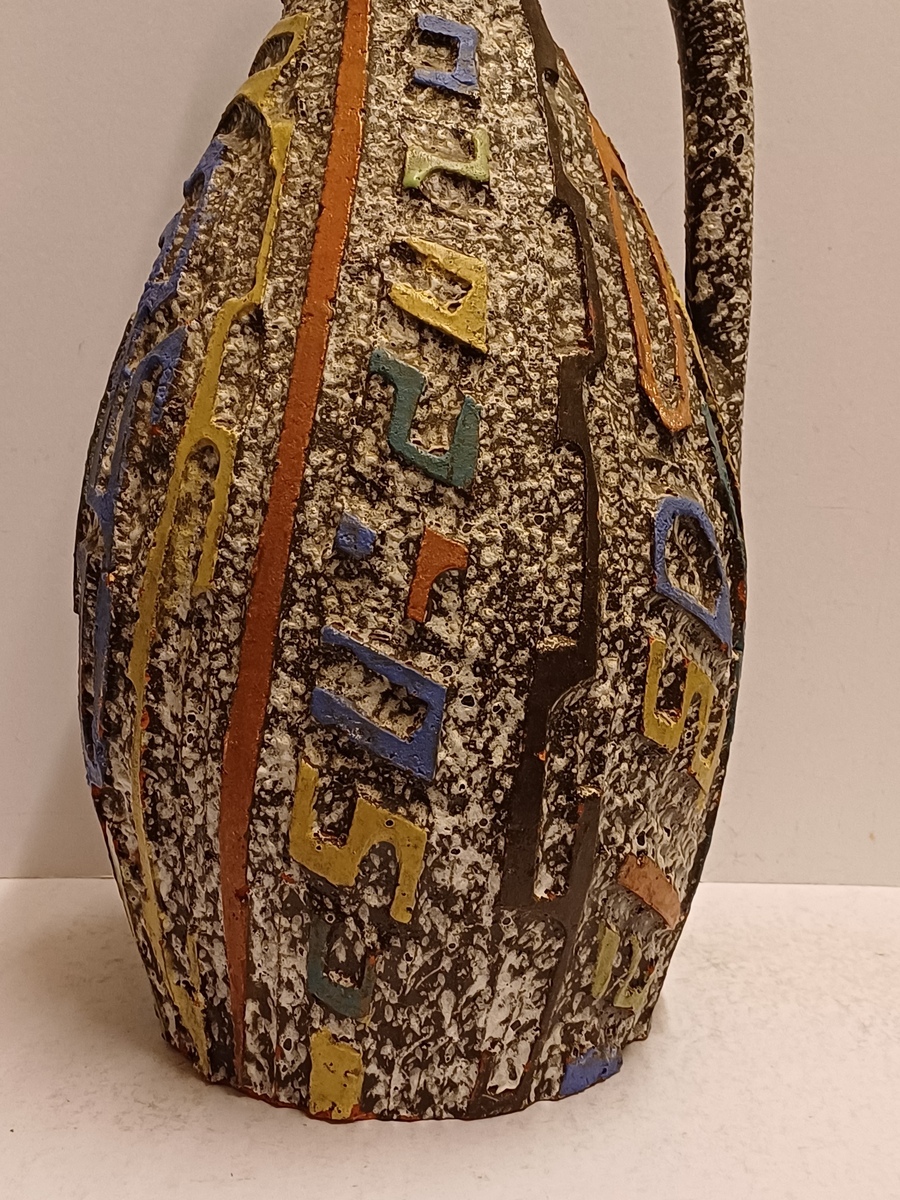 Aardewerken kan met uitgesneden decor met meerkleurige glazuur. Zogenaamd Sequoia aardewerk. Onderzijde gesigneerd.