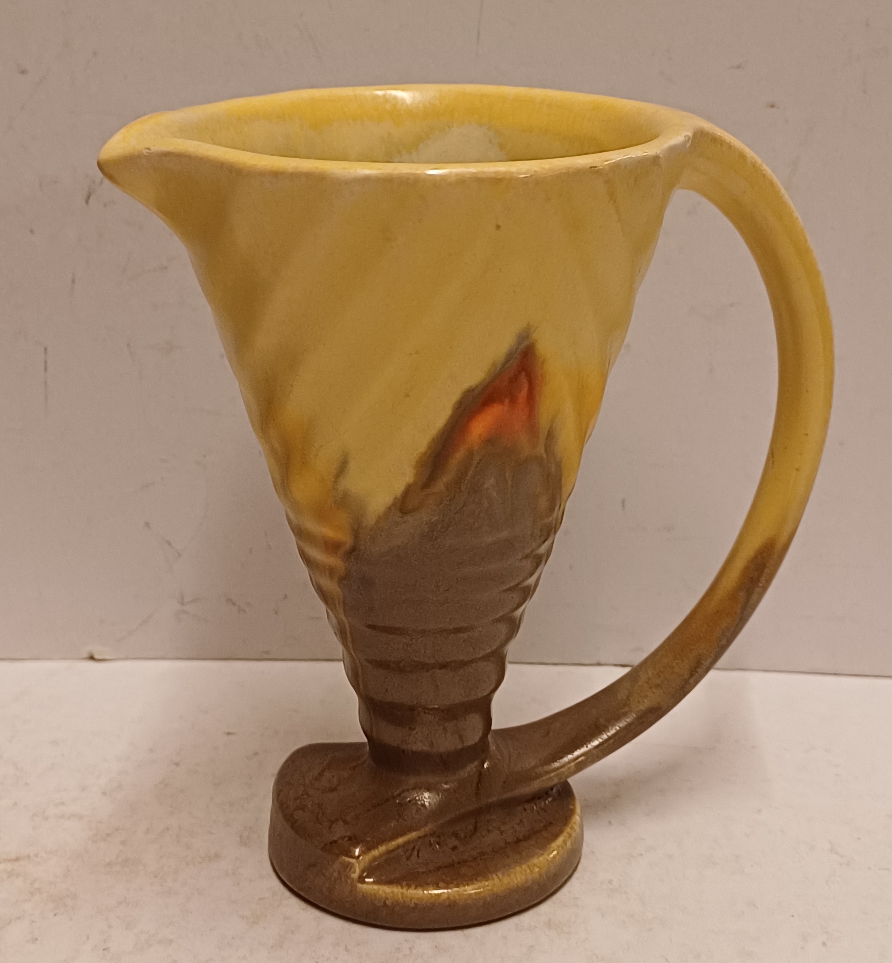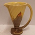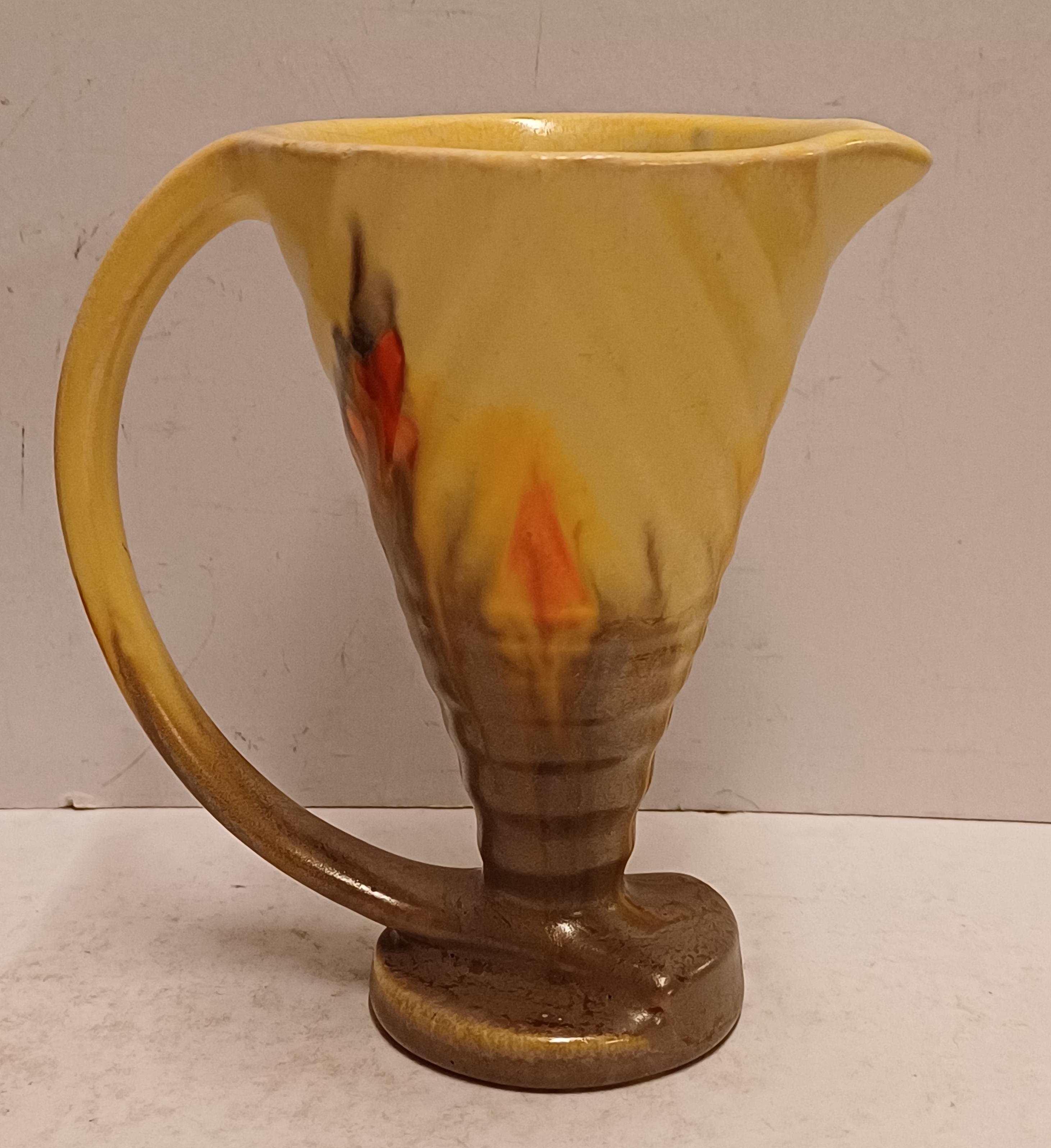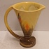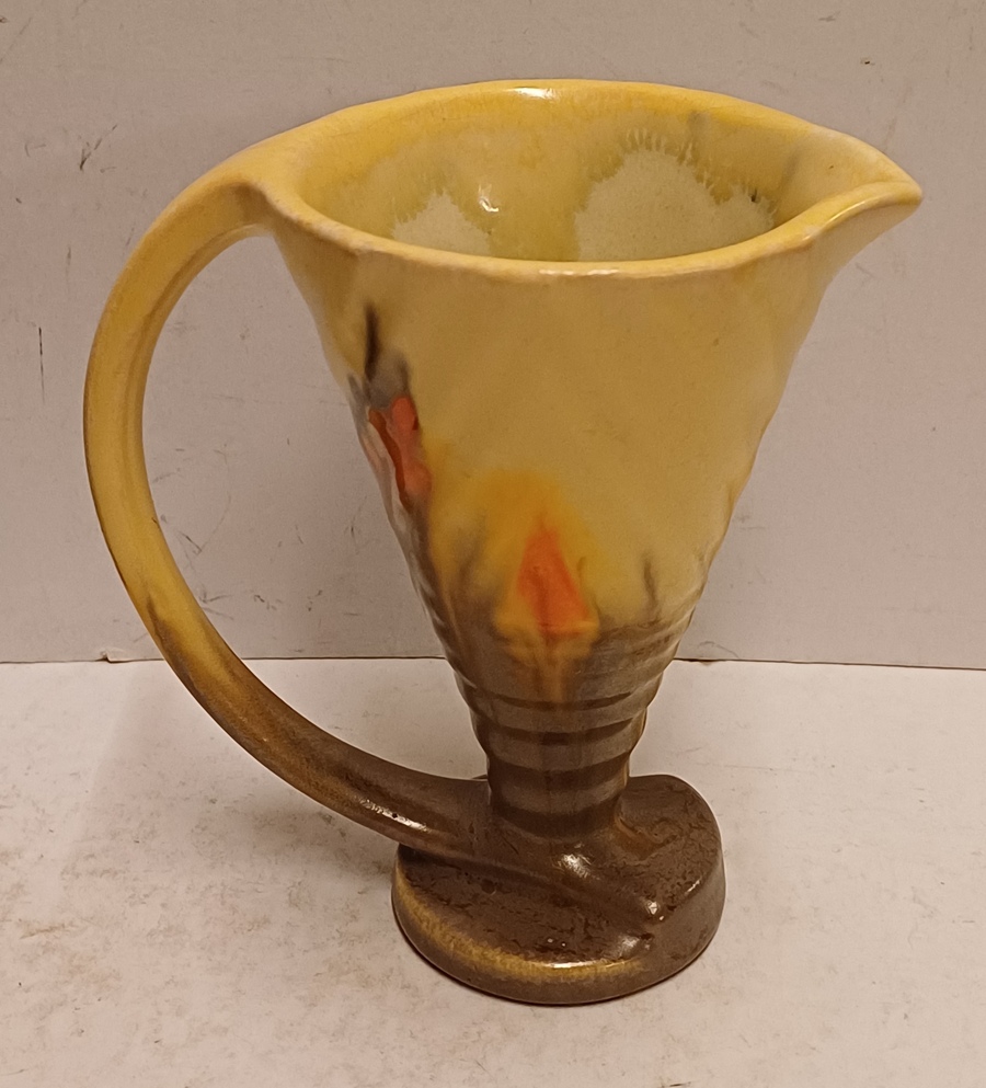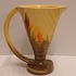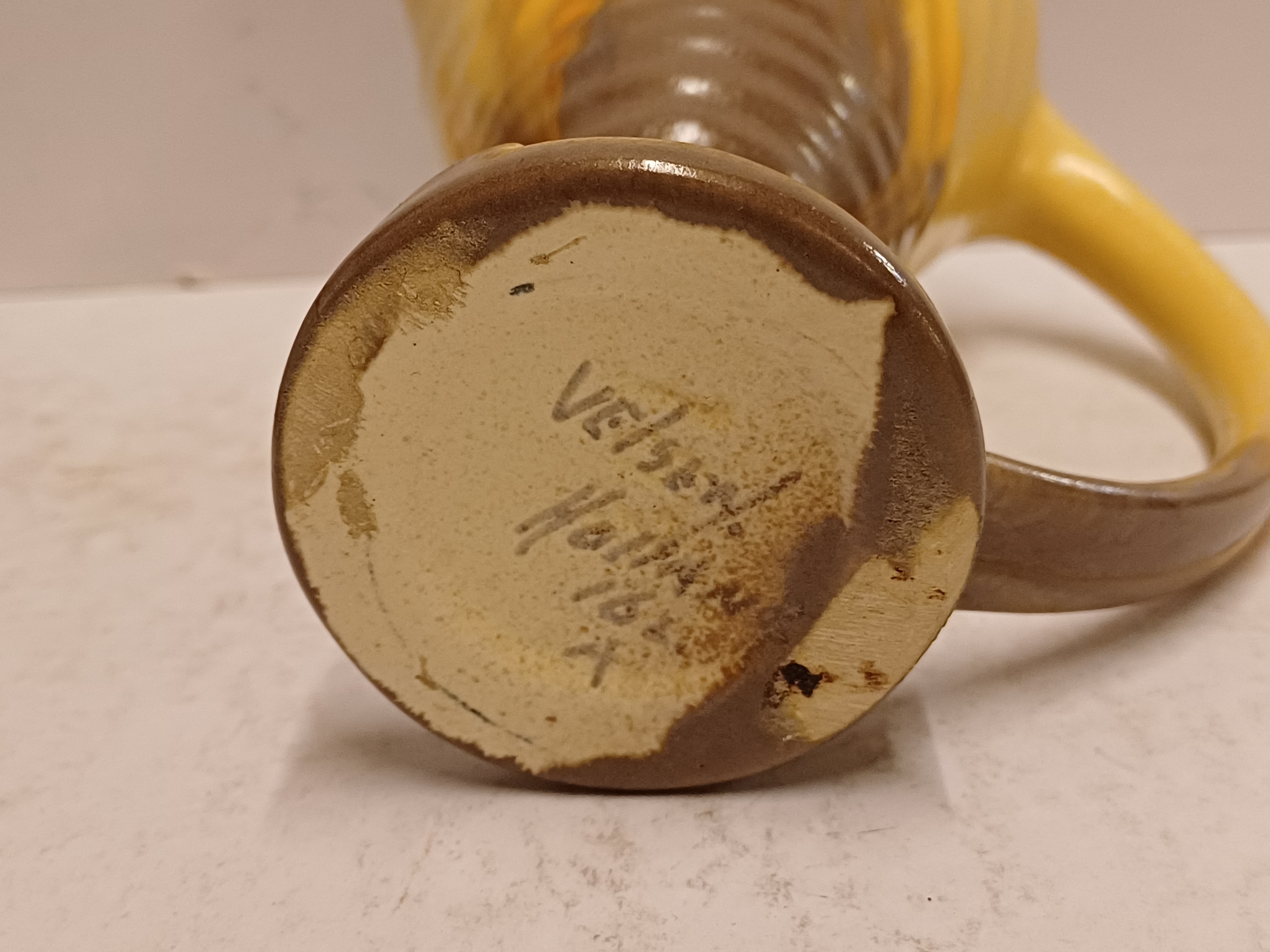 Met spuit glazuur in oker en oranje. Onderzijde gemerkt,.
