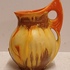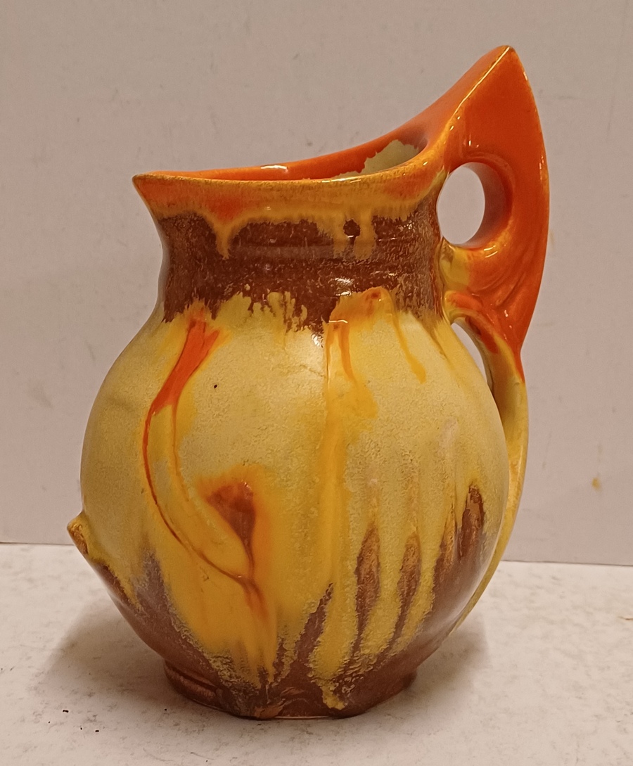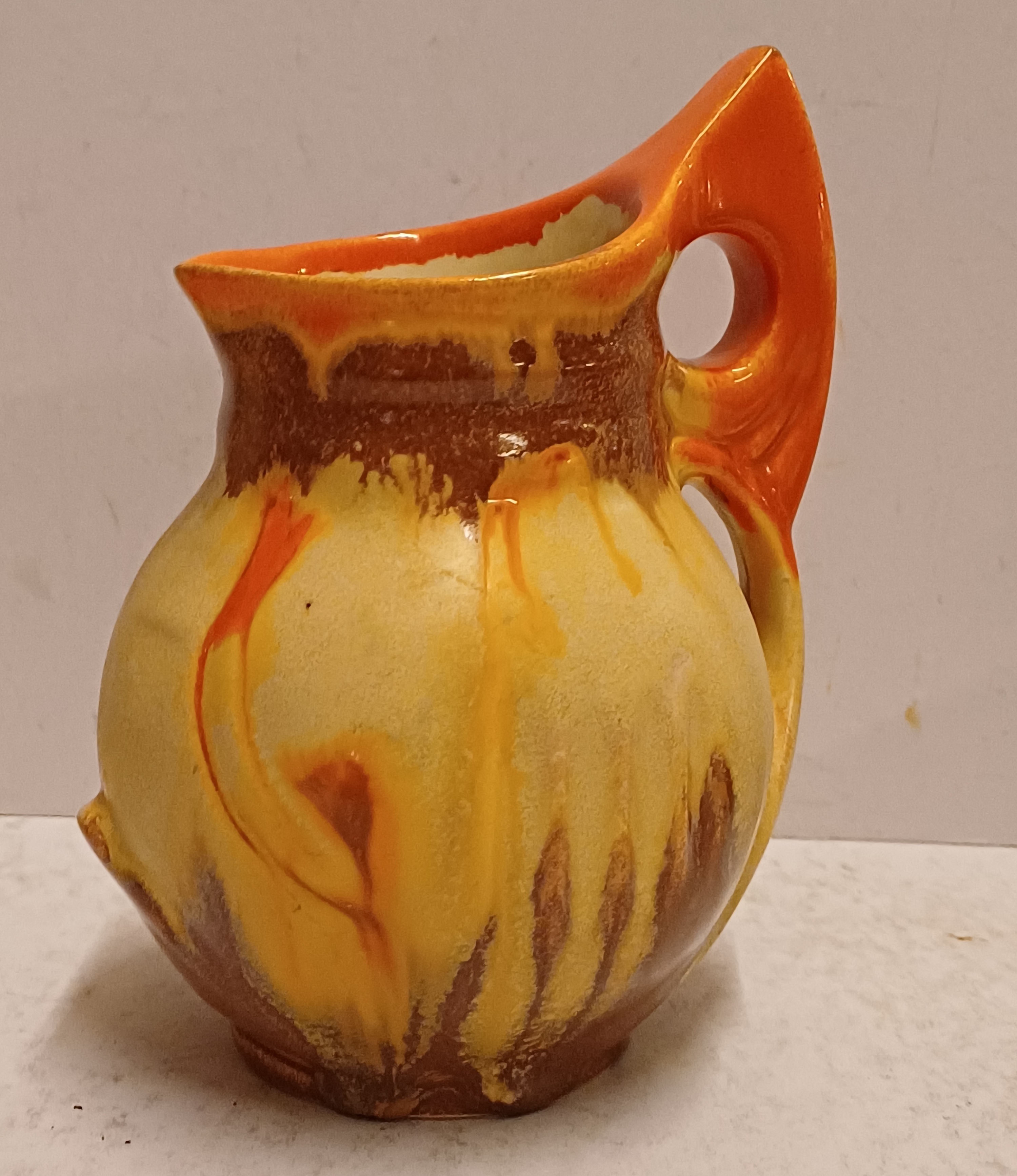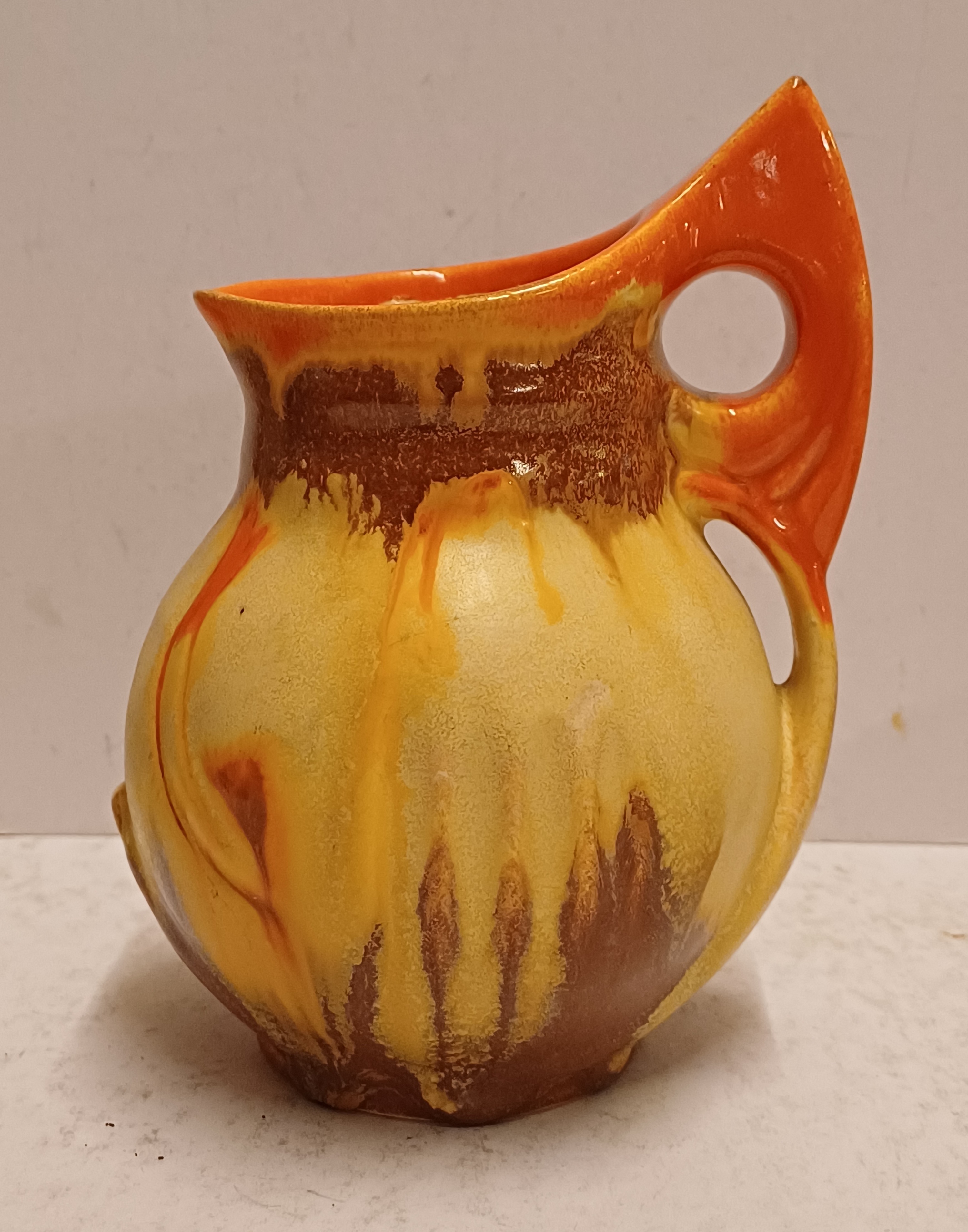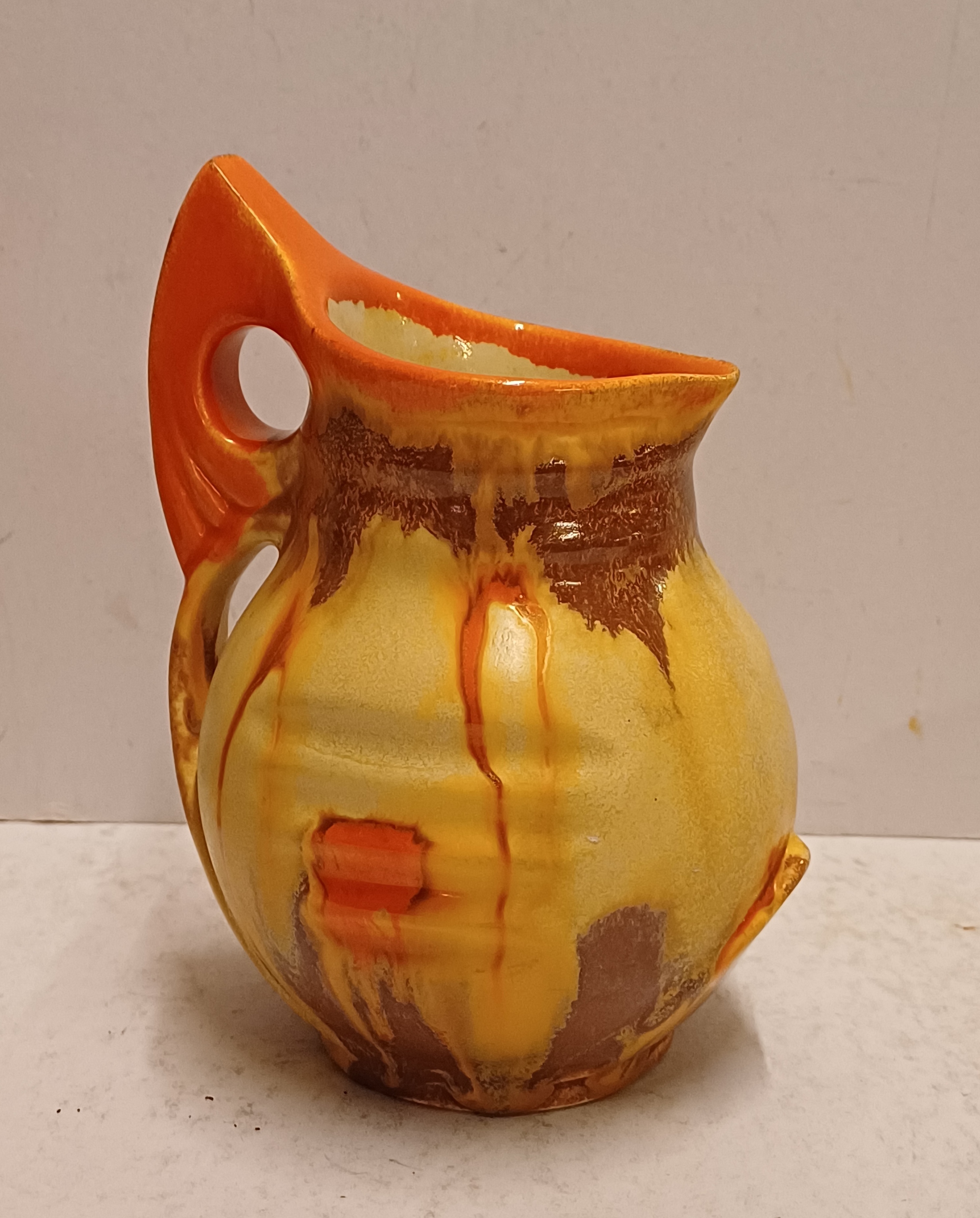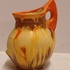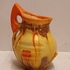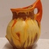 Met spuit glazuur in oranje en geel. Onderzijde gesigneerd.