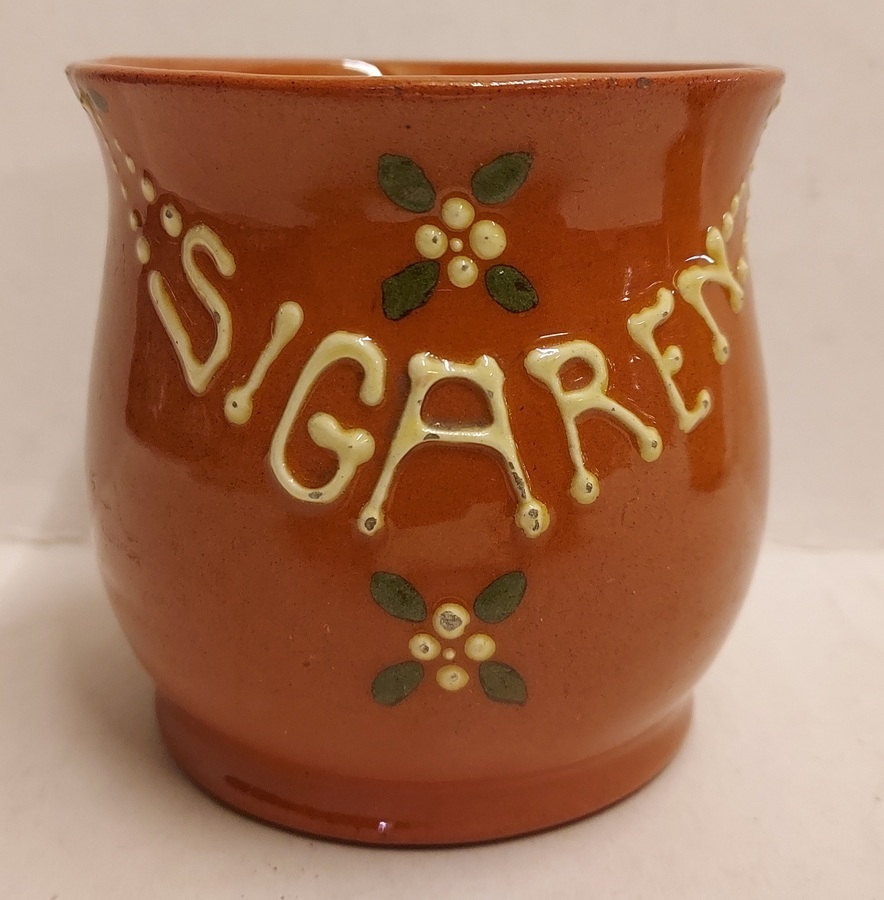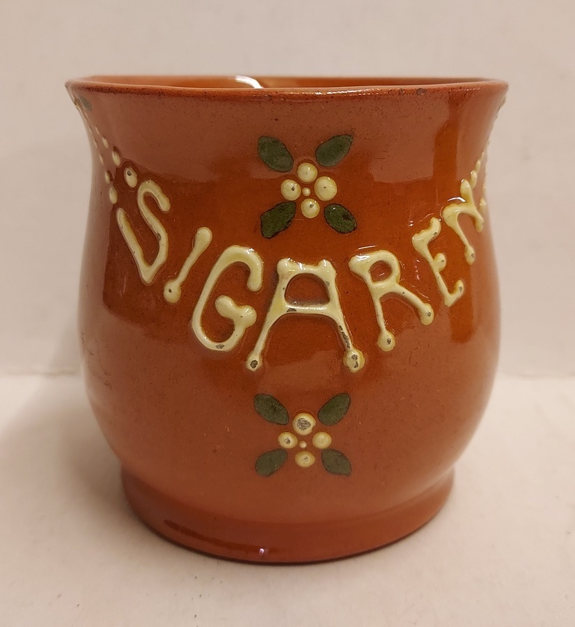 Earthenware cigar beaker with slip decor "Sigaren". Katwijk execution.