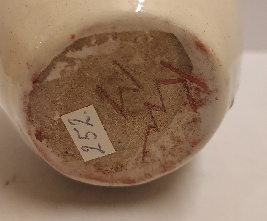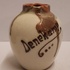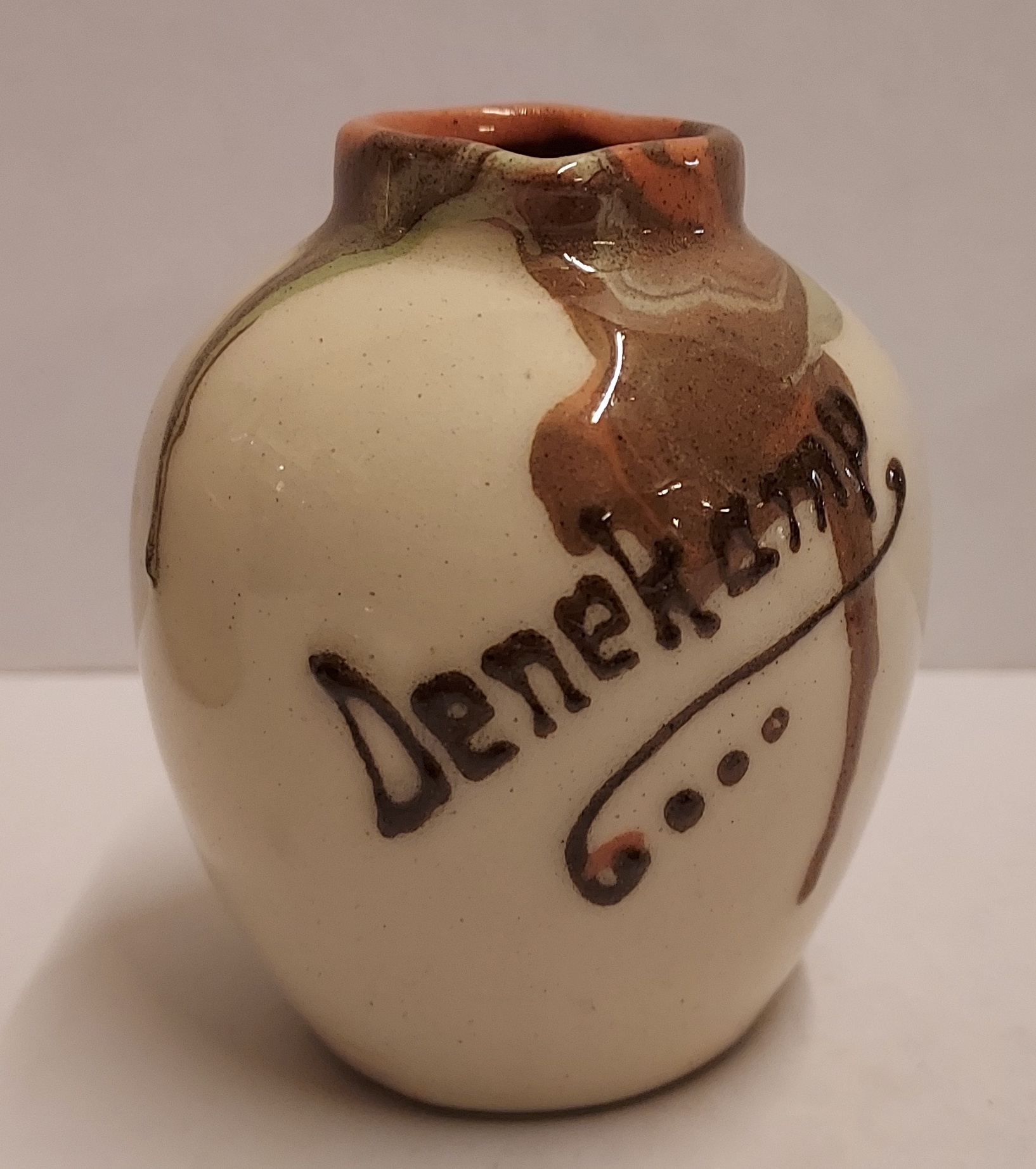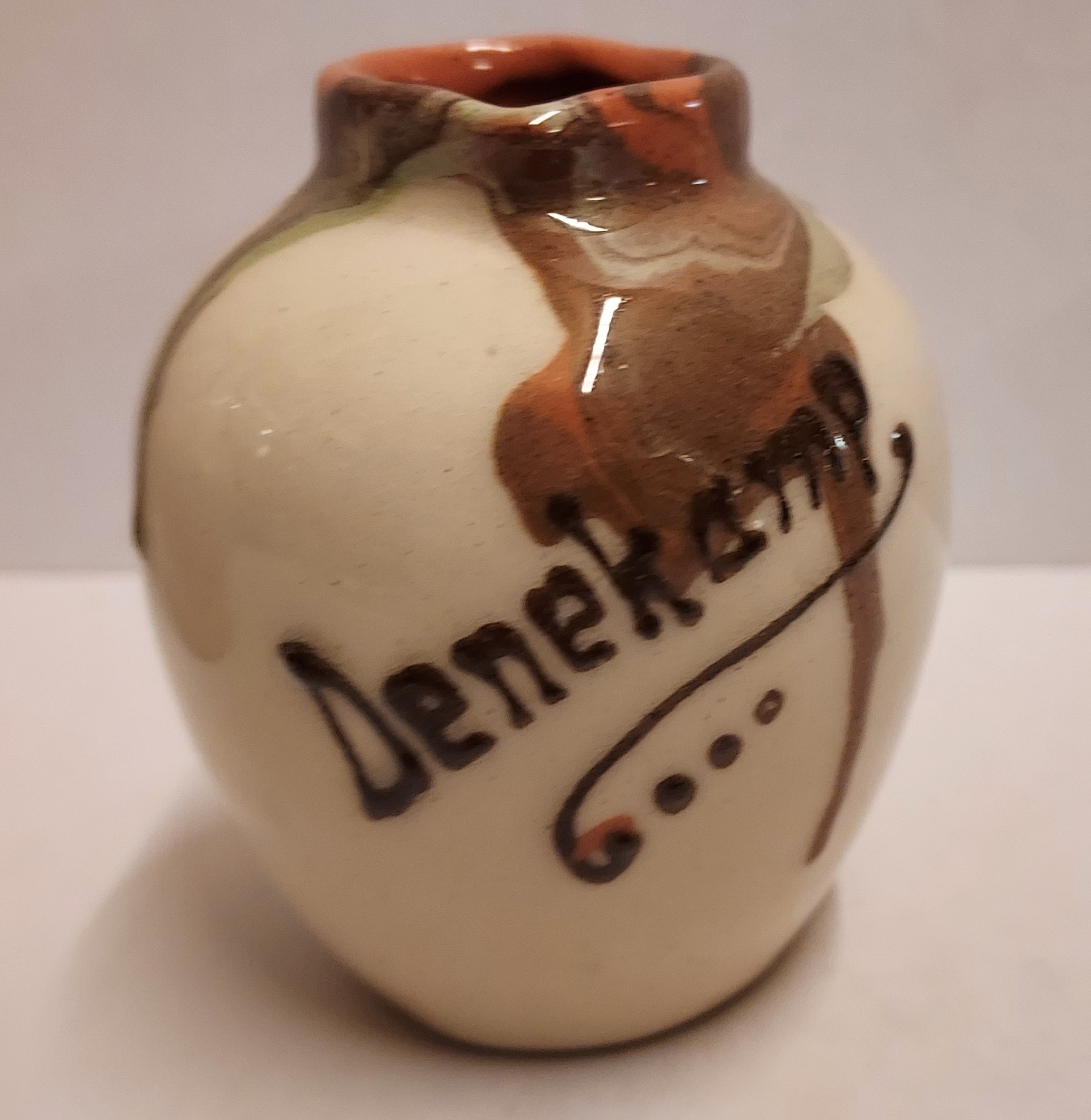 Cream glazed small jug with multicolored glaze on the top, the name "Denekamp" scribed in slip on the belly. Signed and numbered on the bottom.