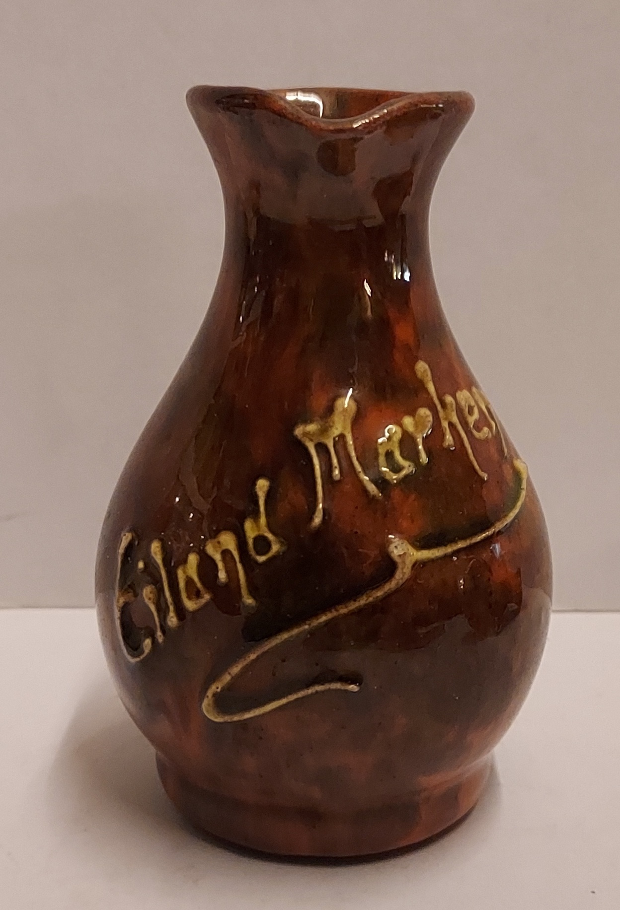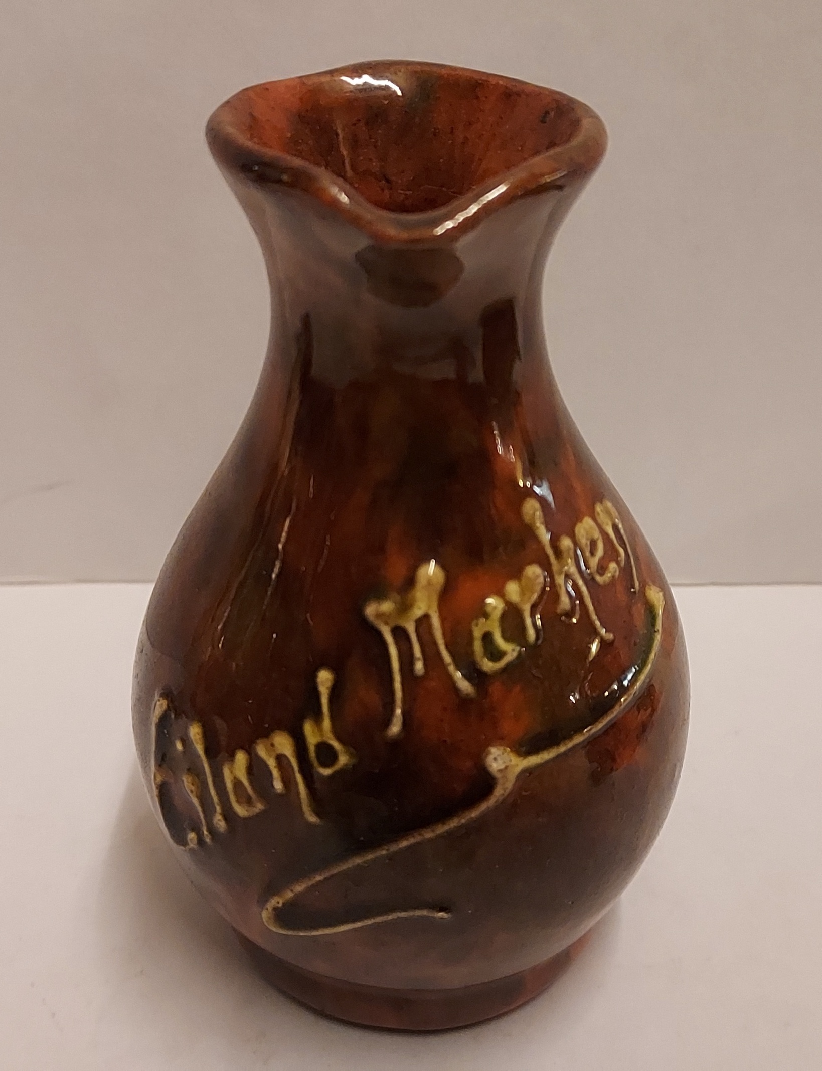 Earthenware jug with slip decoration, place name Eiland Marken. Signed on the bottom.
