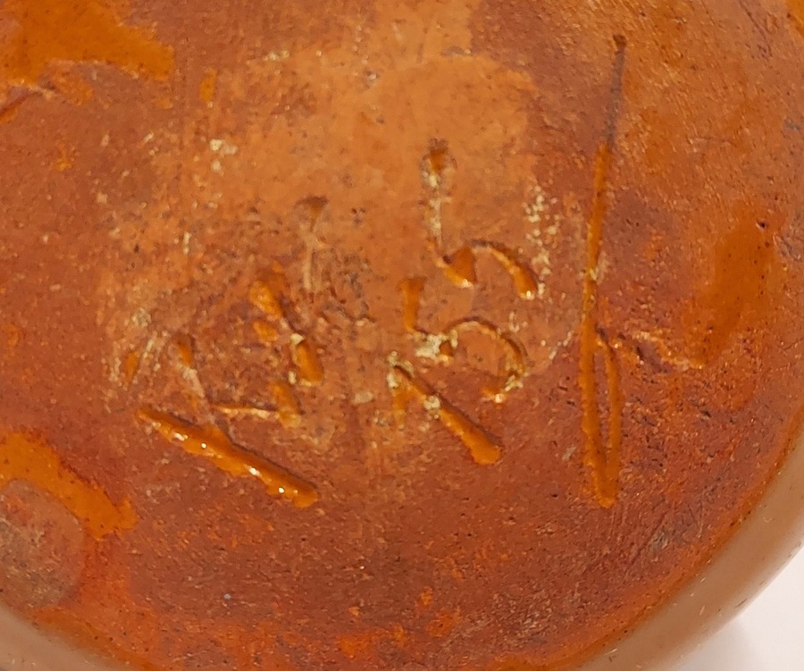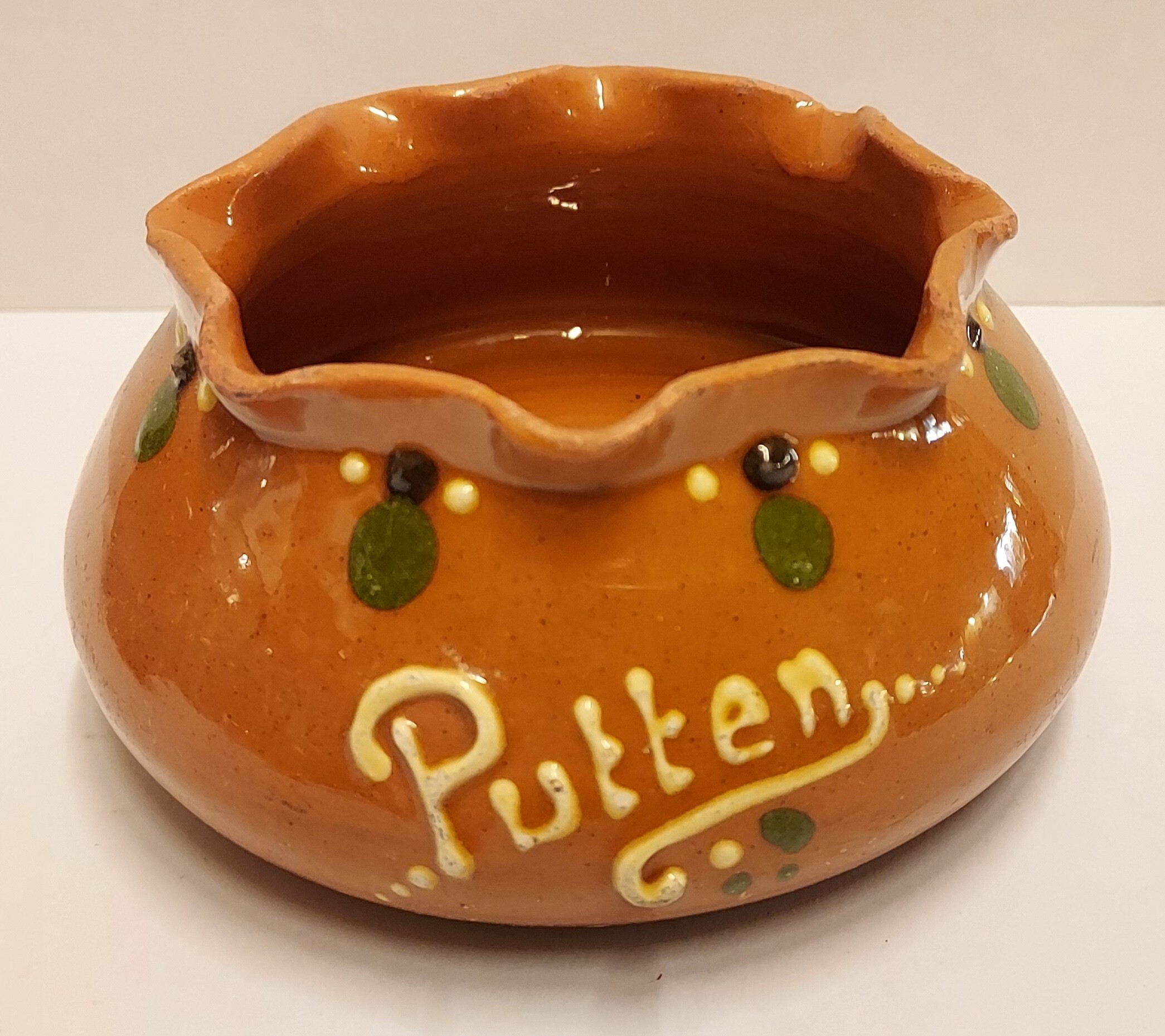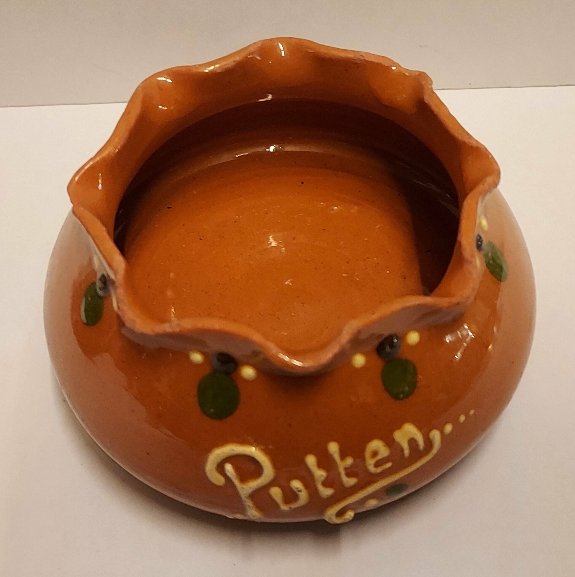 Terracotta dish with tin glaze and slip decor featuring the town name Putten. Marked on the bottom.