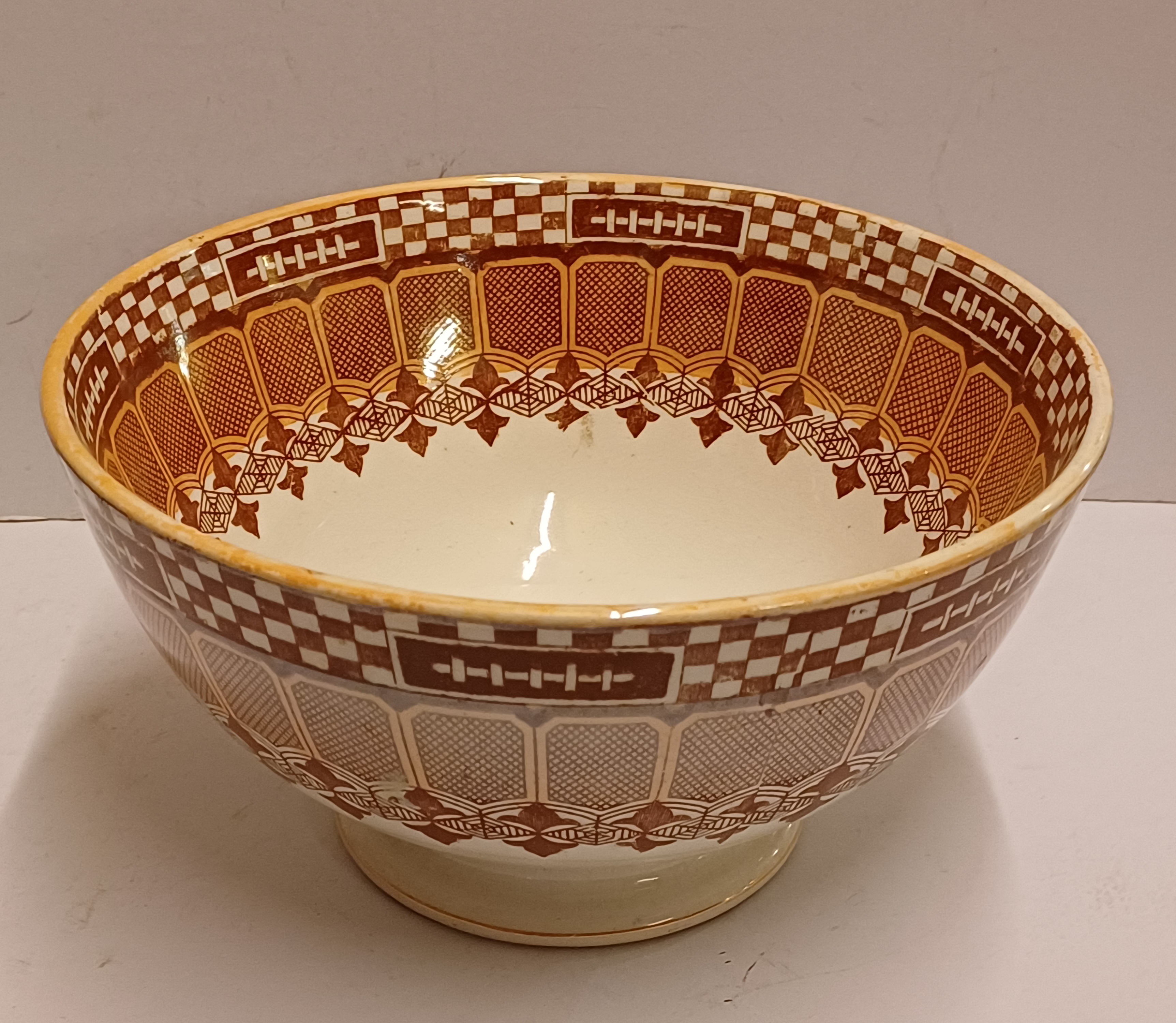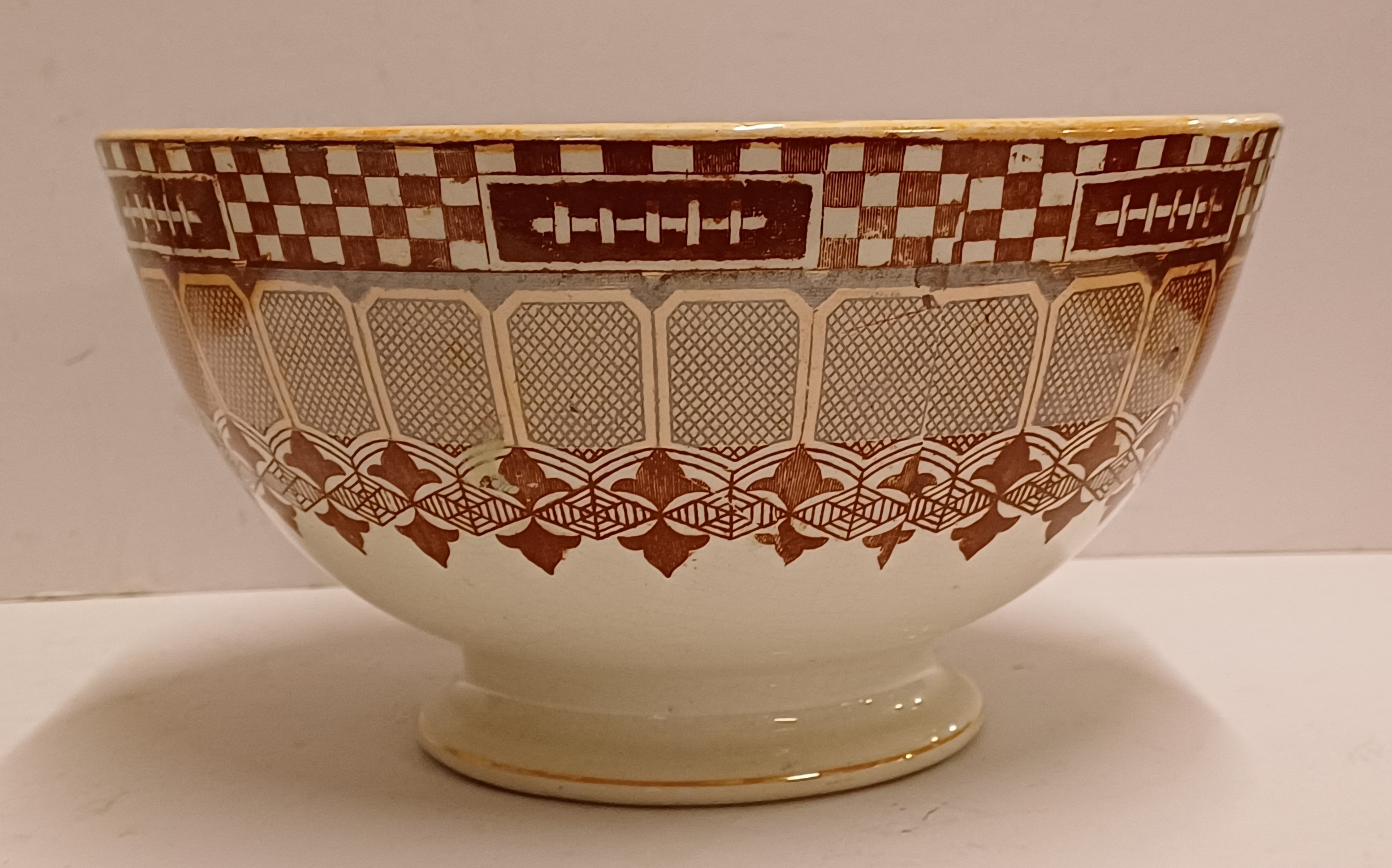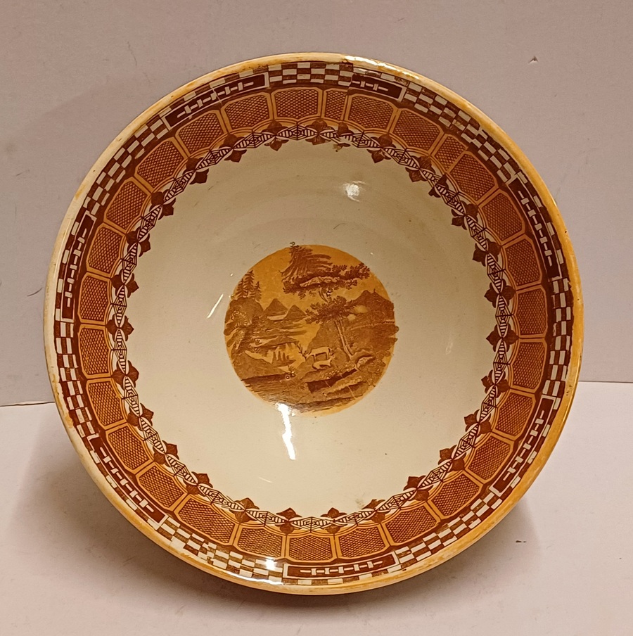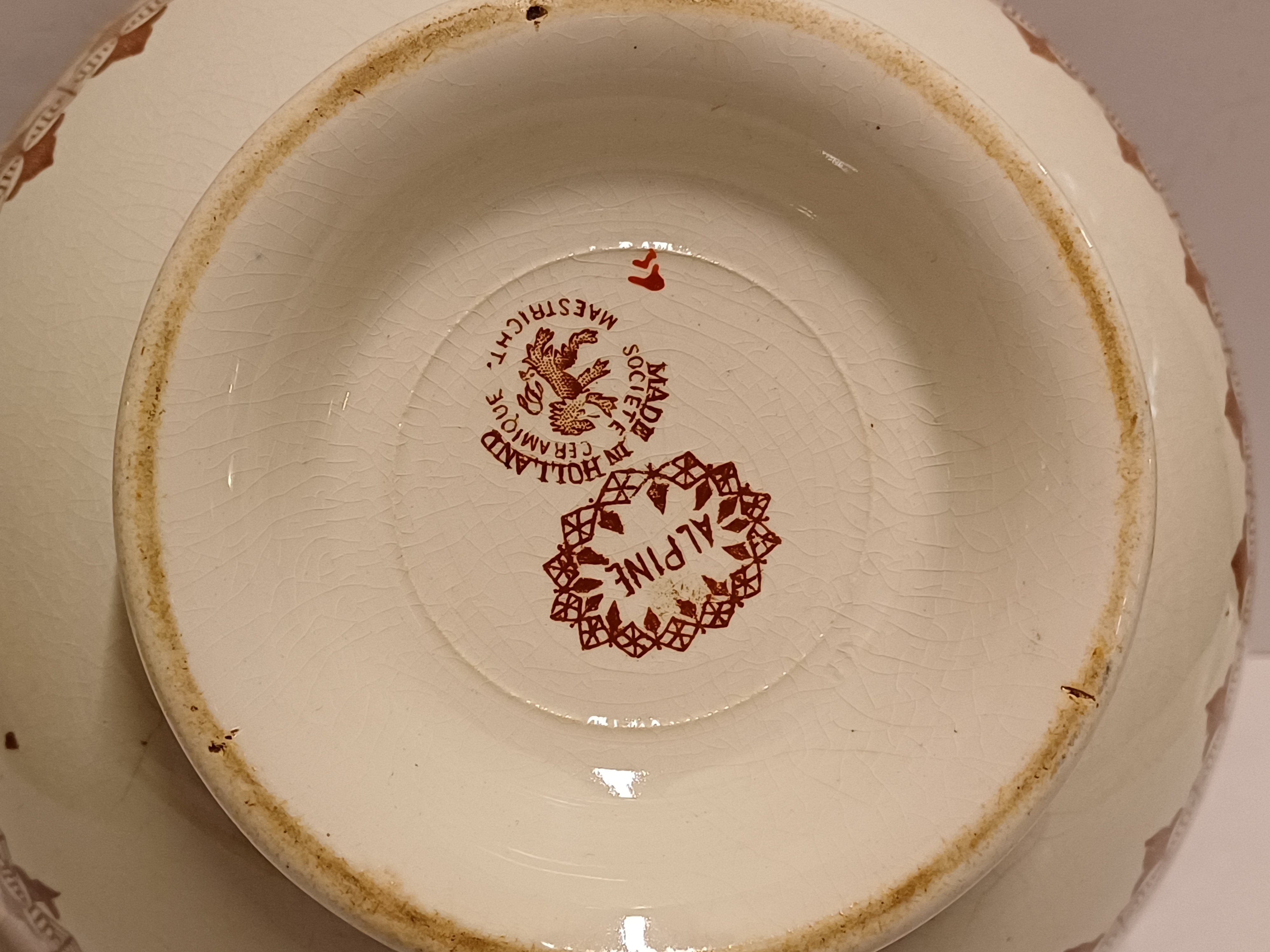 Earthenware washbowl with brown lustre decor Alpine. Bottom with factory mark.