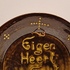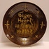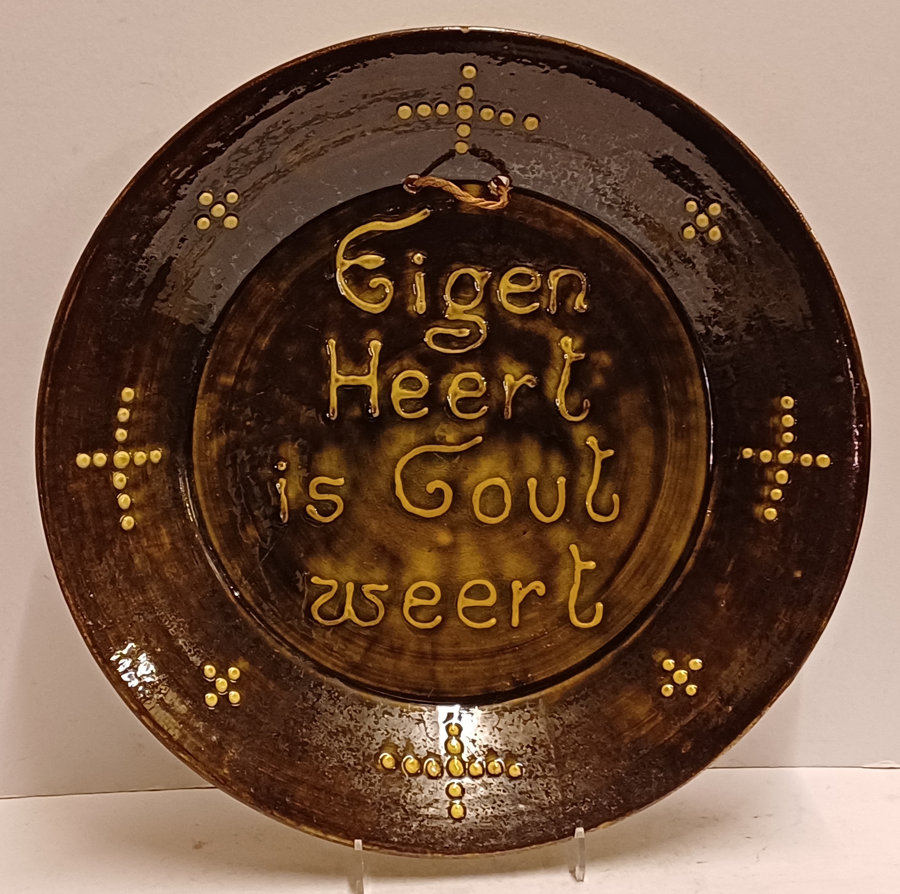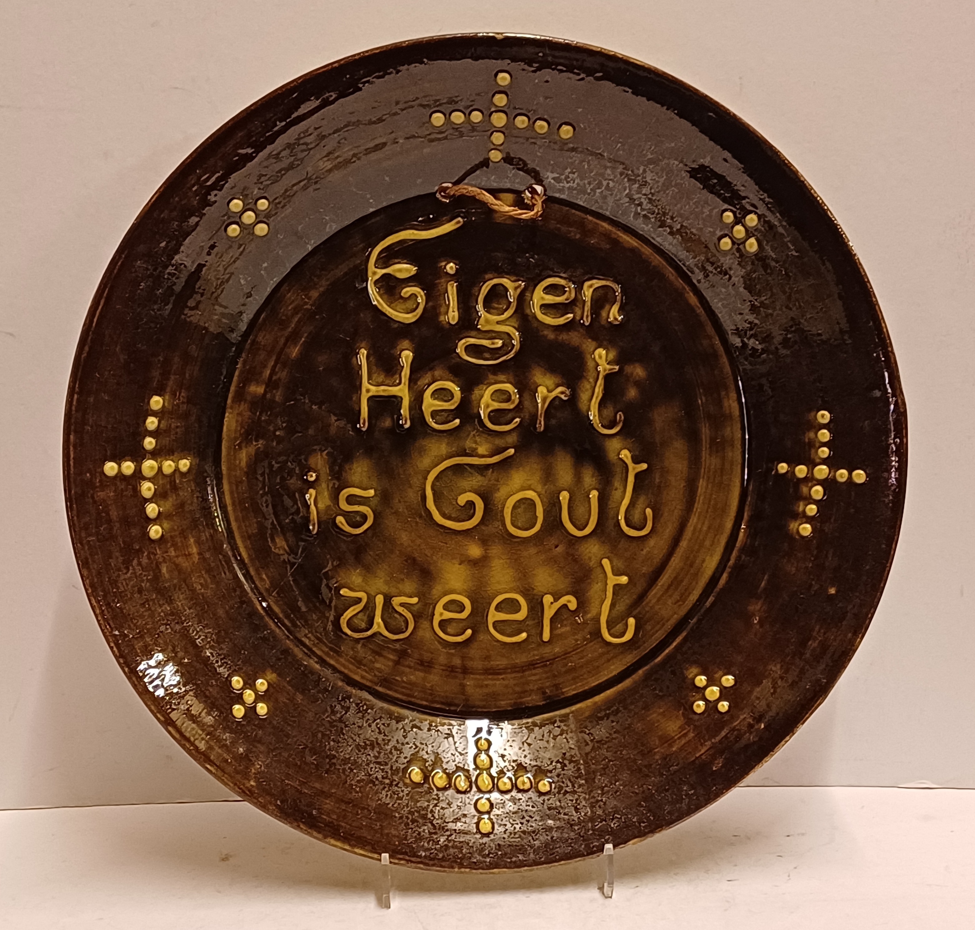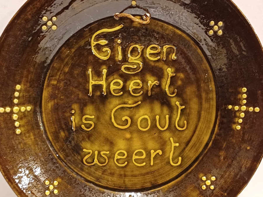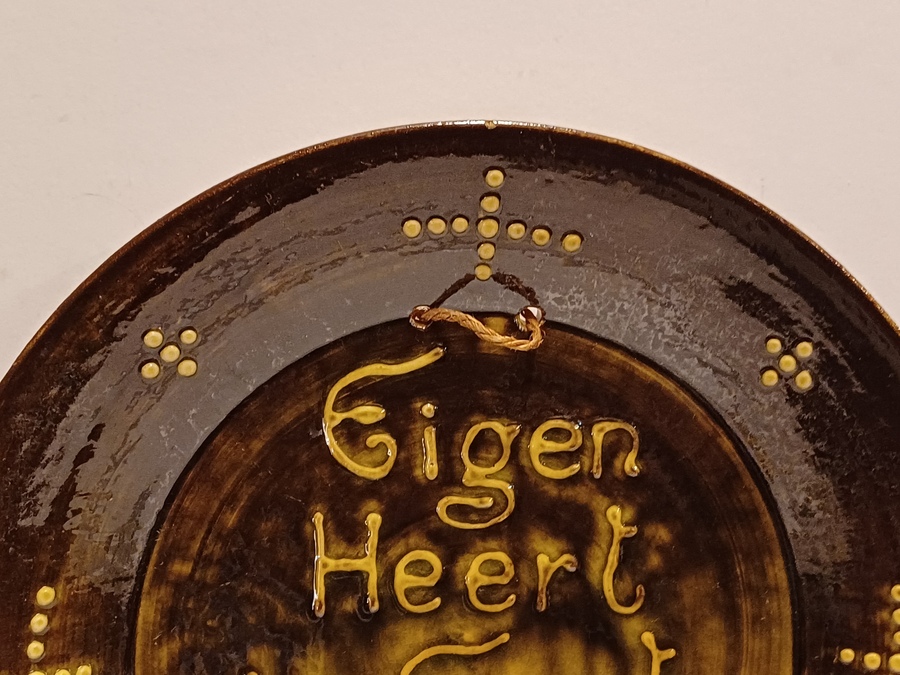 Aardewerken bord met slib decor spreuk "Eigen Heert is Goud weert" Achterzijde met monogram.