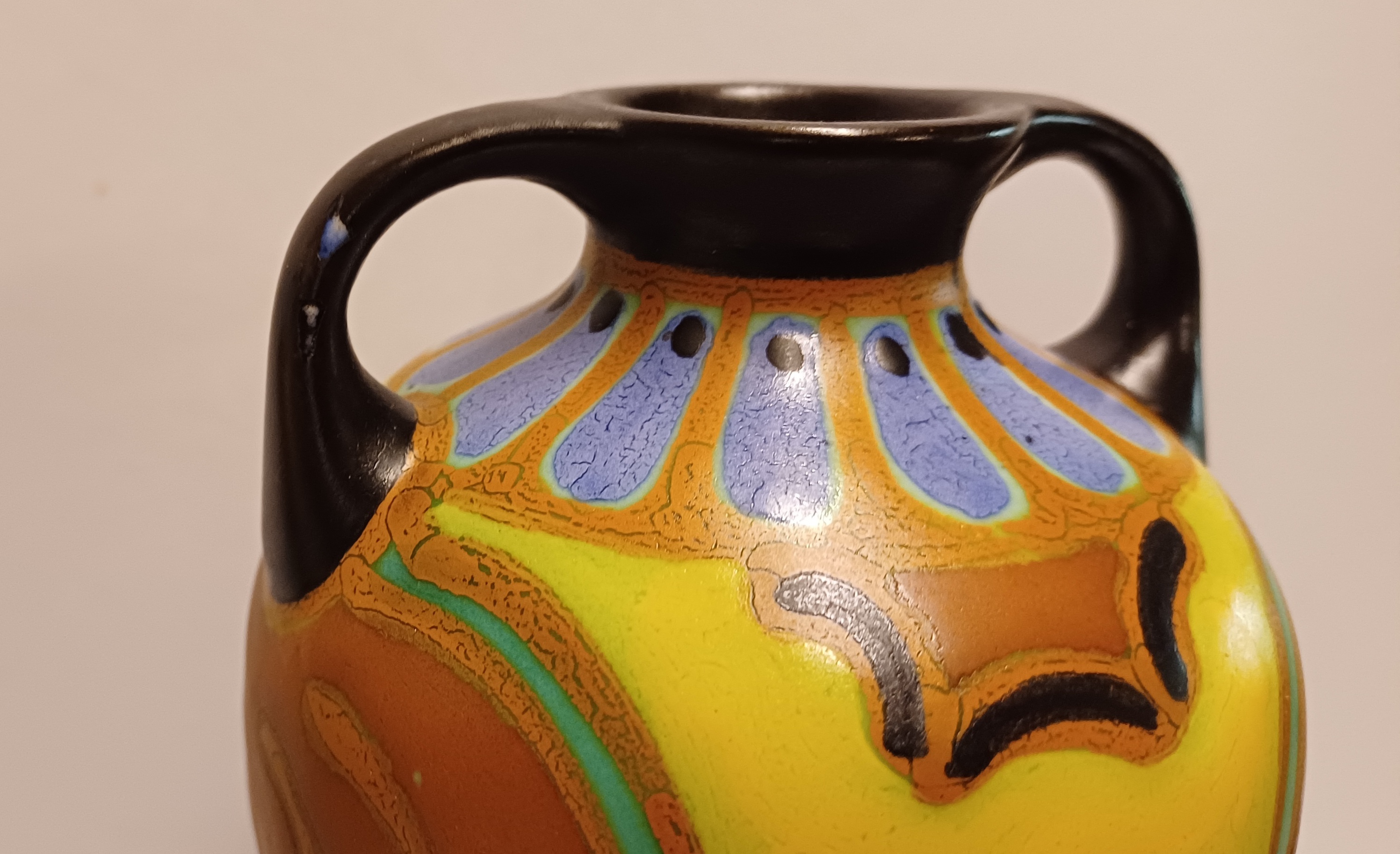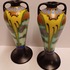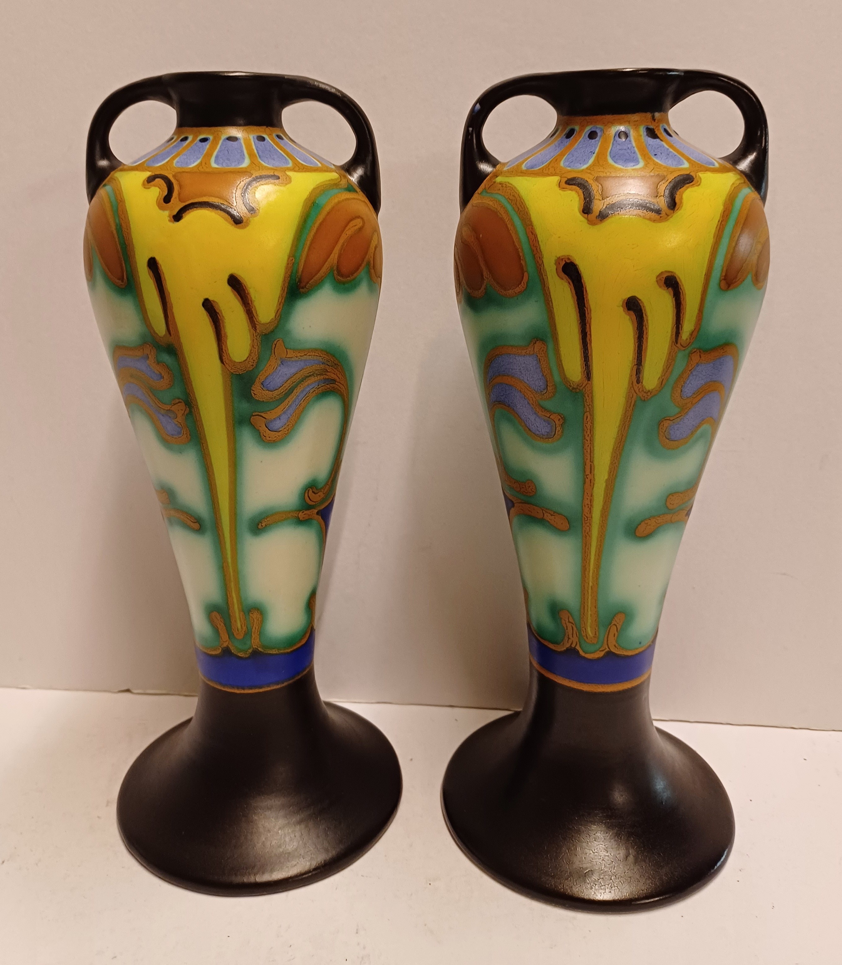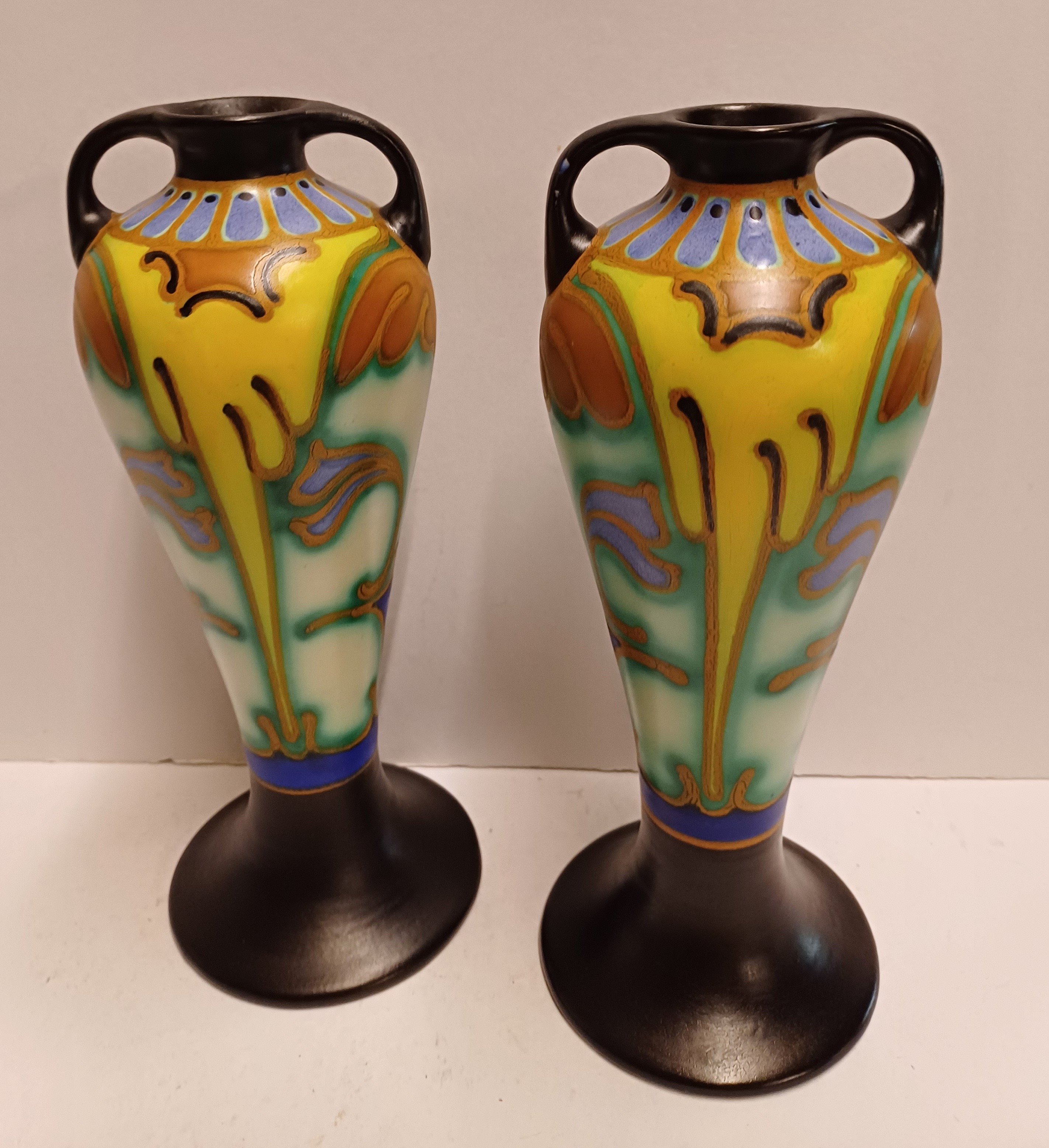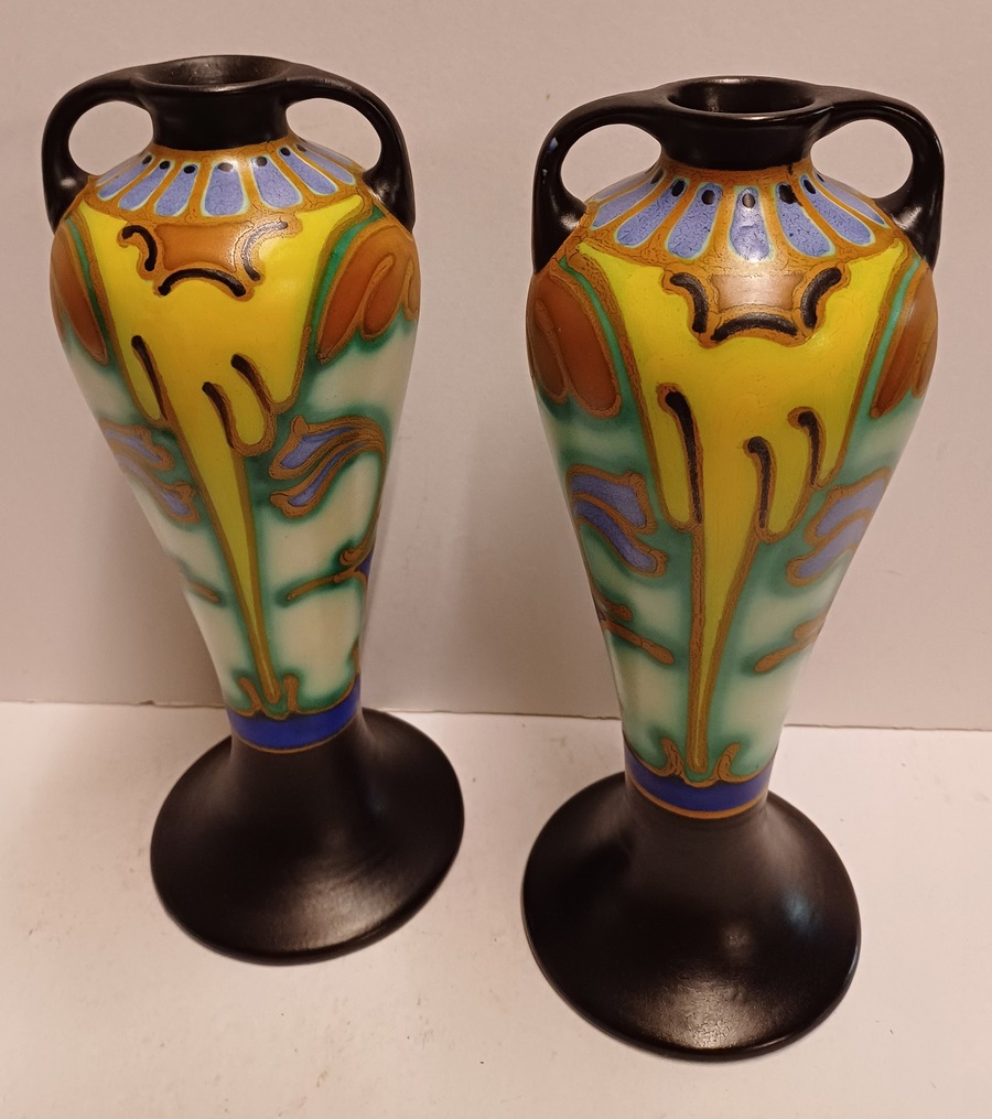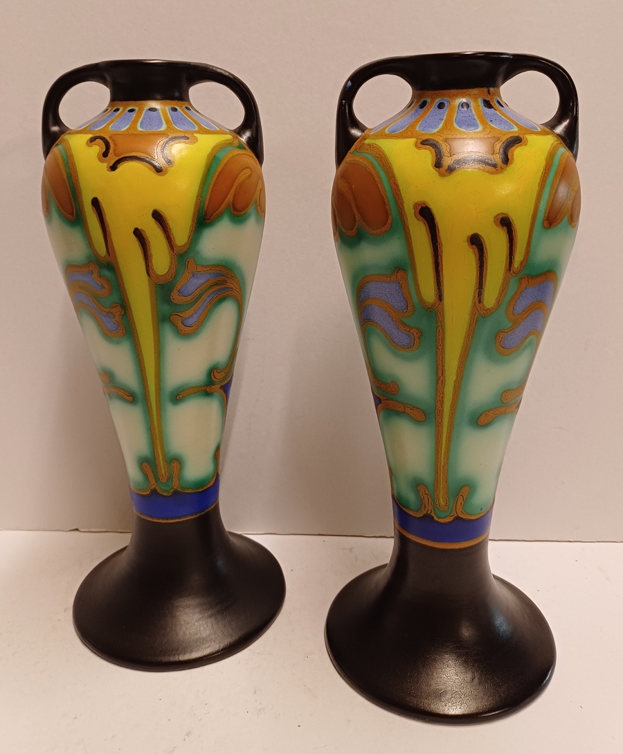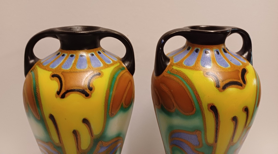 Platelen set of ear vases with stylized Corel decor. Both with factory mark on the bottom.