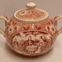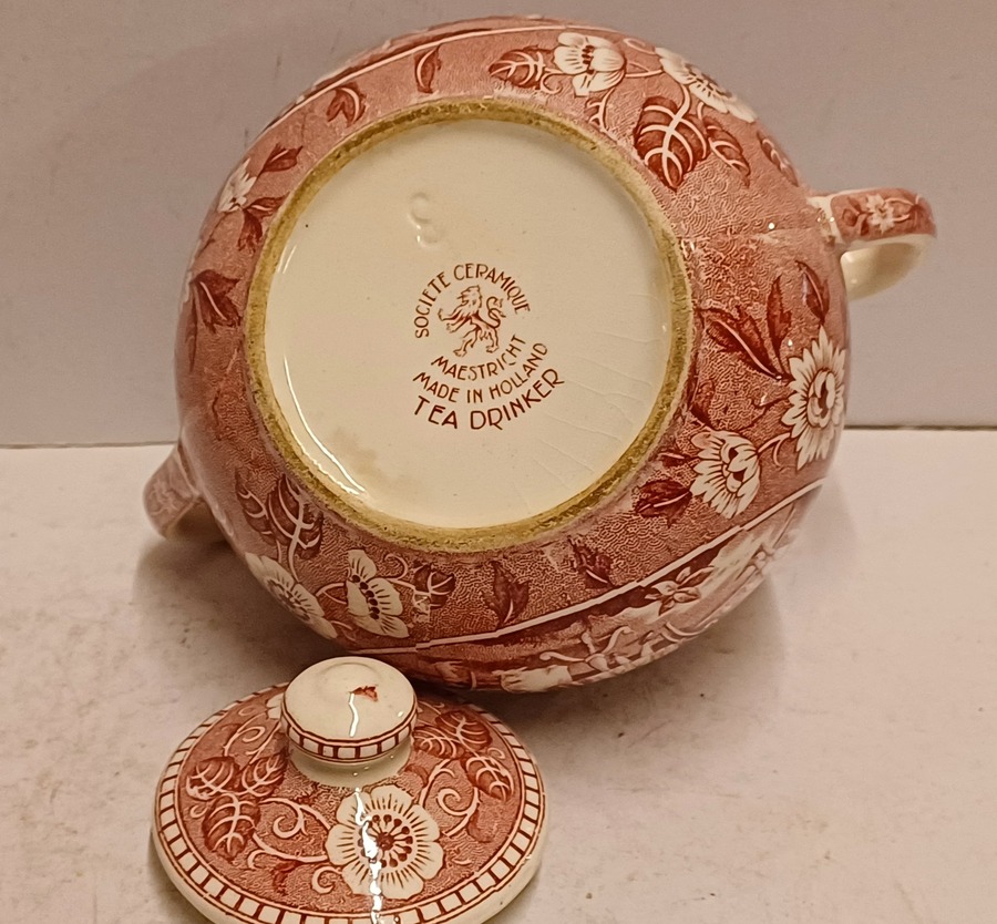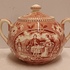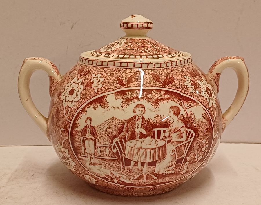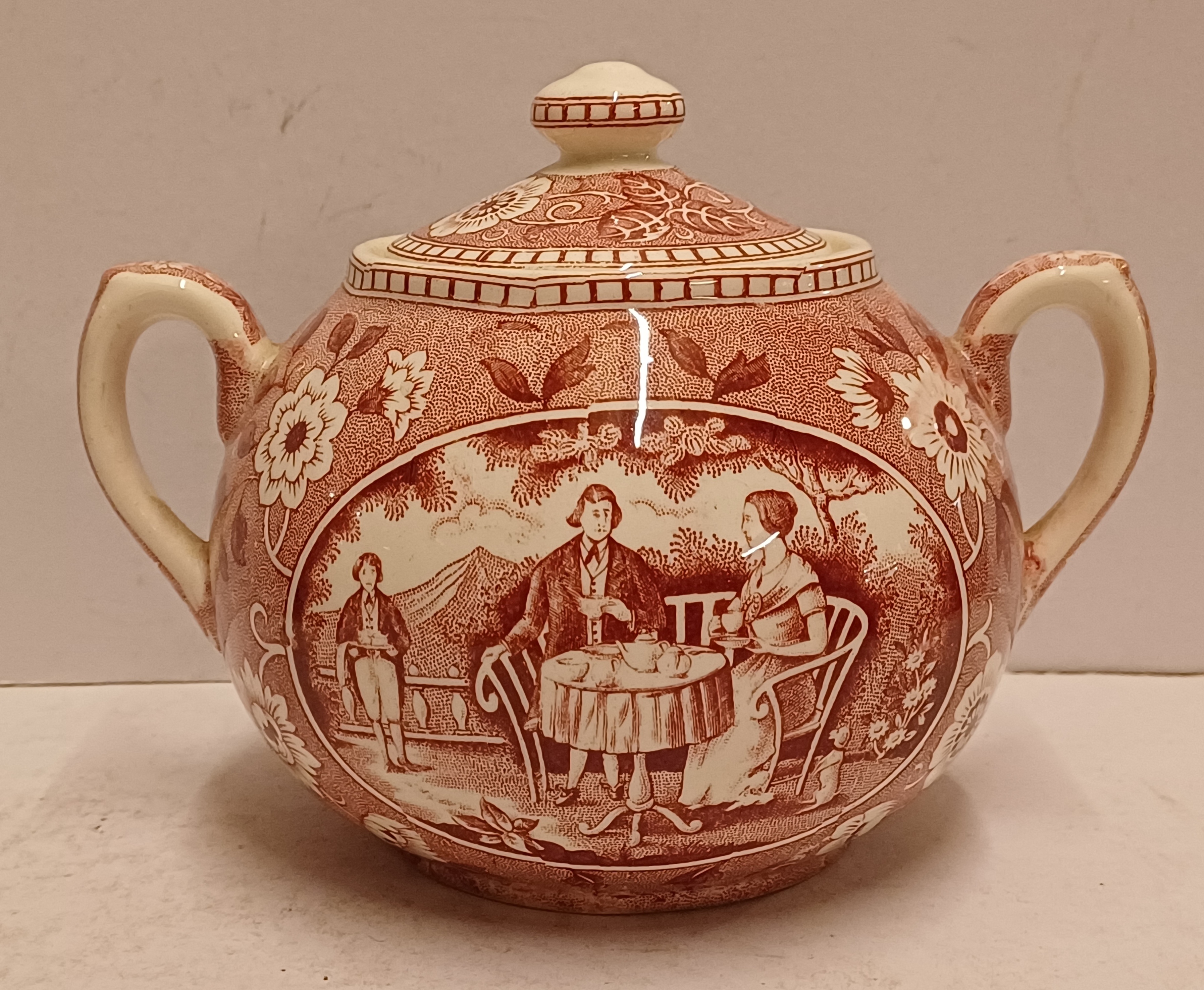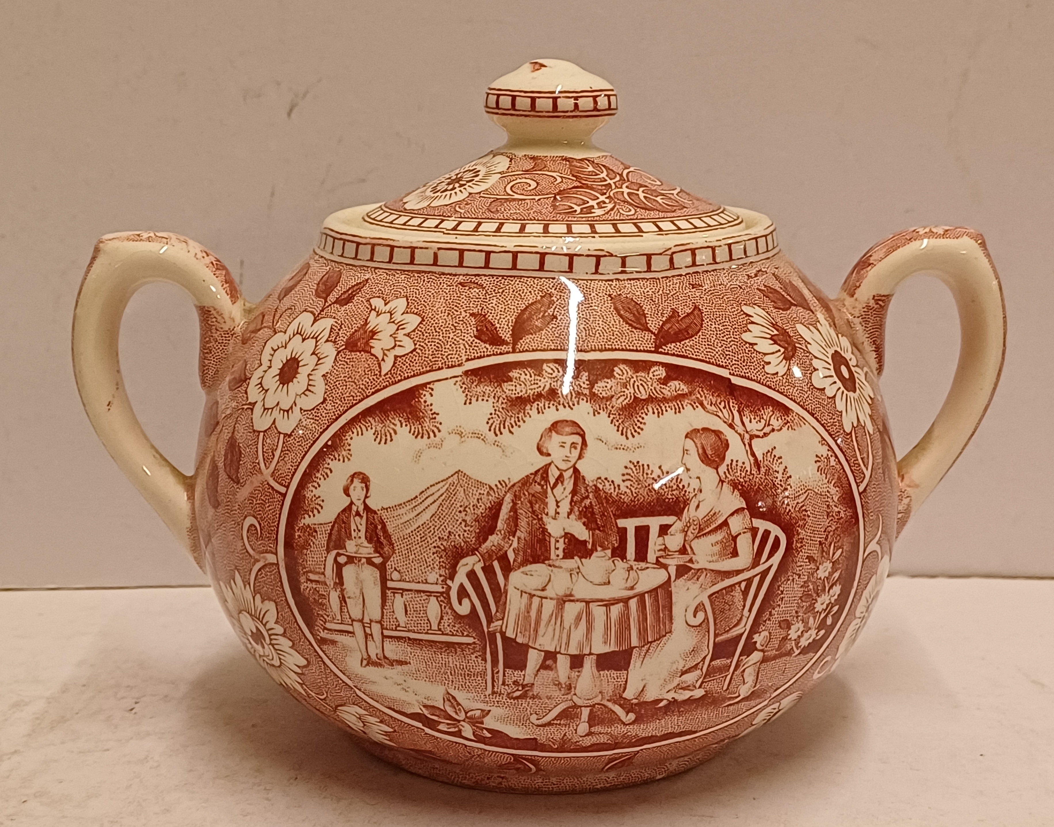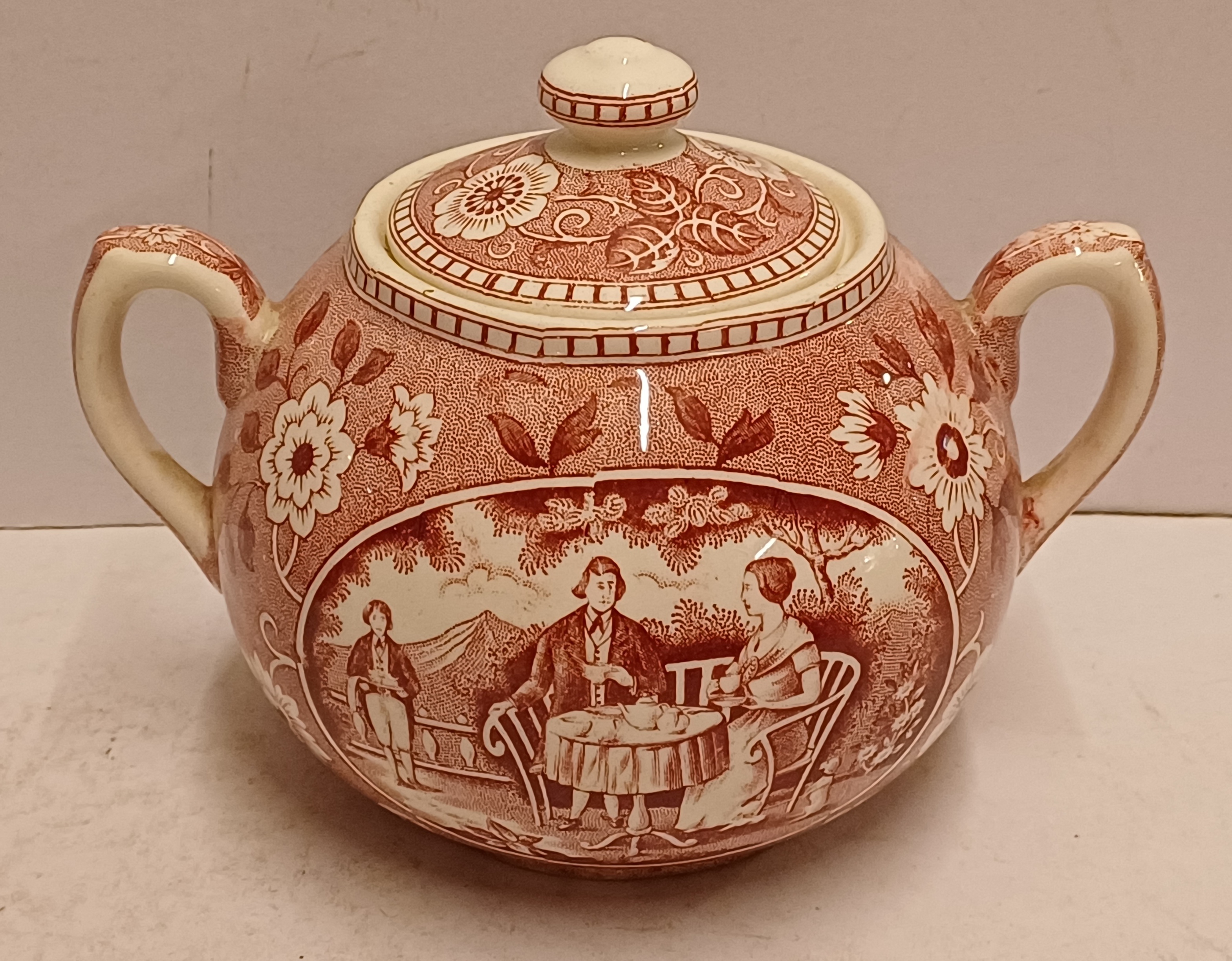 Earthenware sugar pot with red transfer decor "Tea Drinker". Produced by Societe Ceramique Maastricht.