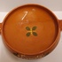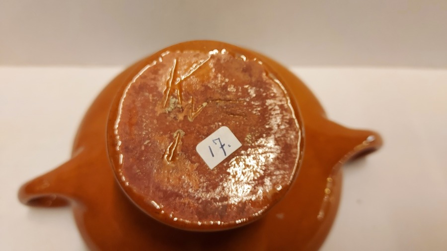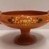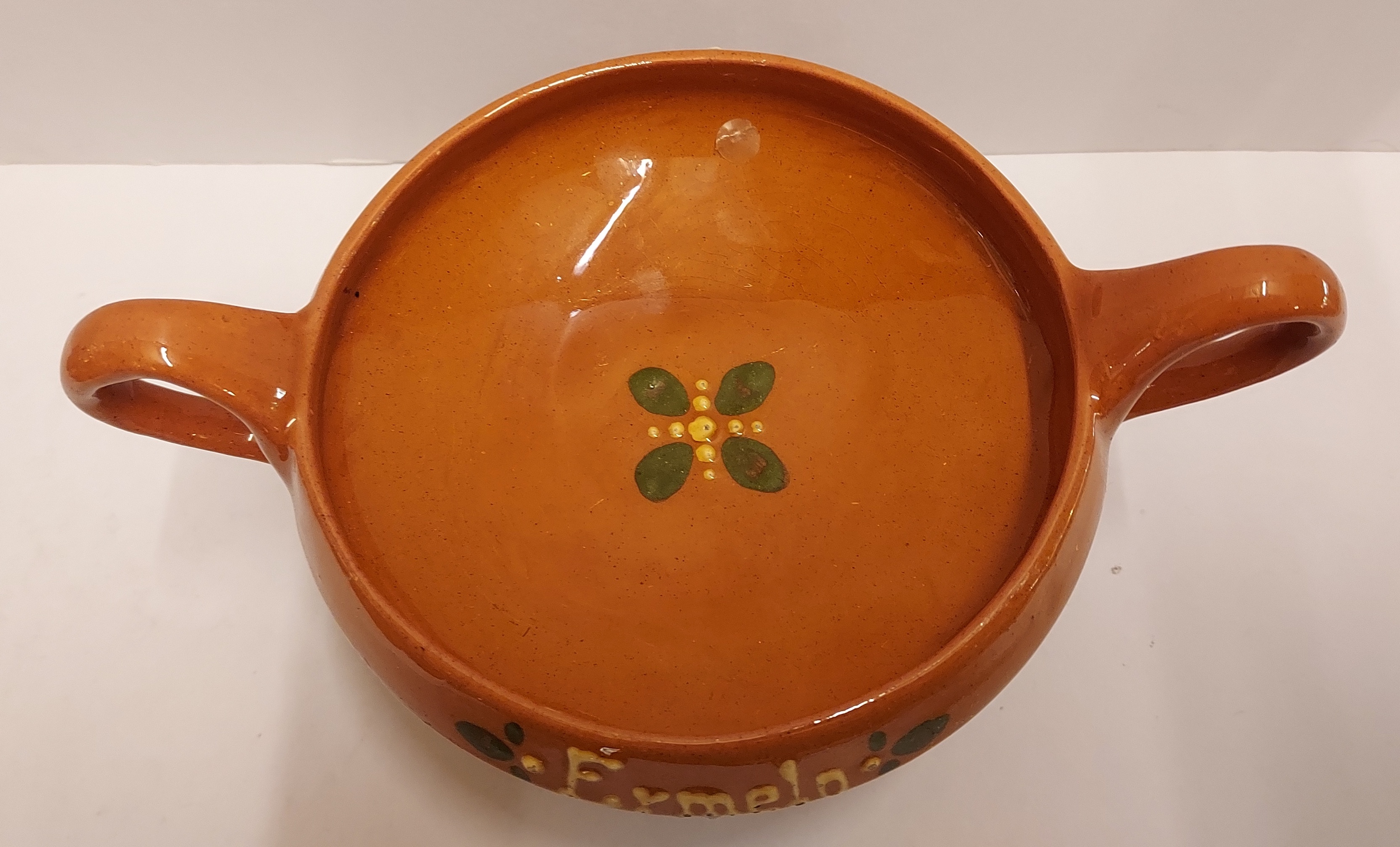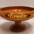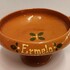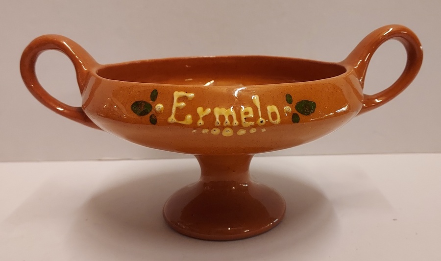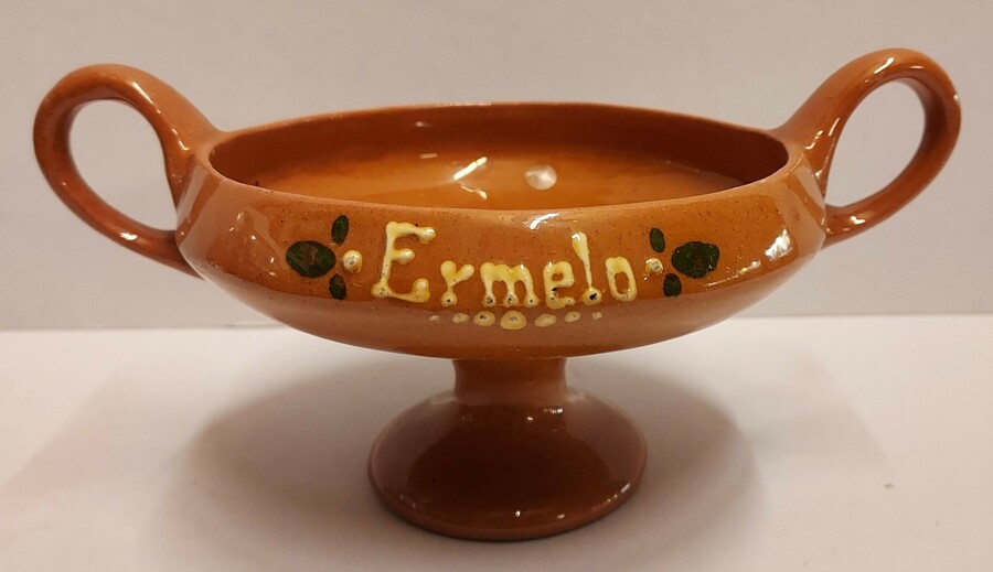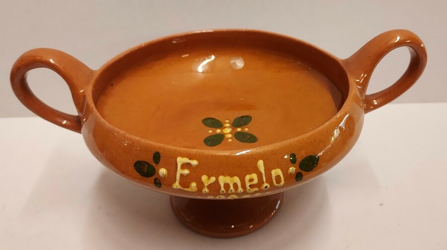 A small dish on a foot with two high handles, featuring the place name Ermelo in slip and green decoration. Bottom with signature.