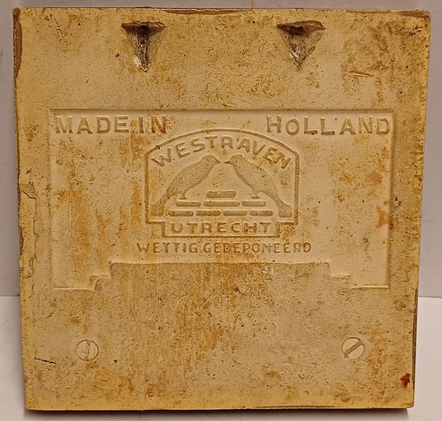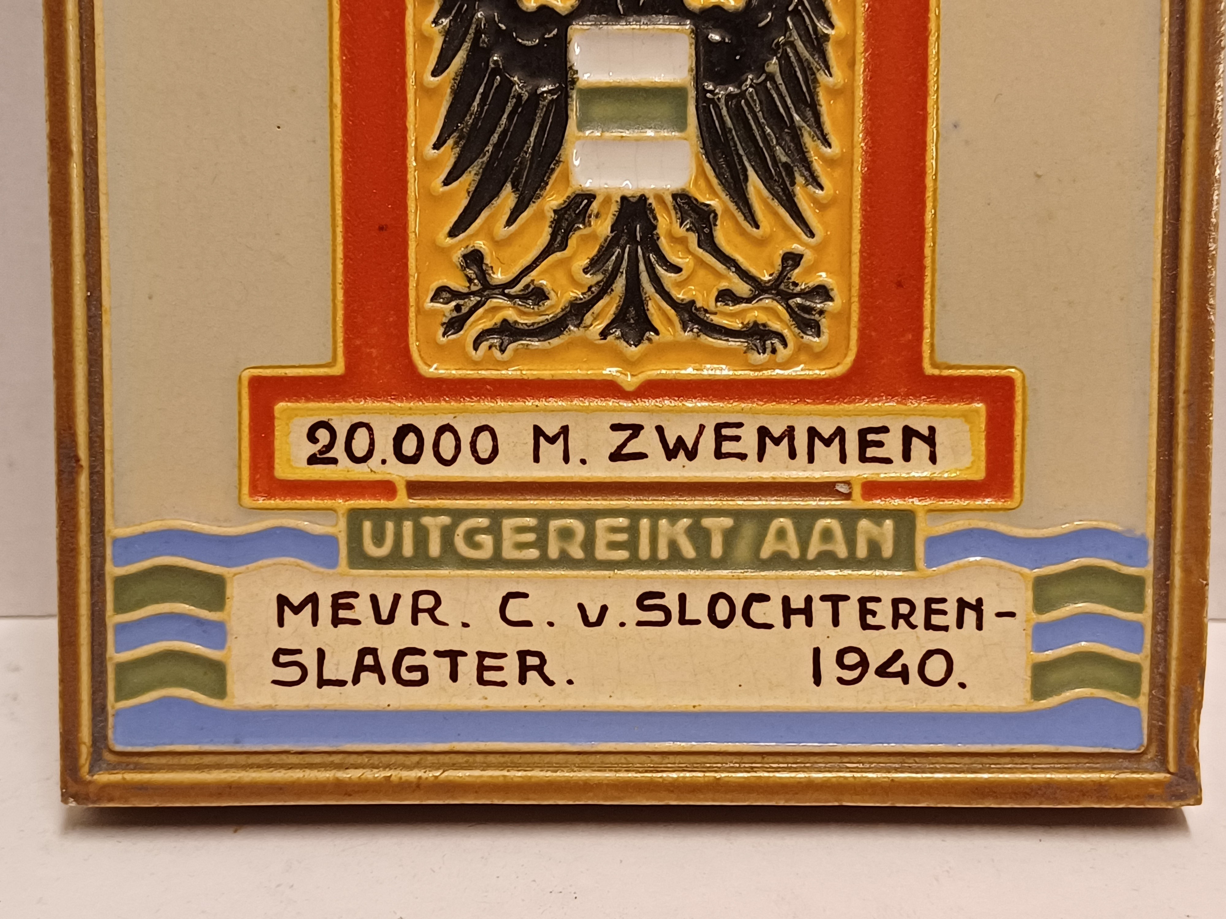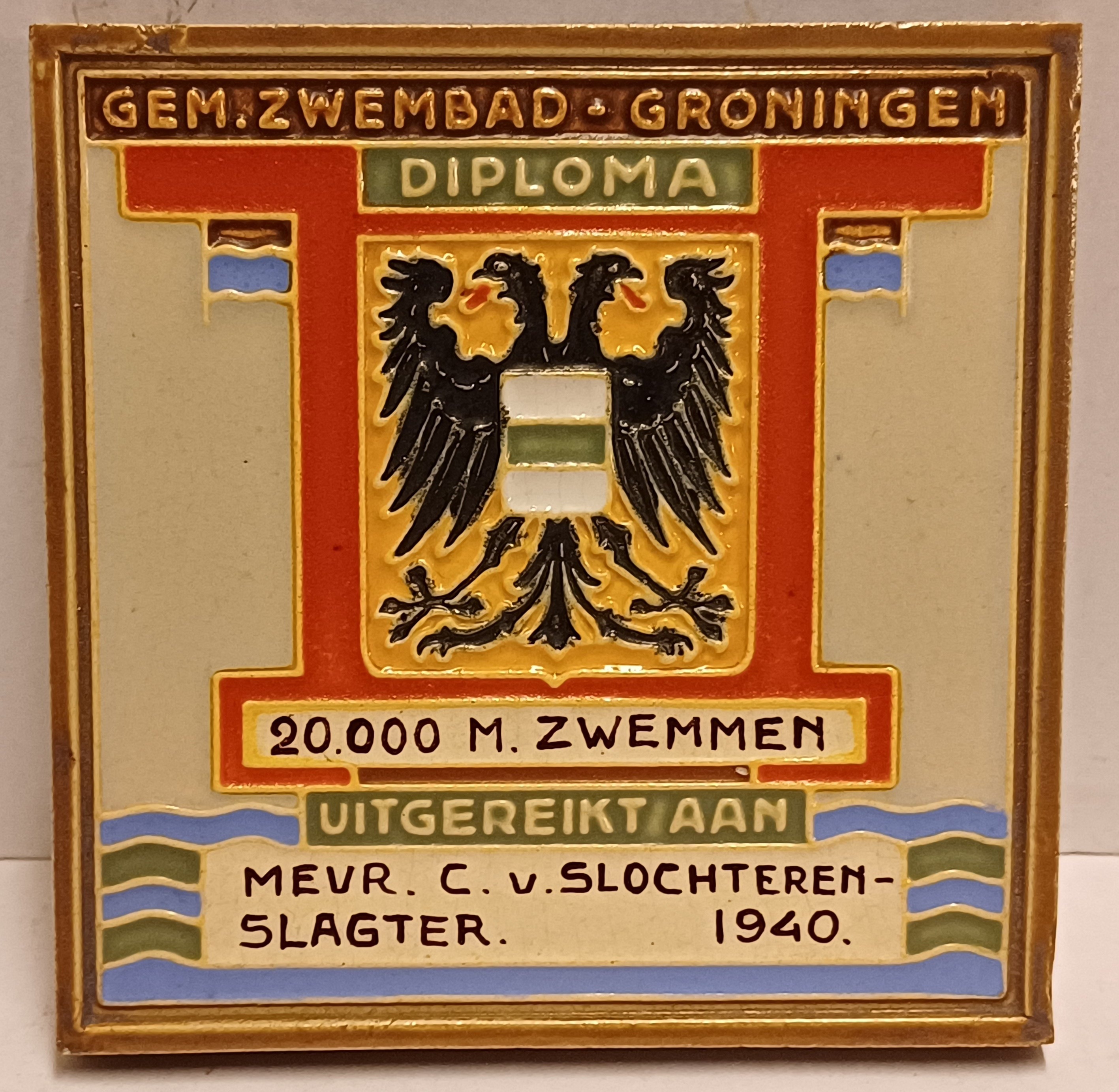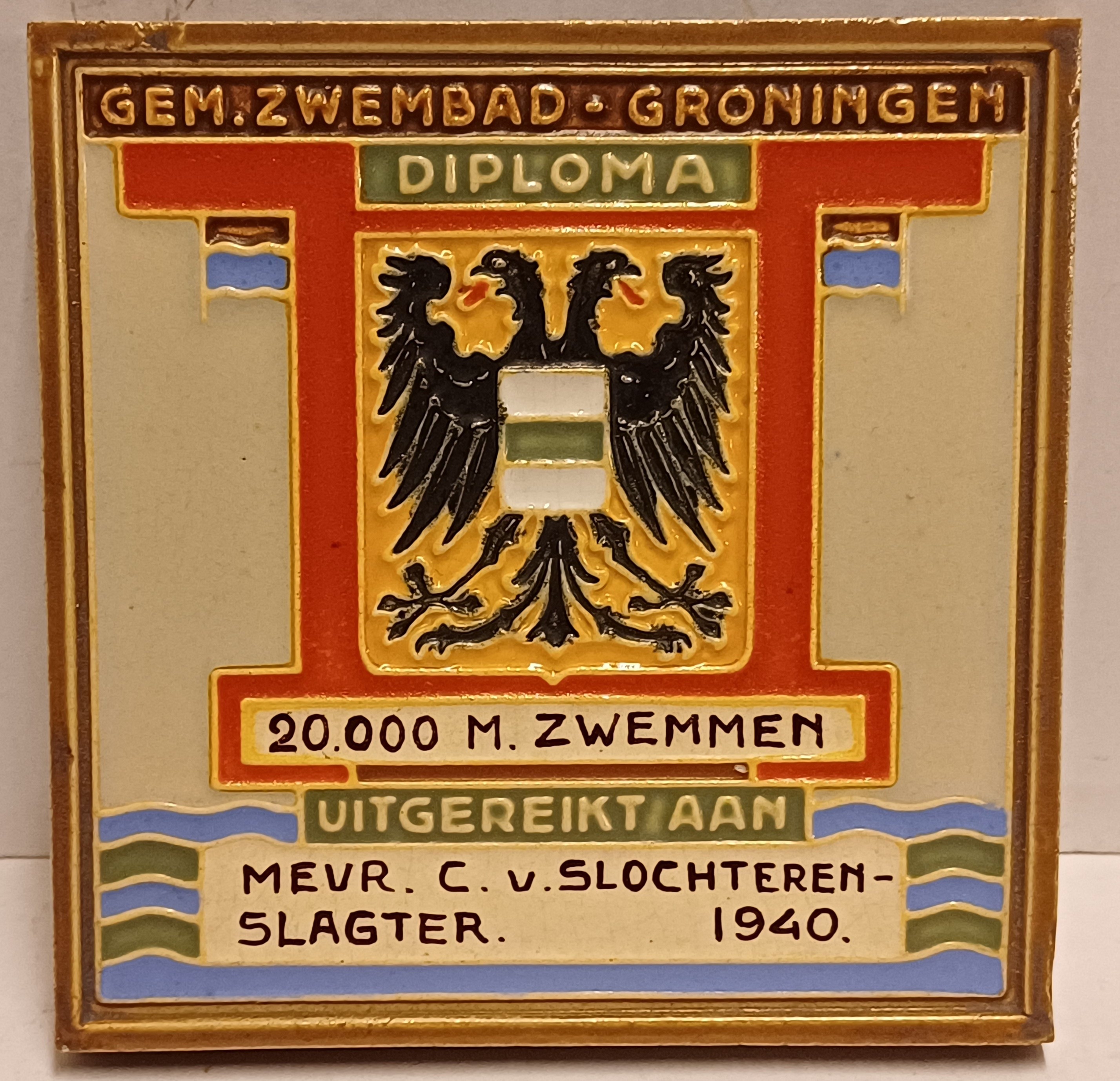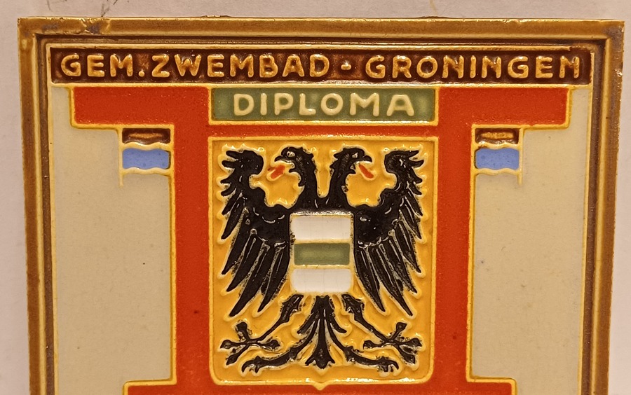 Aardwerken tegel met het wapen van de stad Groningen en de tekst " Gem. Zwembad Groningen 20.000 m zwemmen. Uitgereikt aan Mevr C van Slochteren Slagter 1940". Achterzijde gesigneerd met fabrieksmerk.