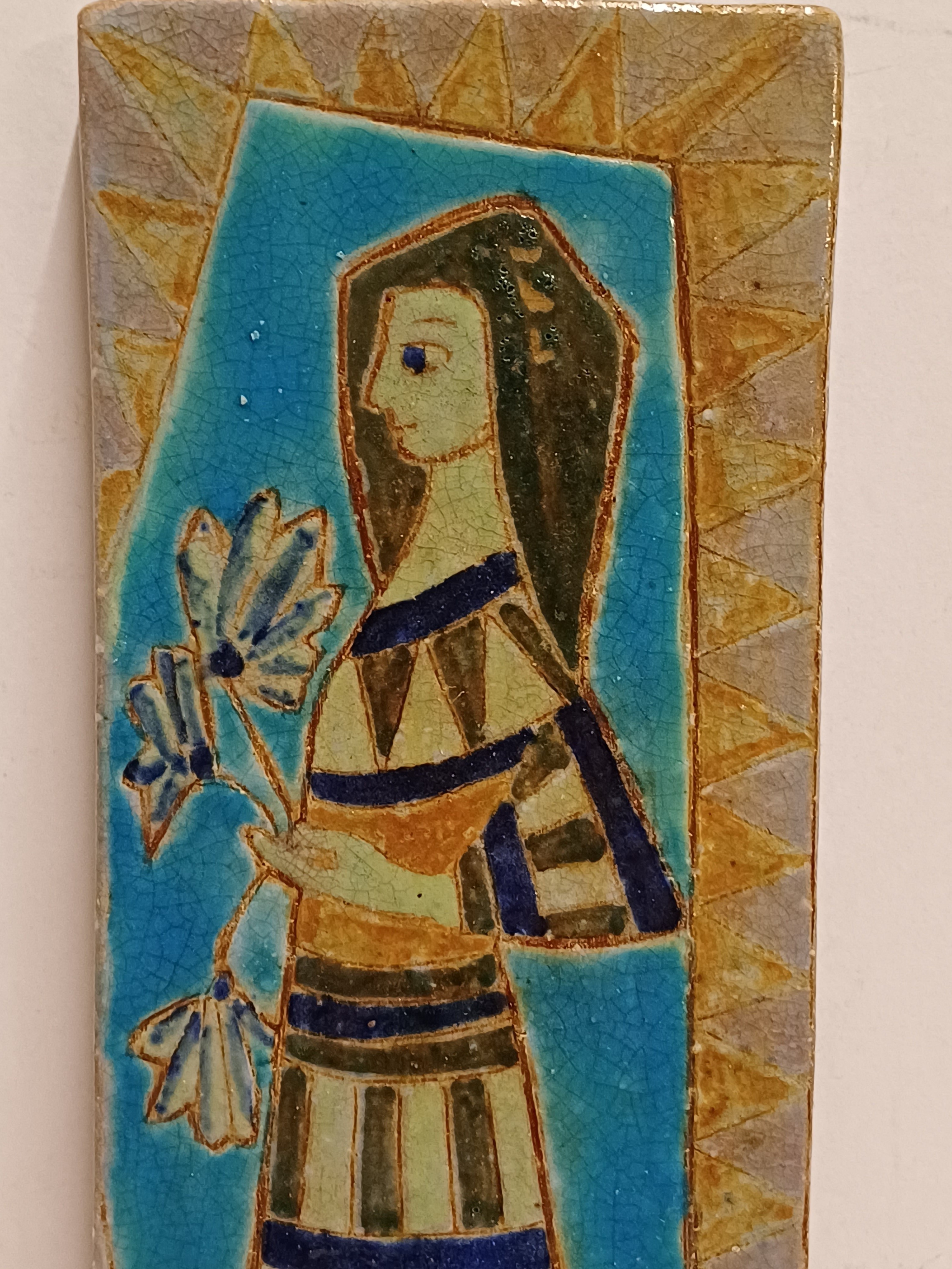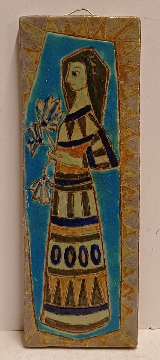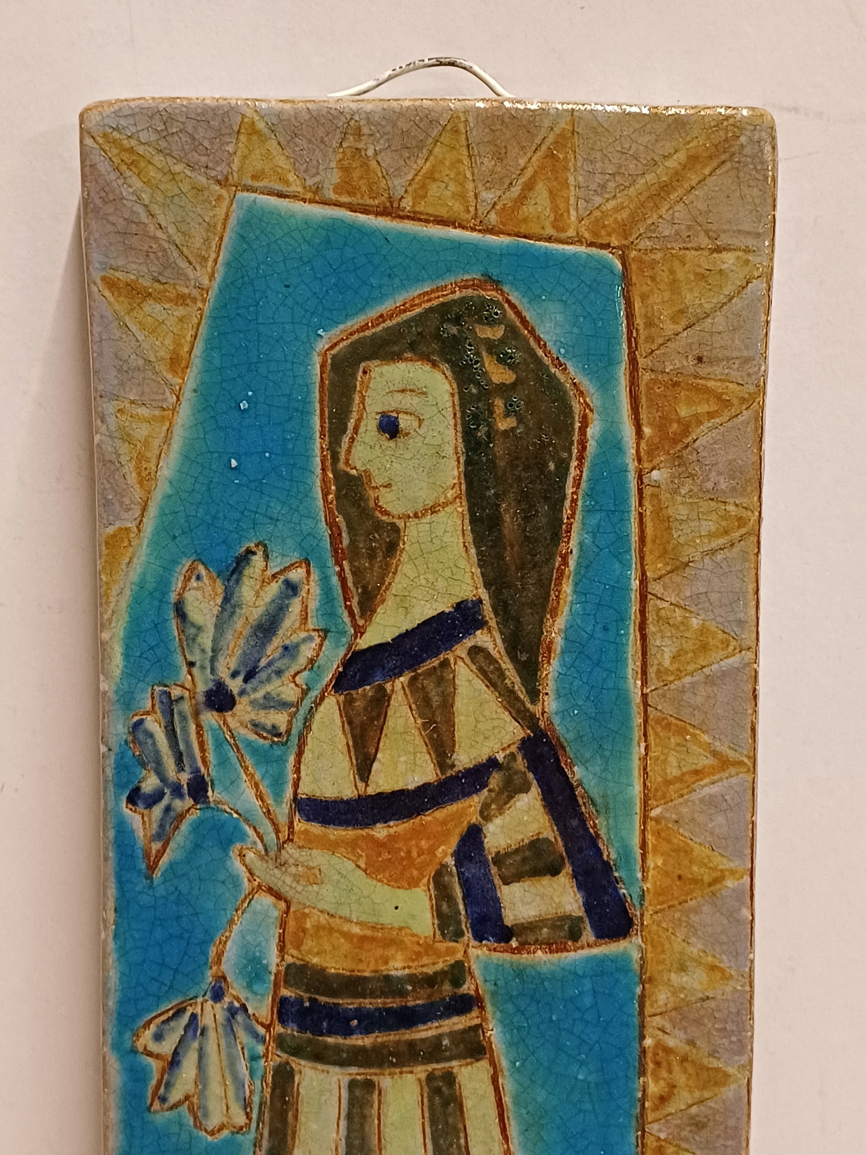 Earthenware tile with a polychrome depiction of a woman holding flowers in her hand. Signed on the back.