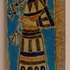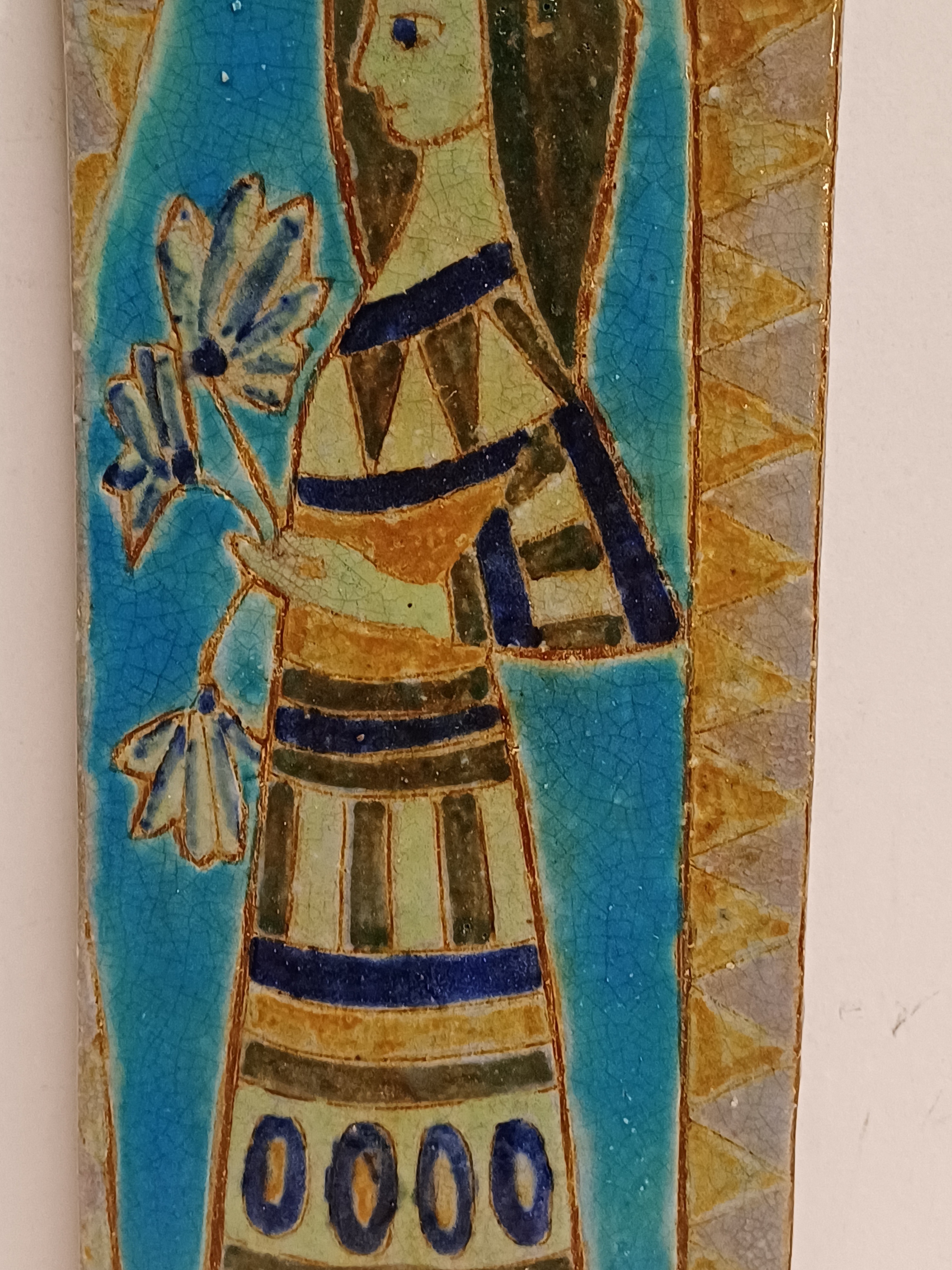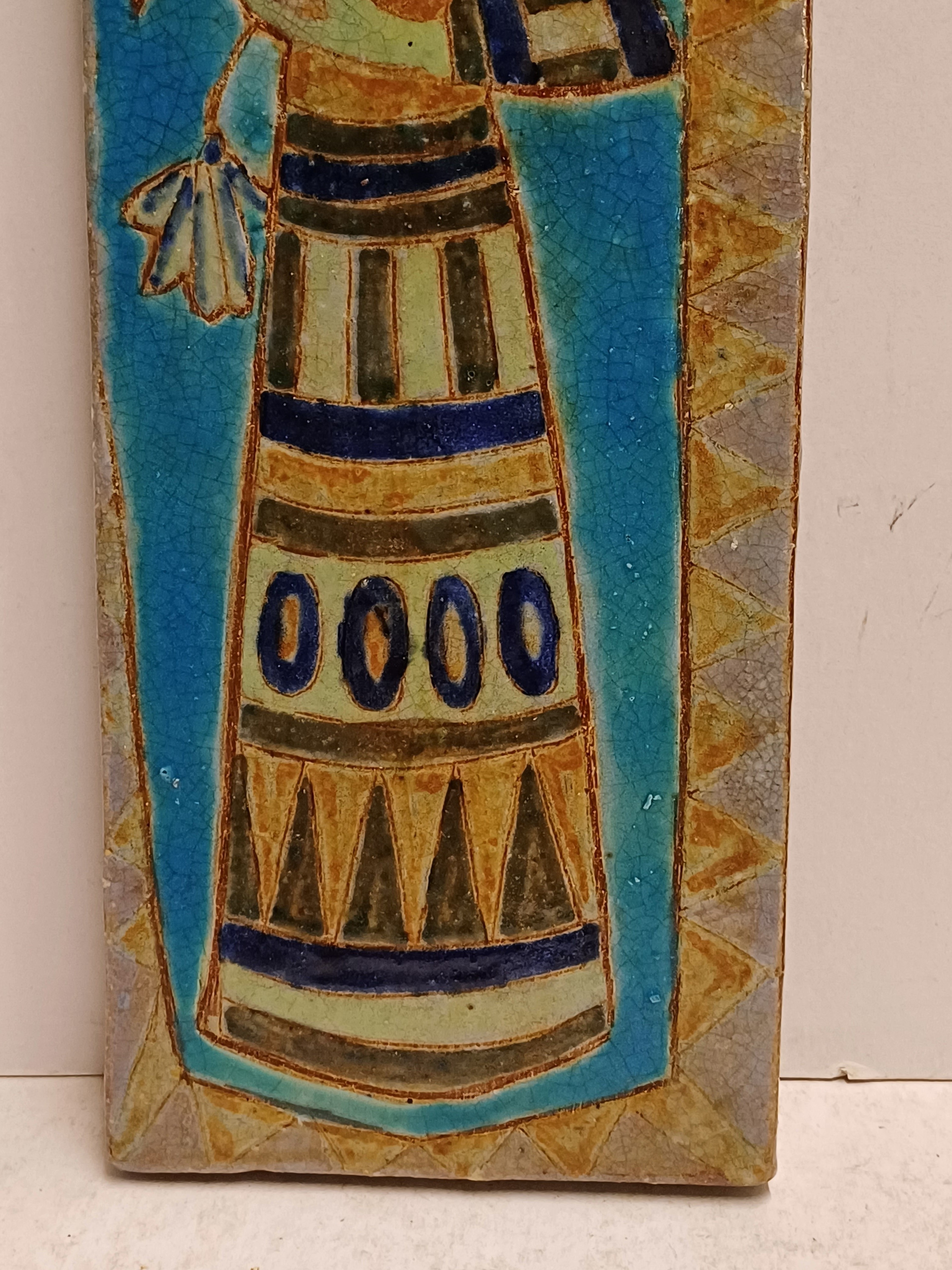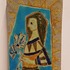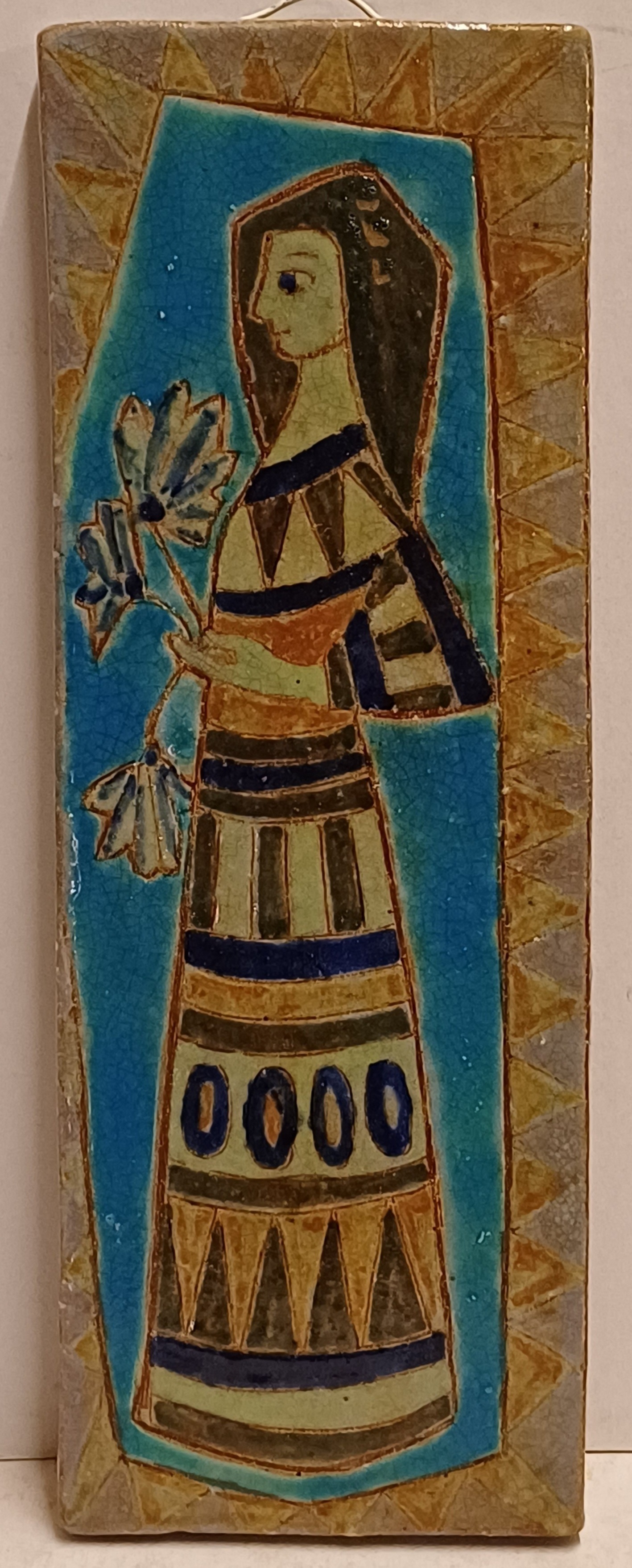 Earthenware tile with a polychrome depiction of a woman holding flowers in her hand. Signed on the back.