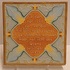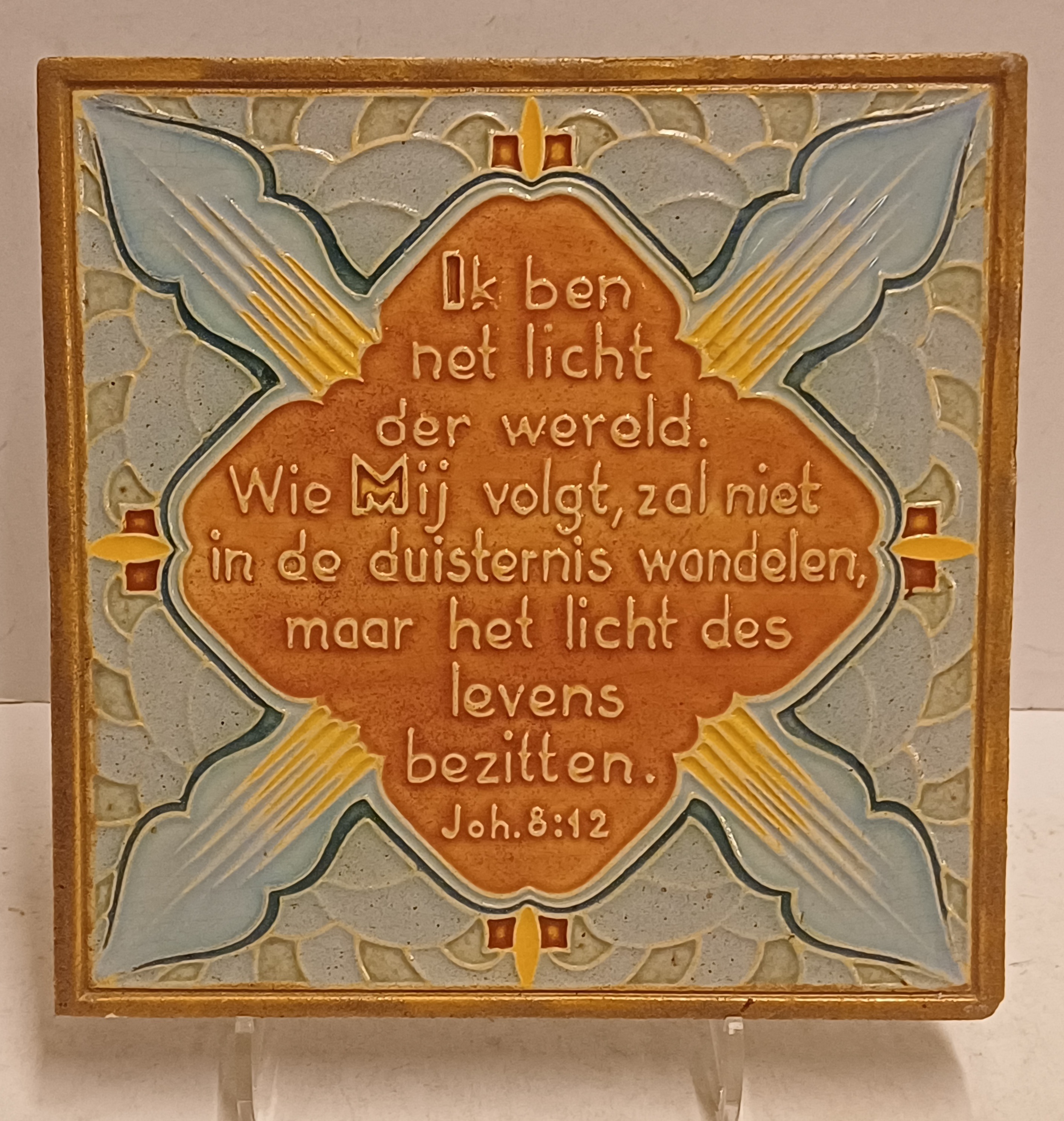 Cloisonne tegel met religieuze spreuk op de voorzijde. "Ik ben het licht der wereld. Wie mij volgt. zal niet in de duisternis wandelen, maar het licht des levens bezitten. Joh.8:12" Achterzijde met fabrieksmerk.