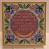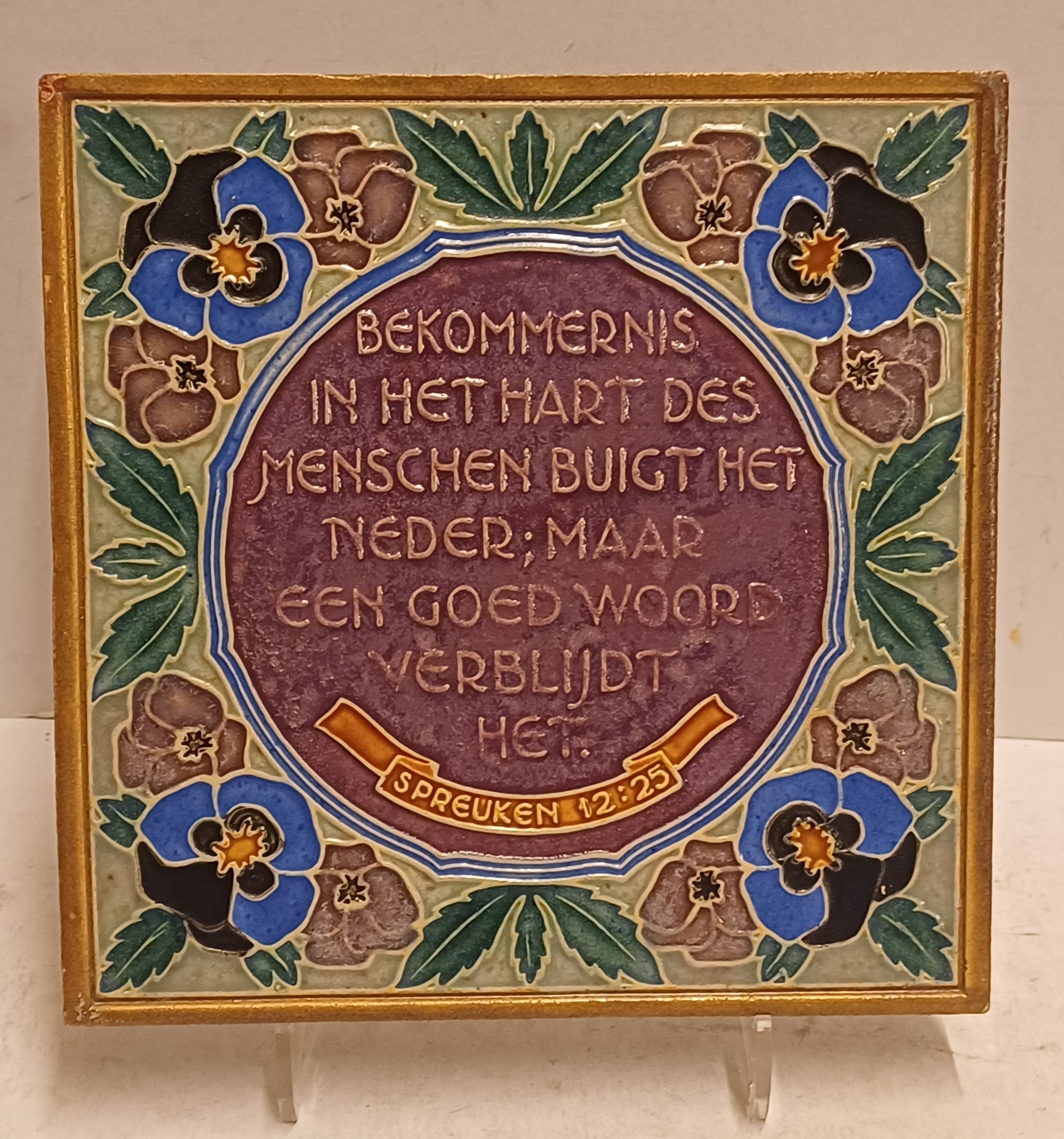 Cloisonne tegel met religieuze spreuk op de voorzijde. "Bekommernis in het hart des menschen buiogt het neder; maar een goed woord verblijdt het Spreuken 12:25" Achterzijde met fabrieksmerk.