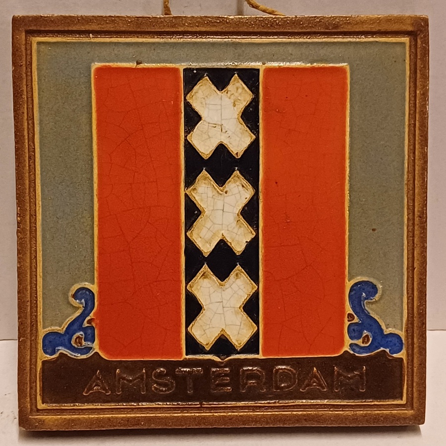 Aardewerken cloisonne tegel met het wapen van de stad Amsterdam. Achterzijde met fabrieksmerk.