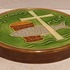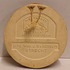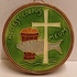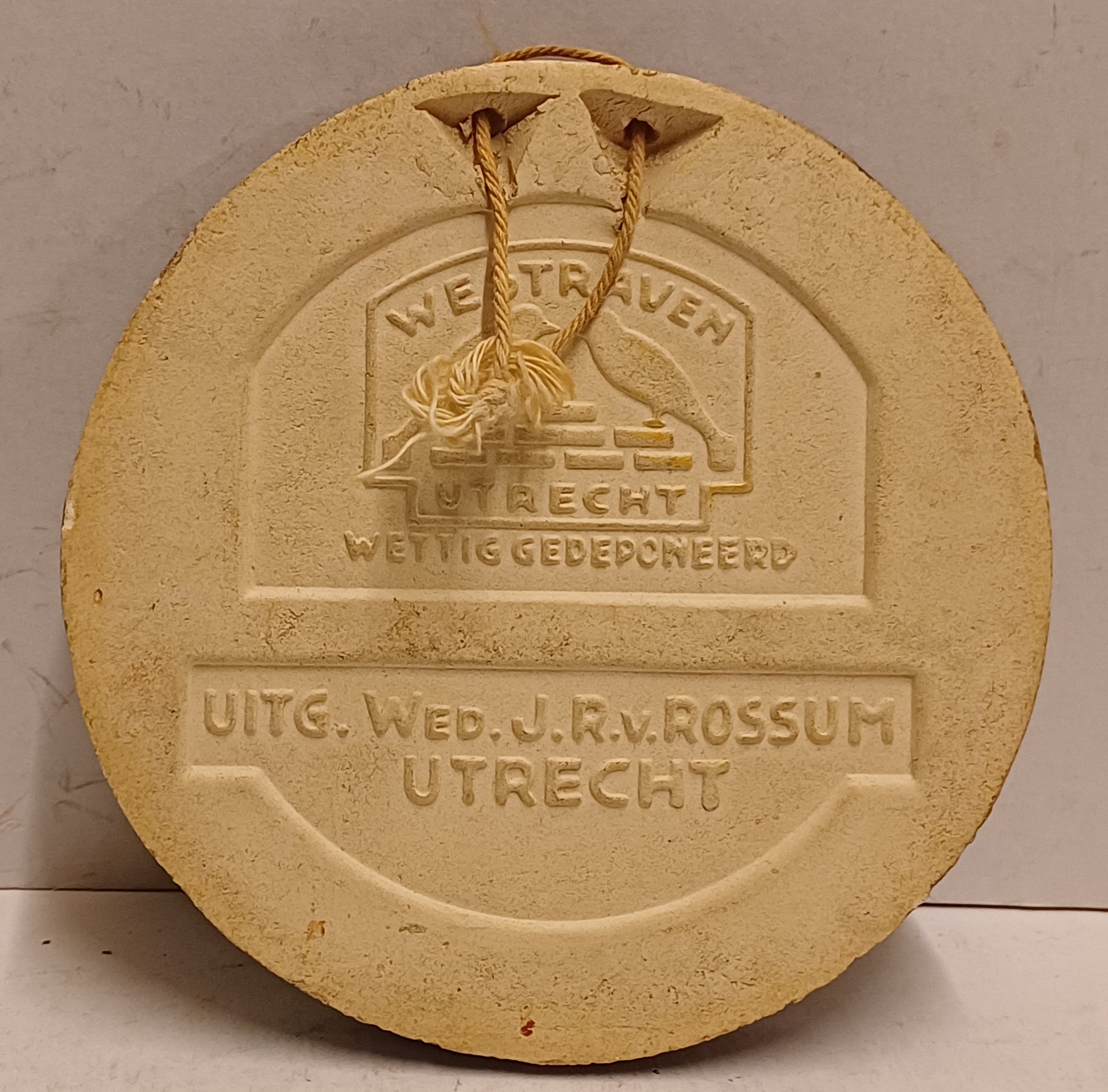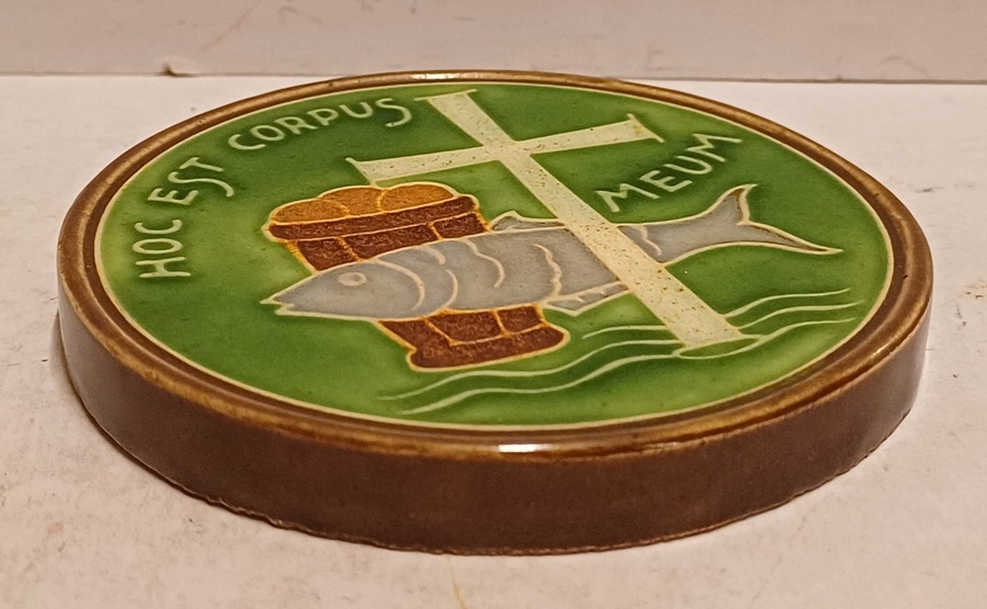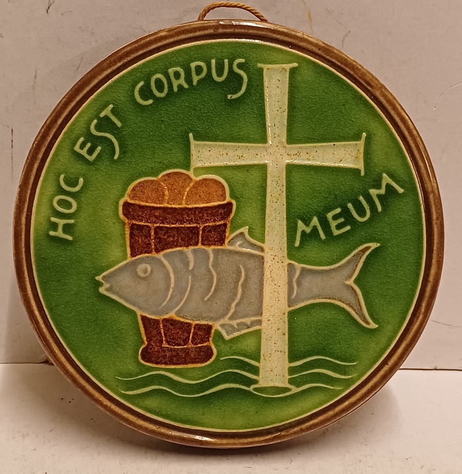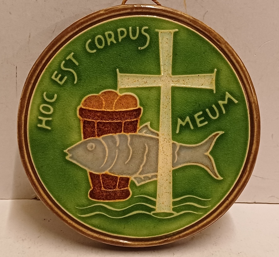 Ronde wandtegel met religieuze afbeelding en de tekst Hoc Est Corpus Meum. Achterzijde met fabrieksmerk.