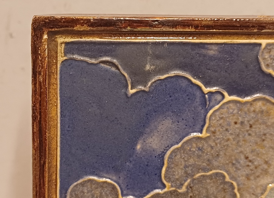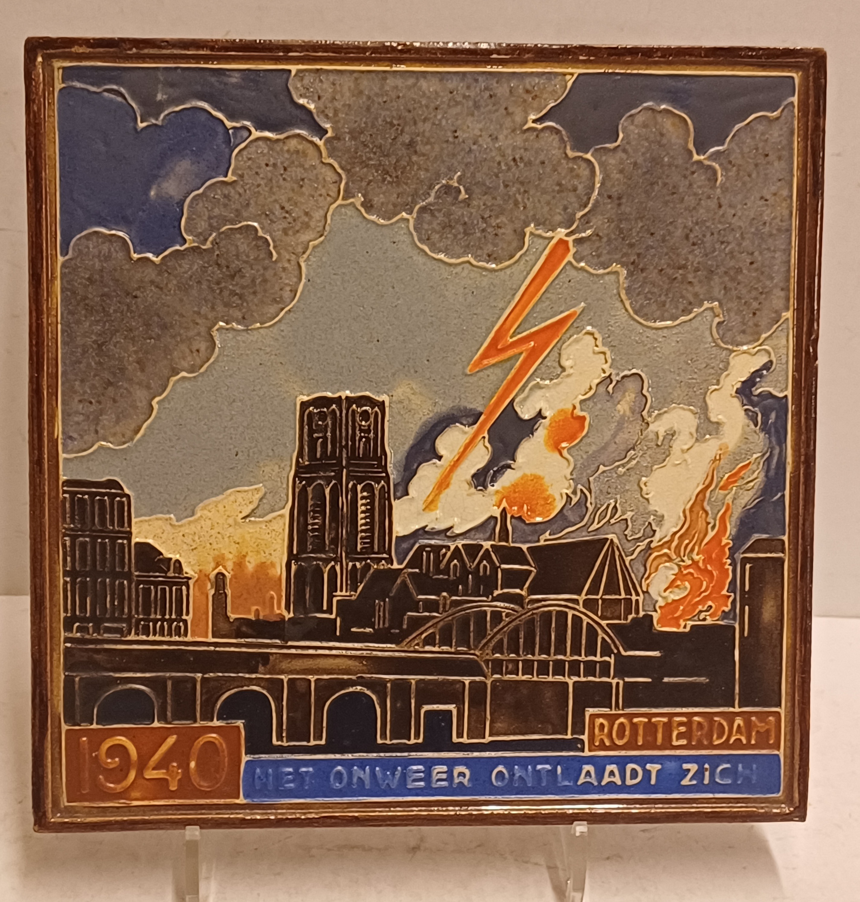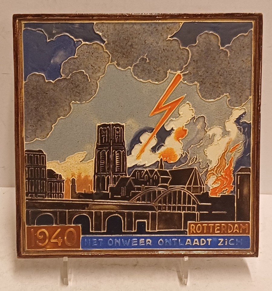 Cloissone tegel met afbeelding van een onweerswolk boven de stad Rotterdam en de tekst "1940 Rotterdam het onweer ontlaad zich". Achterzijde met fabrieksmerk