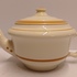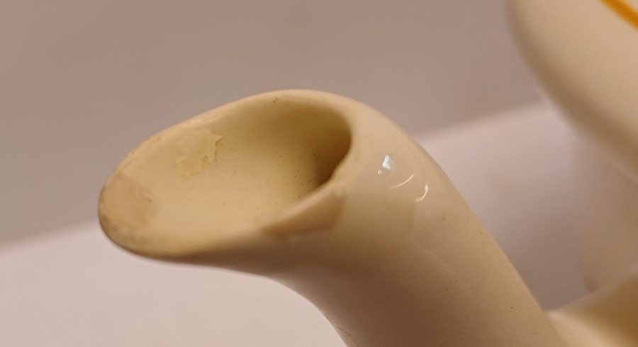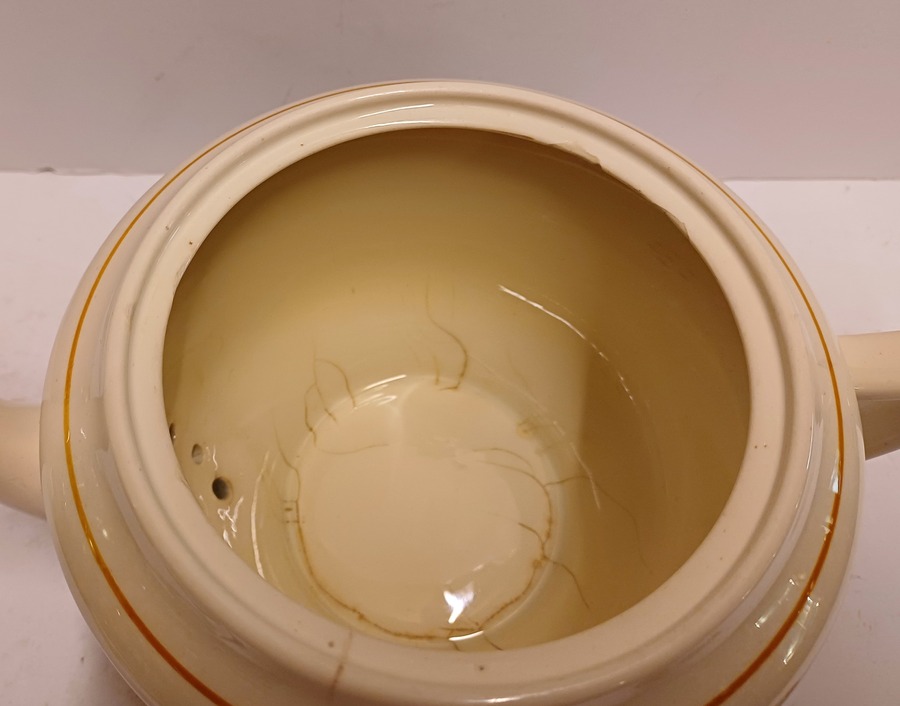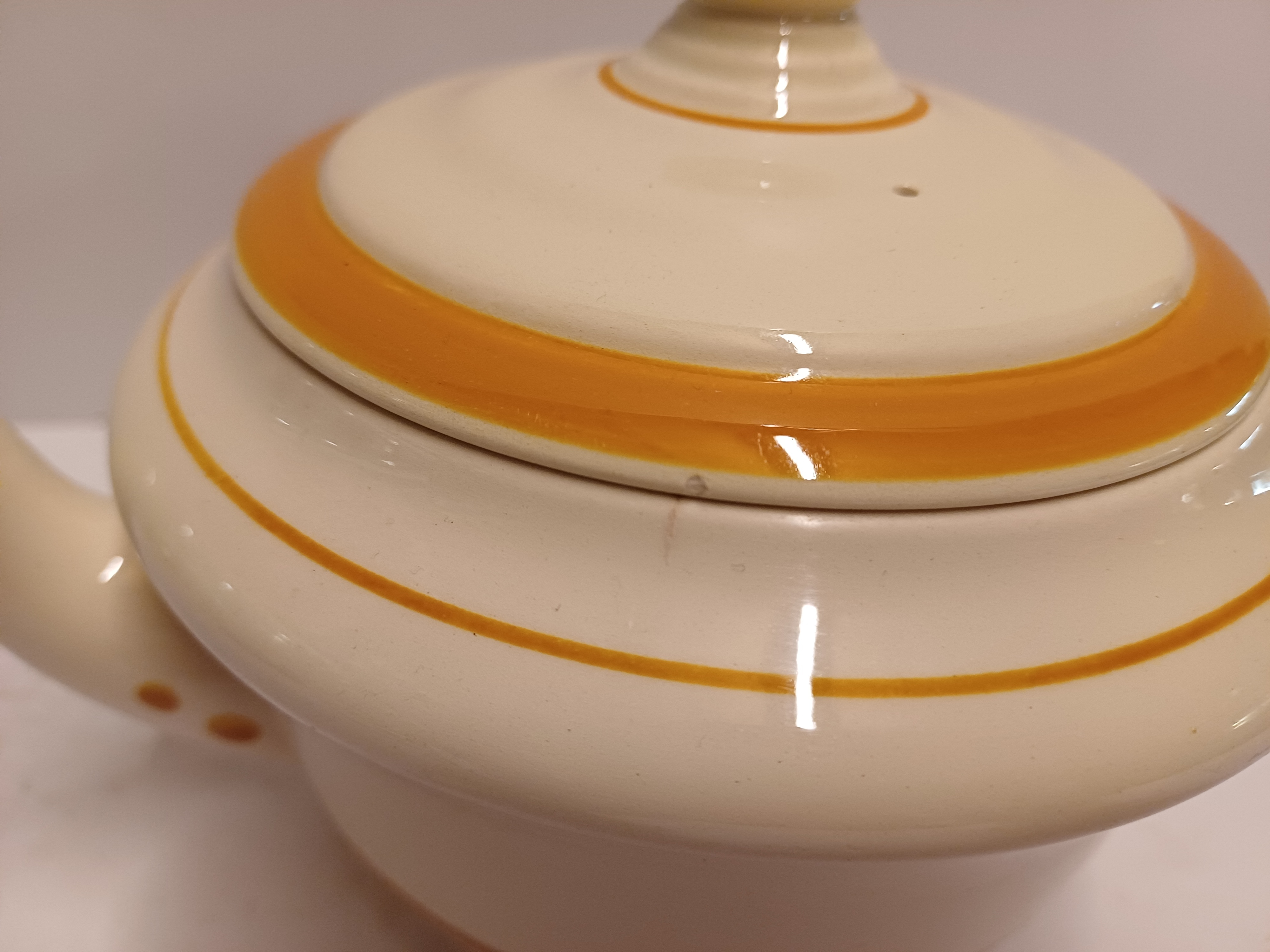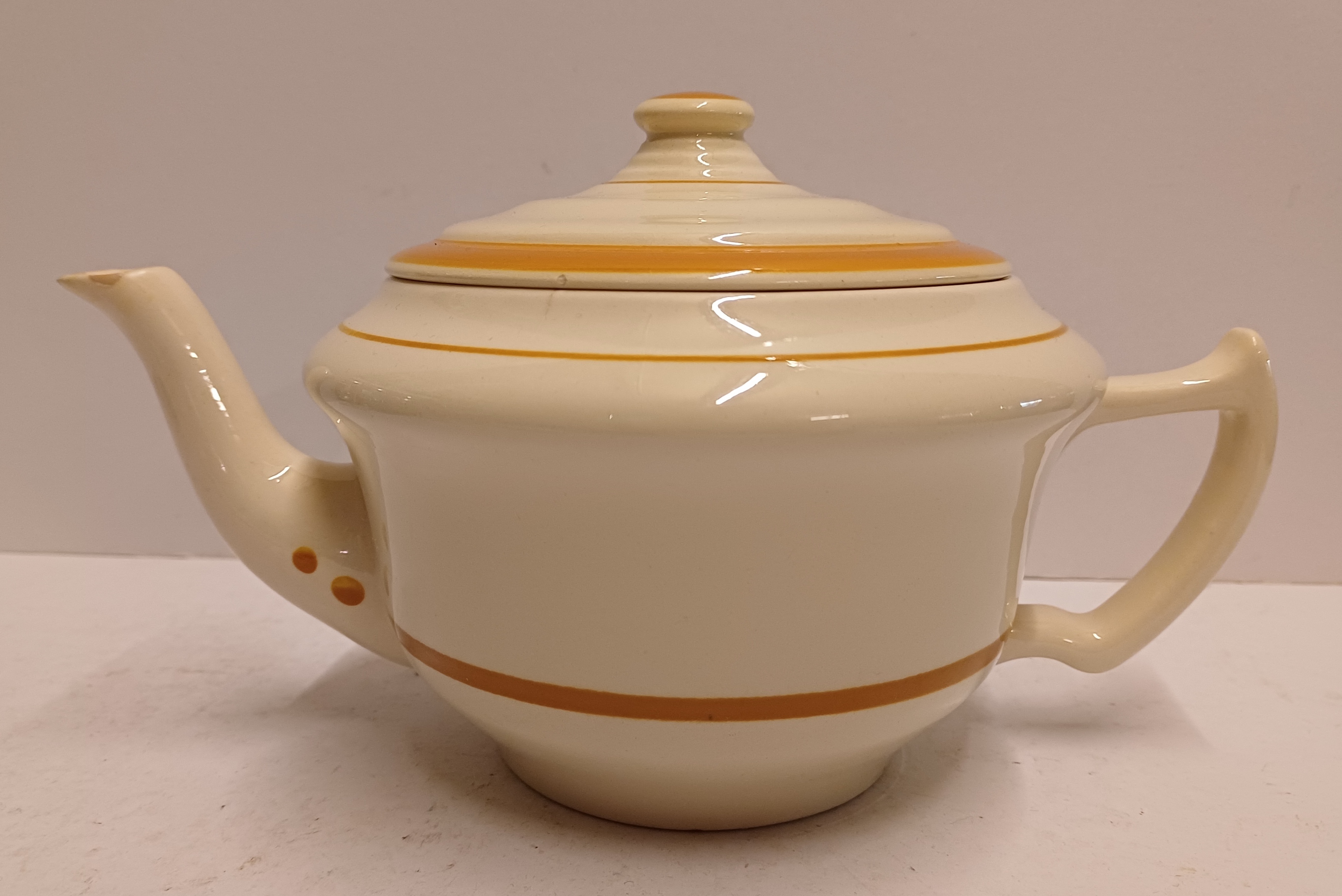 Faience teapot from Service A with ochre stripe decoration. Bottom with triangular mark, design by F.M.J. Mansvelt.
