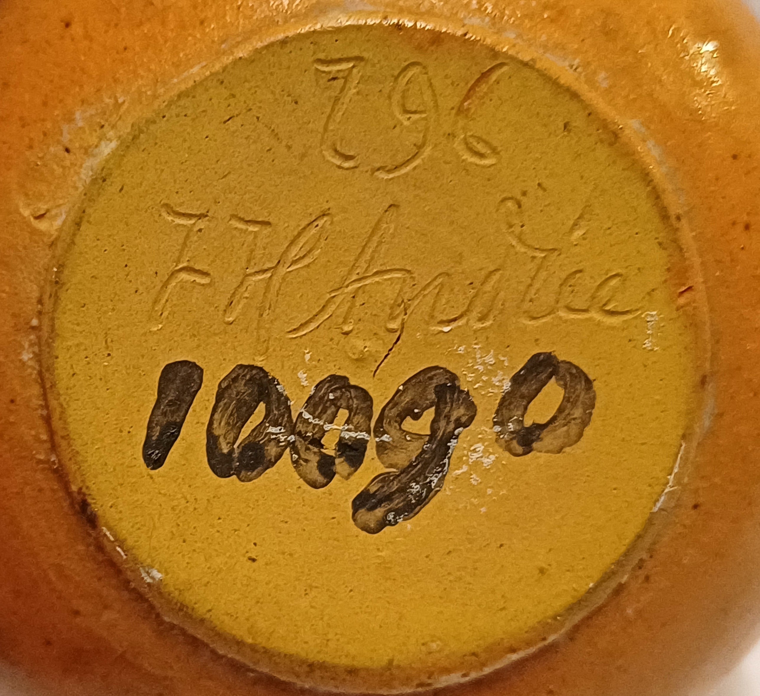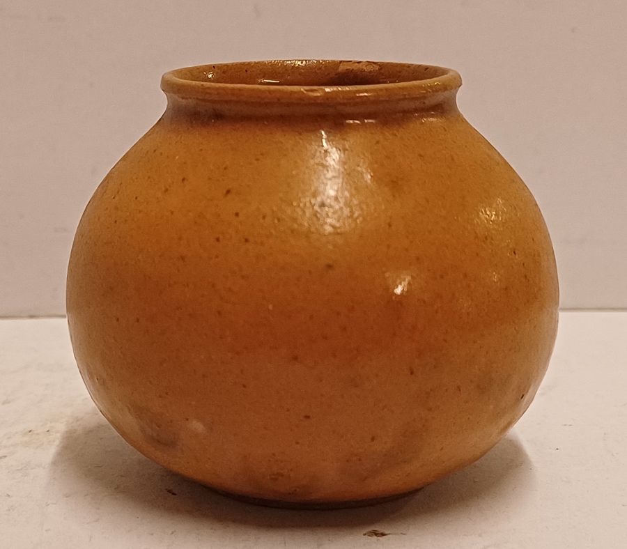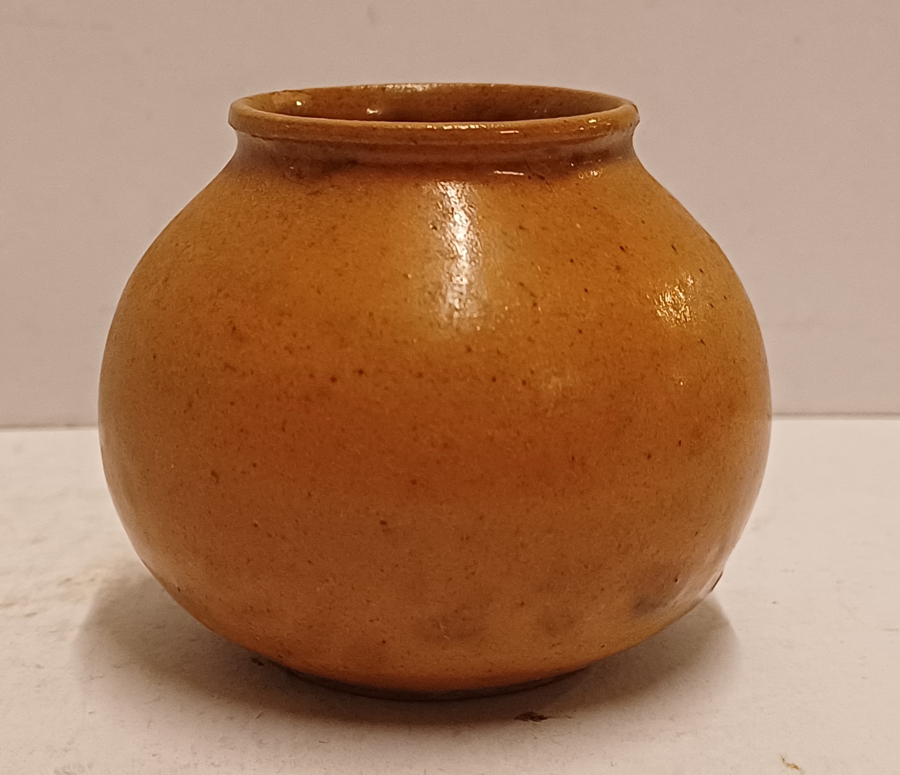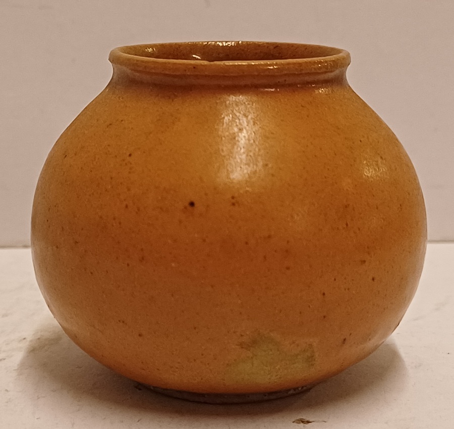 Earthenware small turned vase with matte orange-brown glaze. Bottom with signature, model number 796, and glaze code 10090.