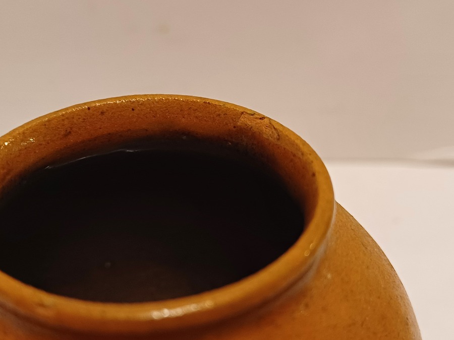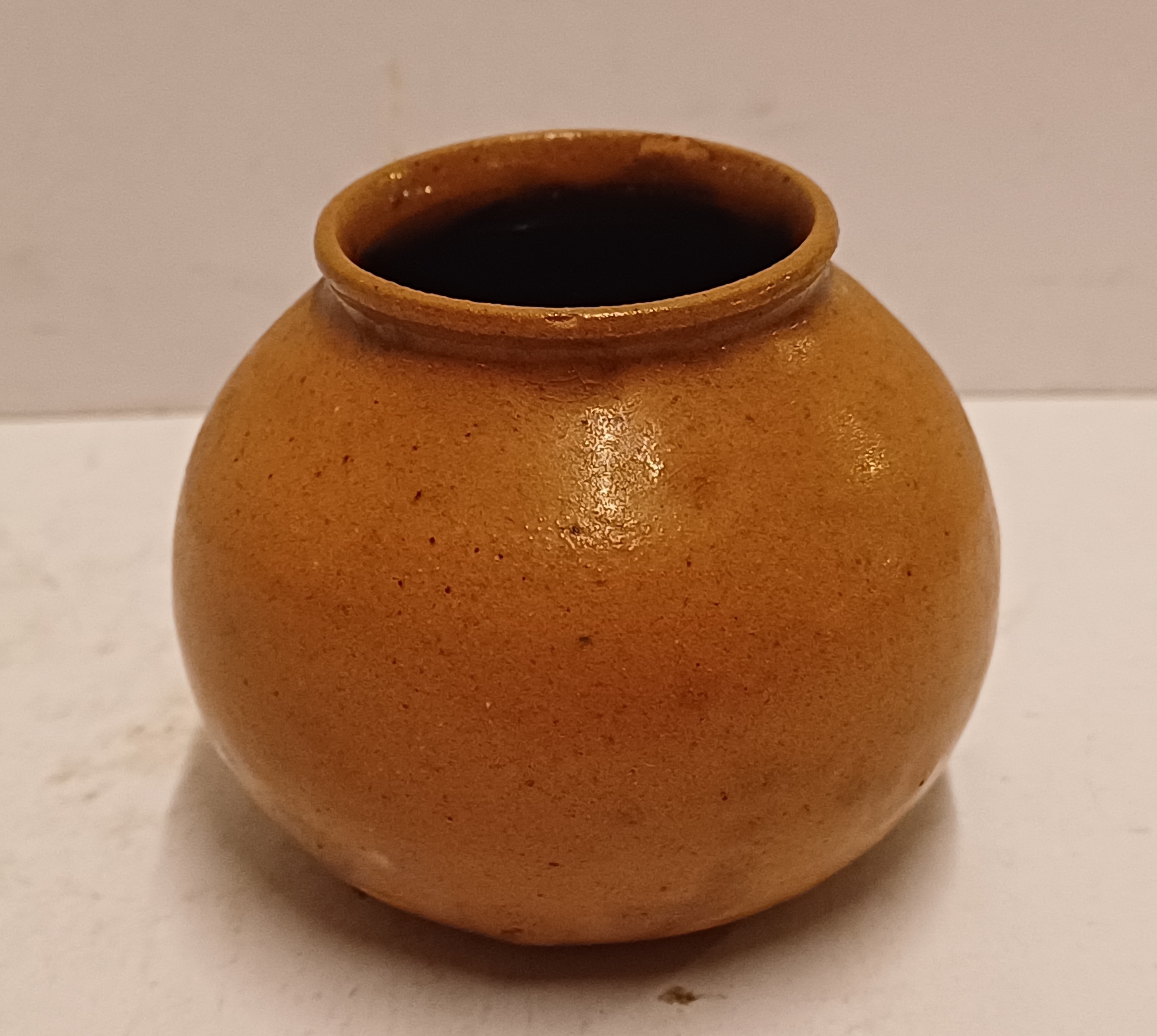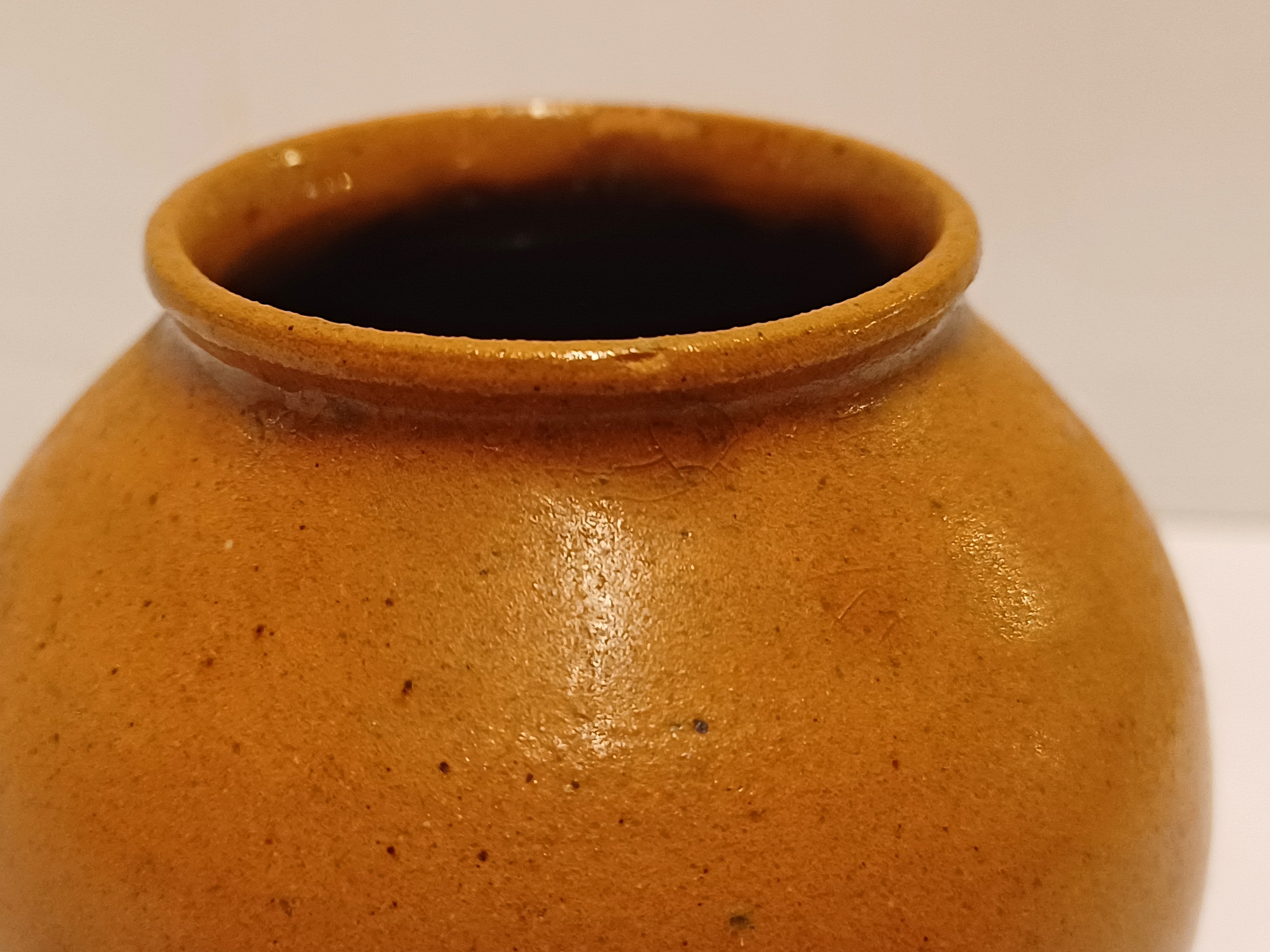 Earthenware small turned vase with matte orange-brown glaze. Bottom with signature, model number 796, and glaze code 10090.