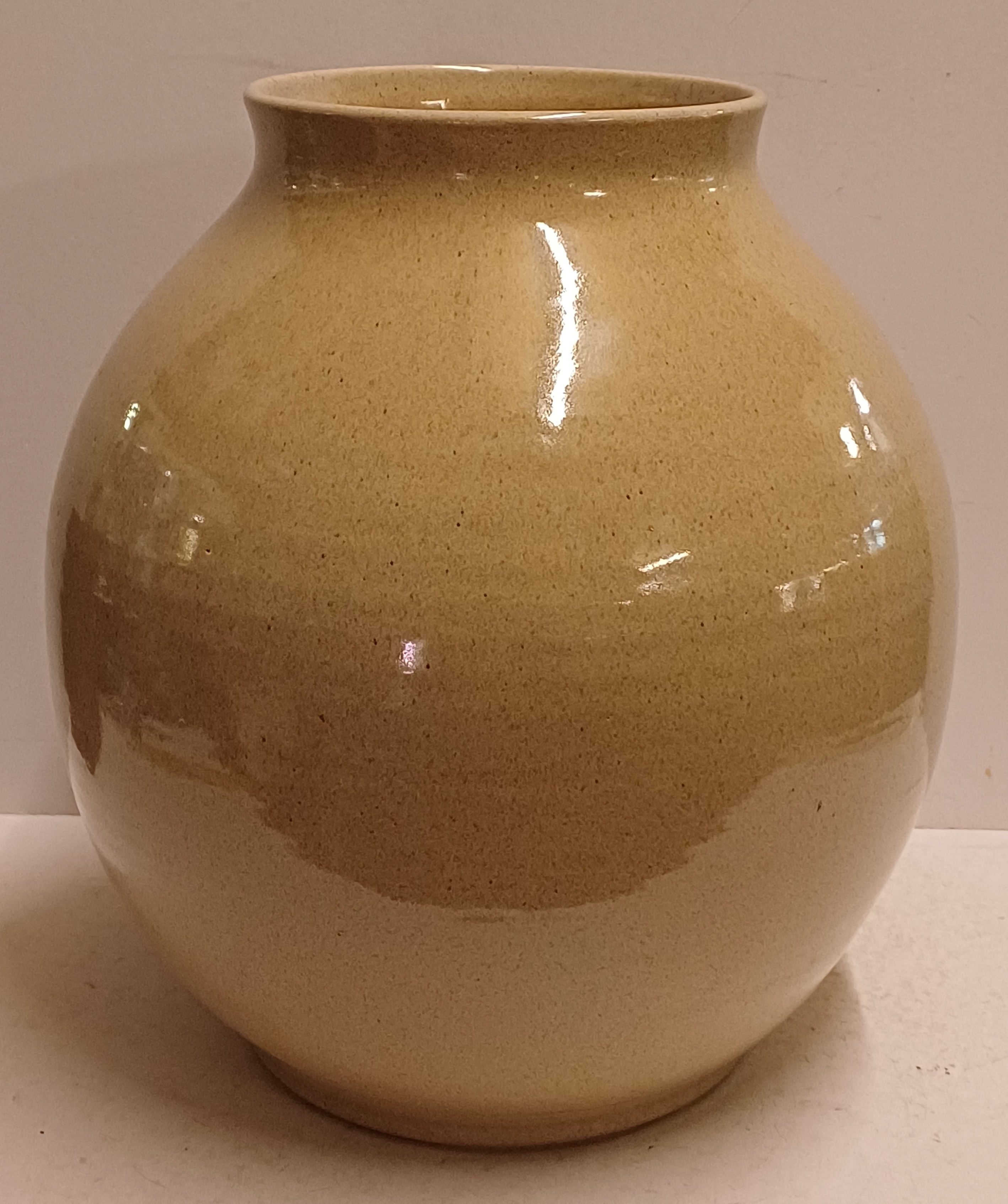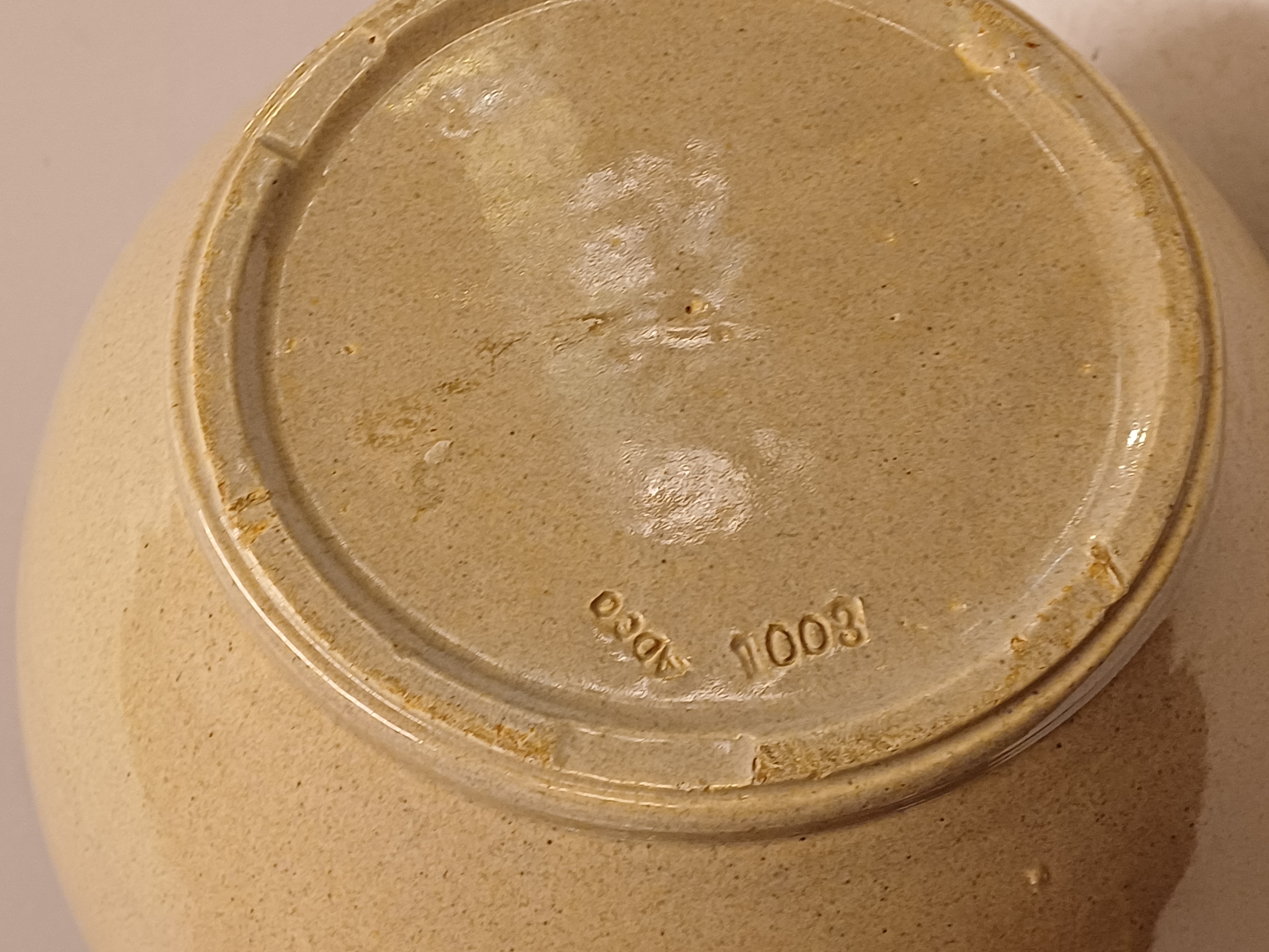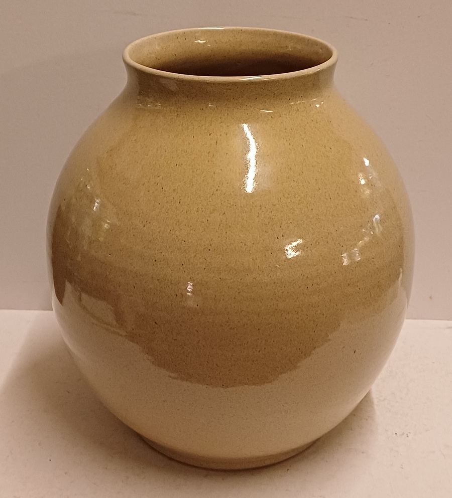 Largest size 1003 vase with beige glaze and light speckle. Bottom with factory mark and model number.