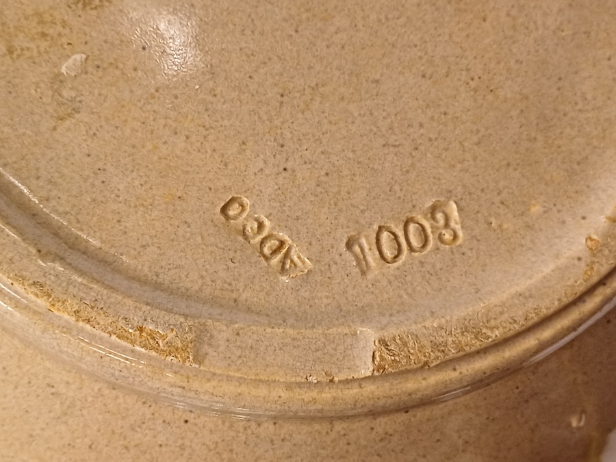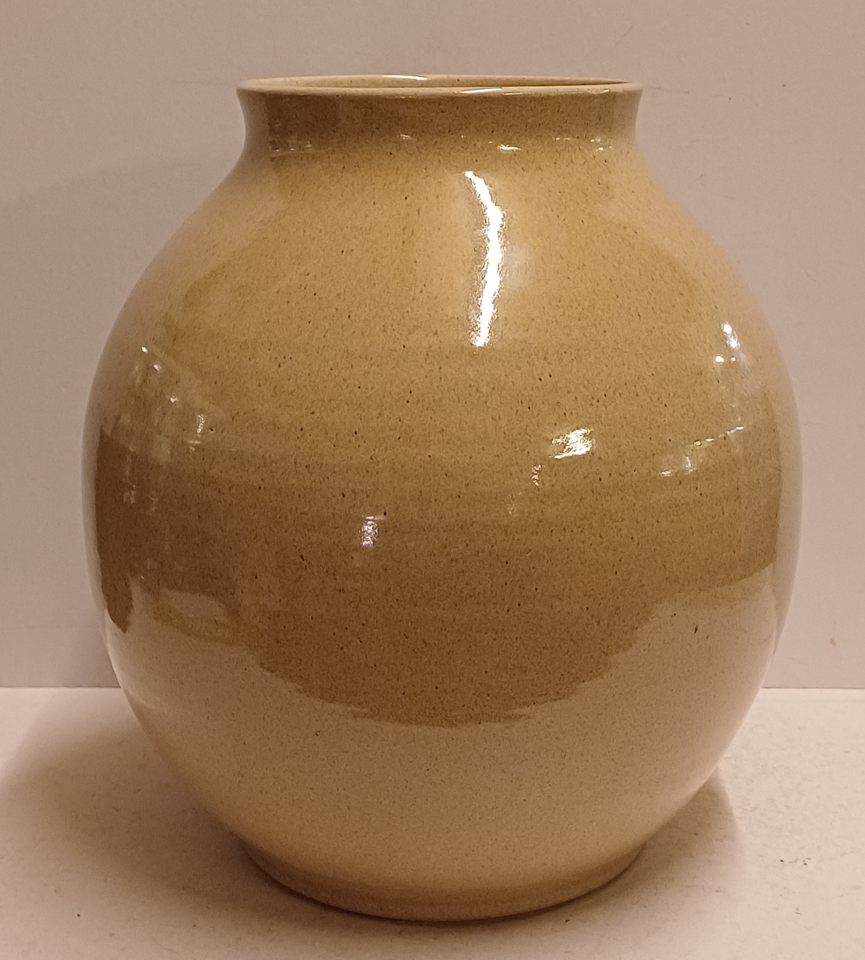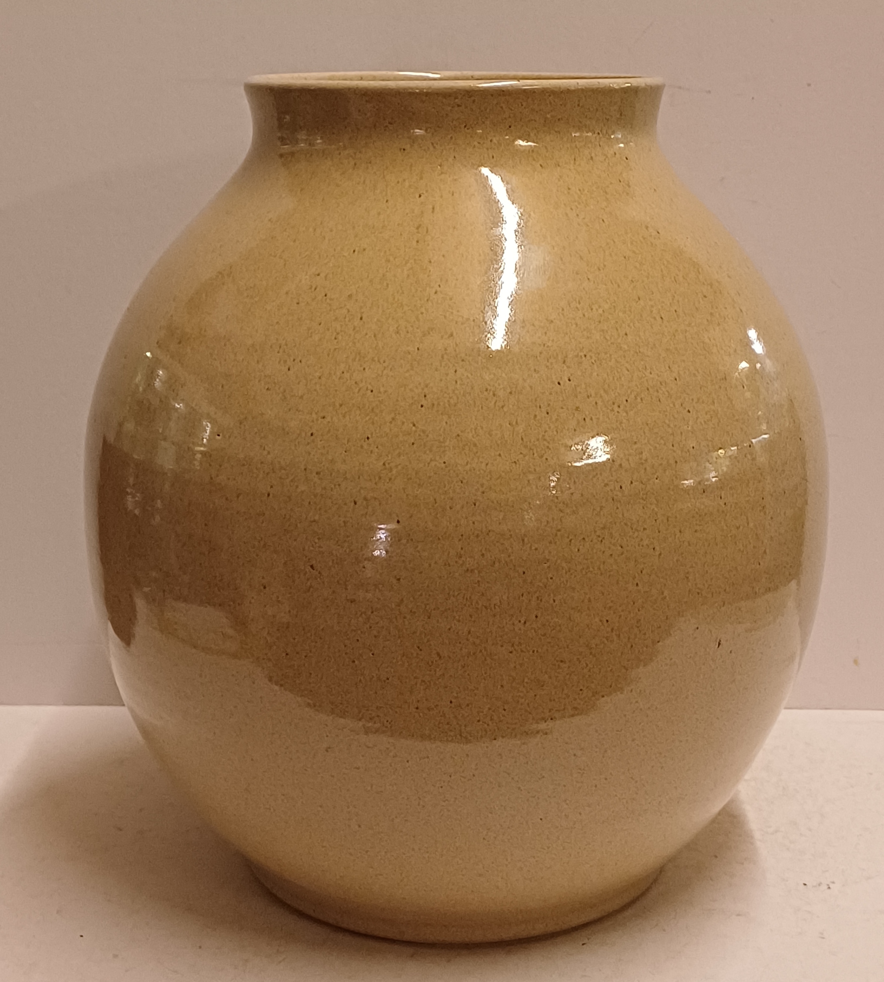 Largest size 1003 vase with beige glaze and light speckle. Bottom with factory mark and model number.