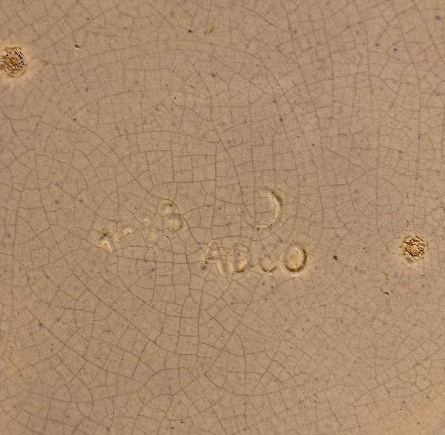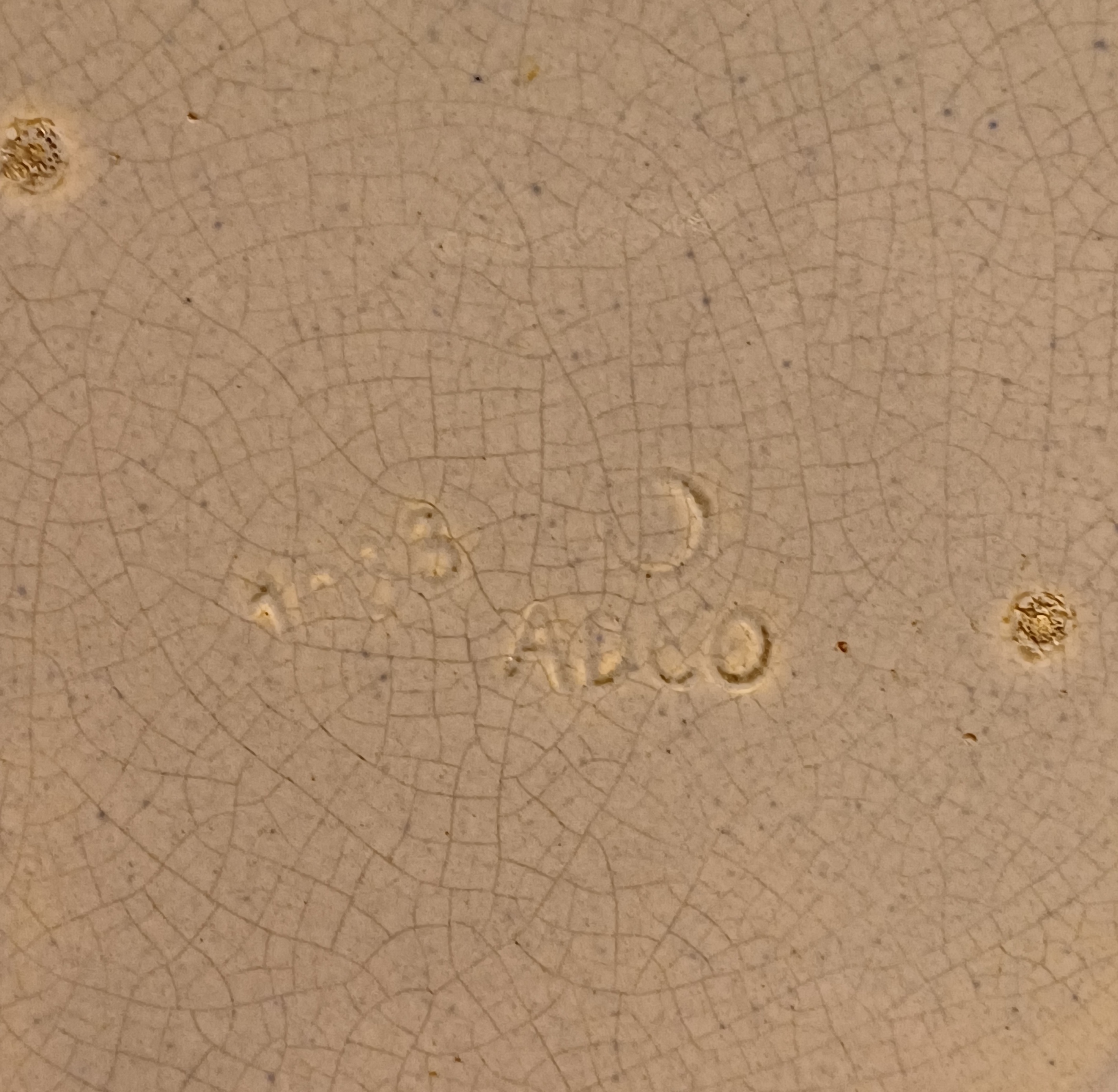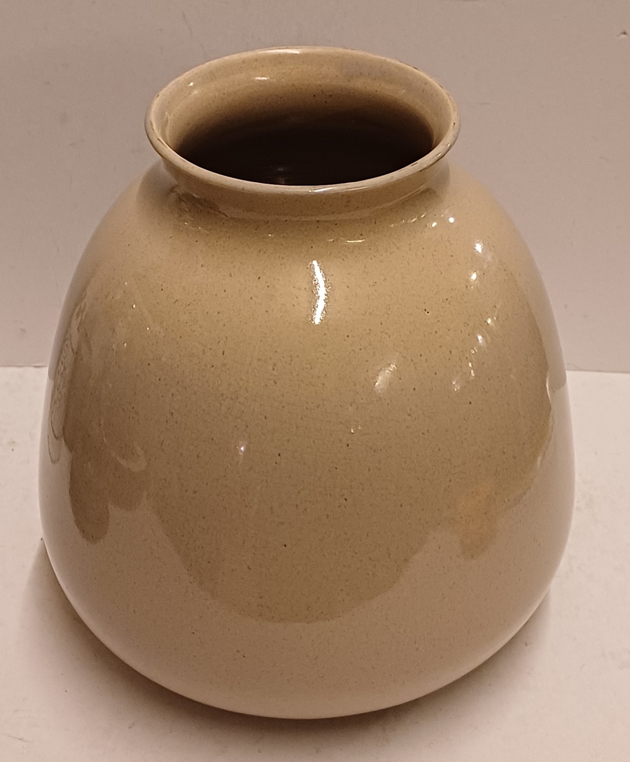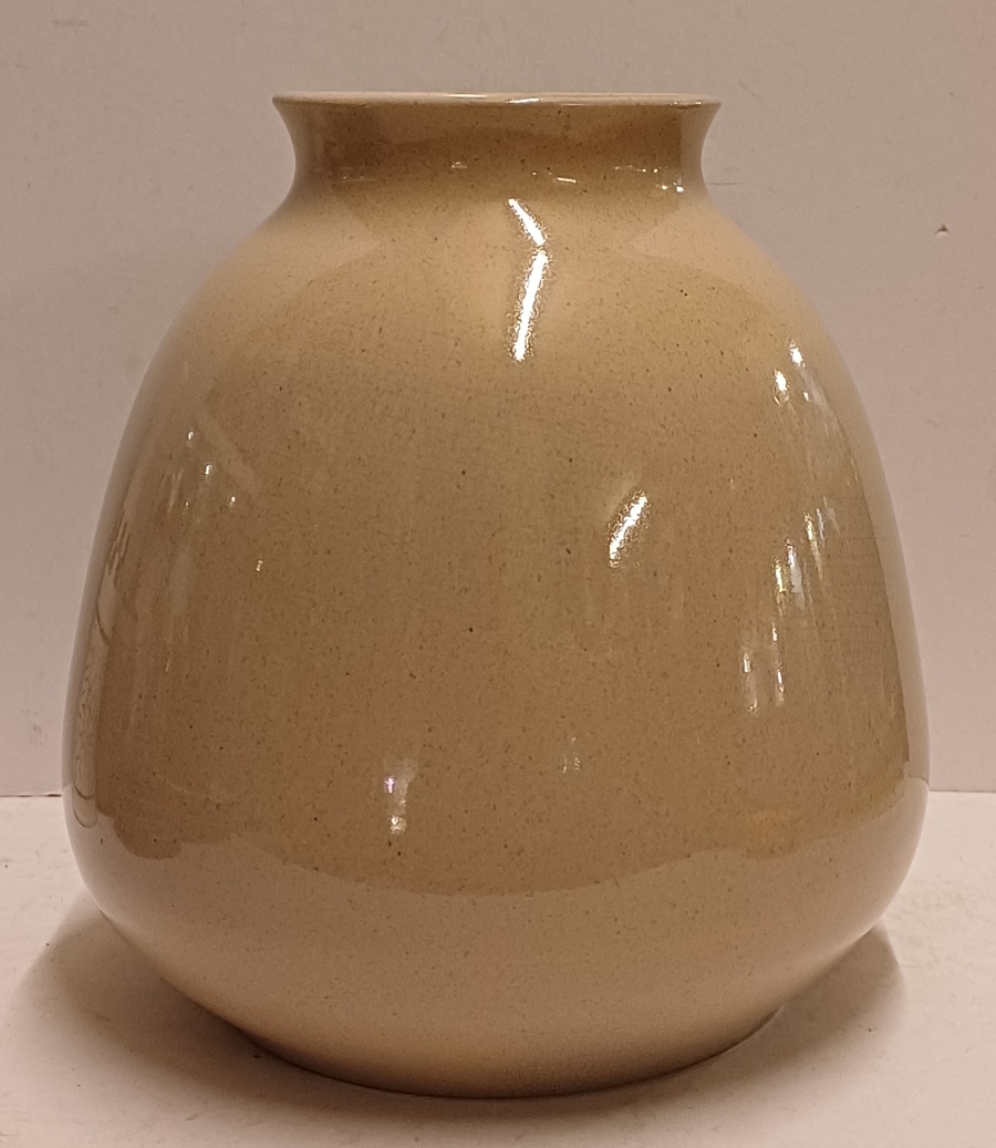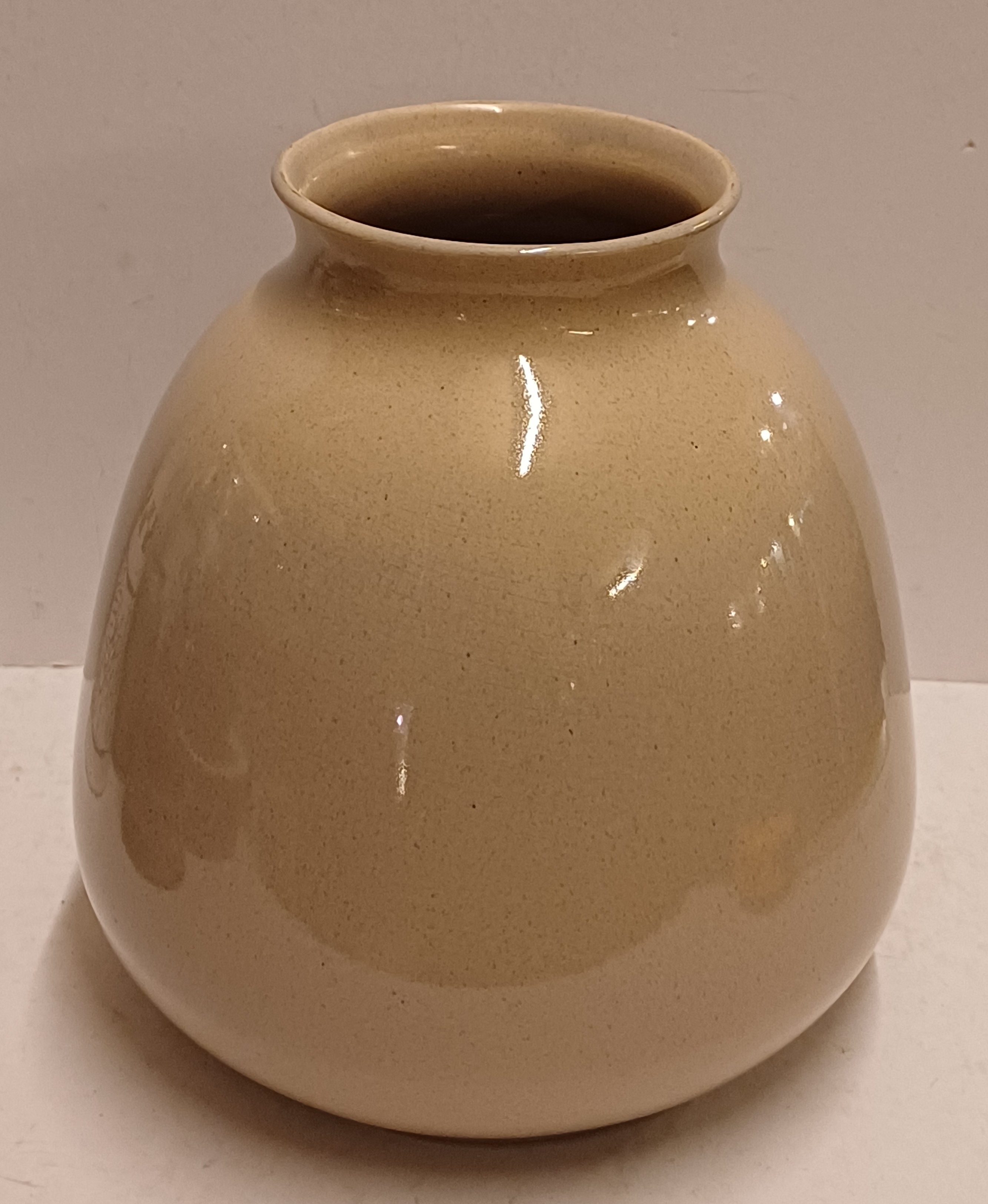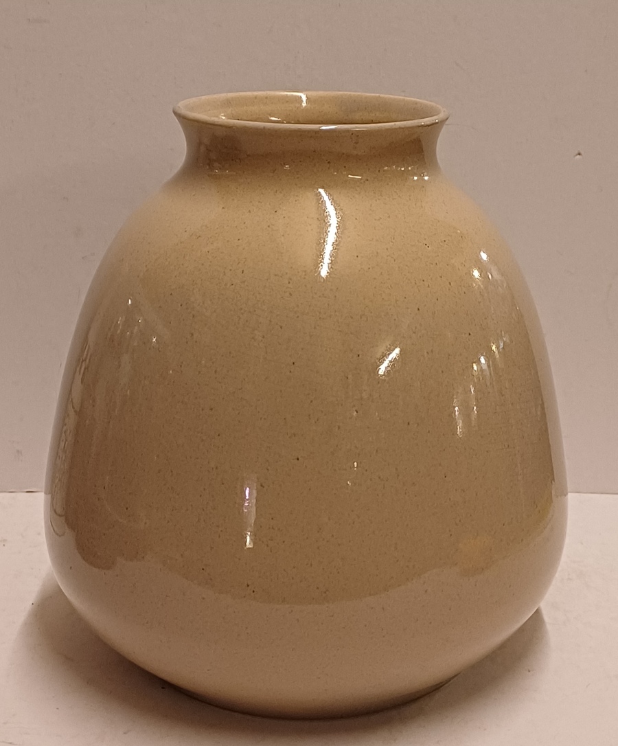 Aardewerken vaas met lichtbruine glazuur. Onderzijde met fabrieksmerk en modelnummer.