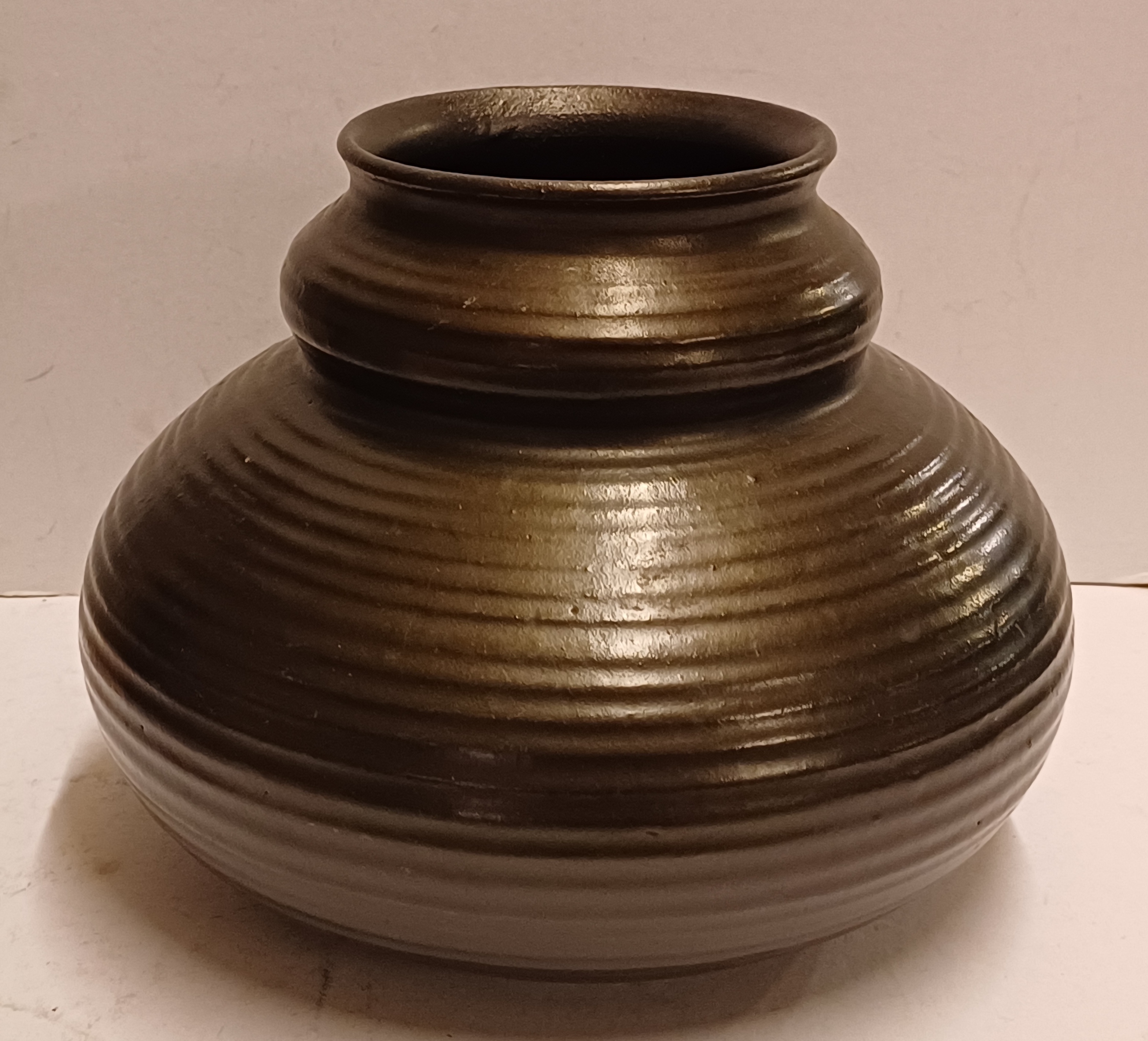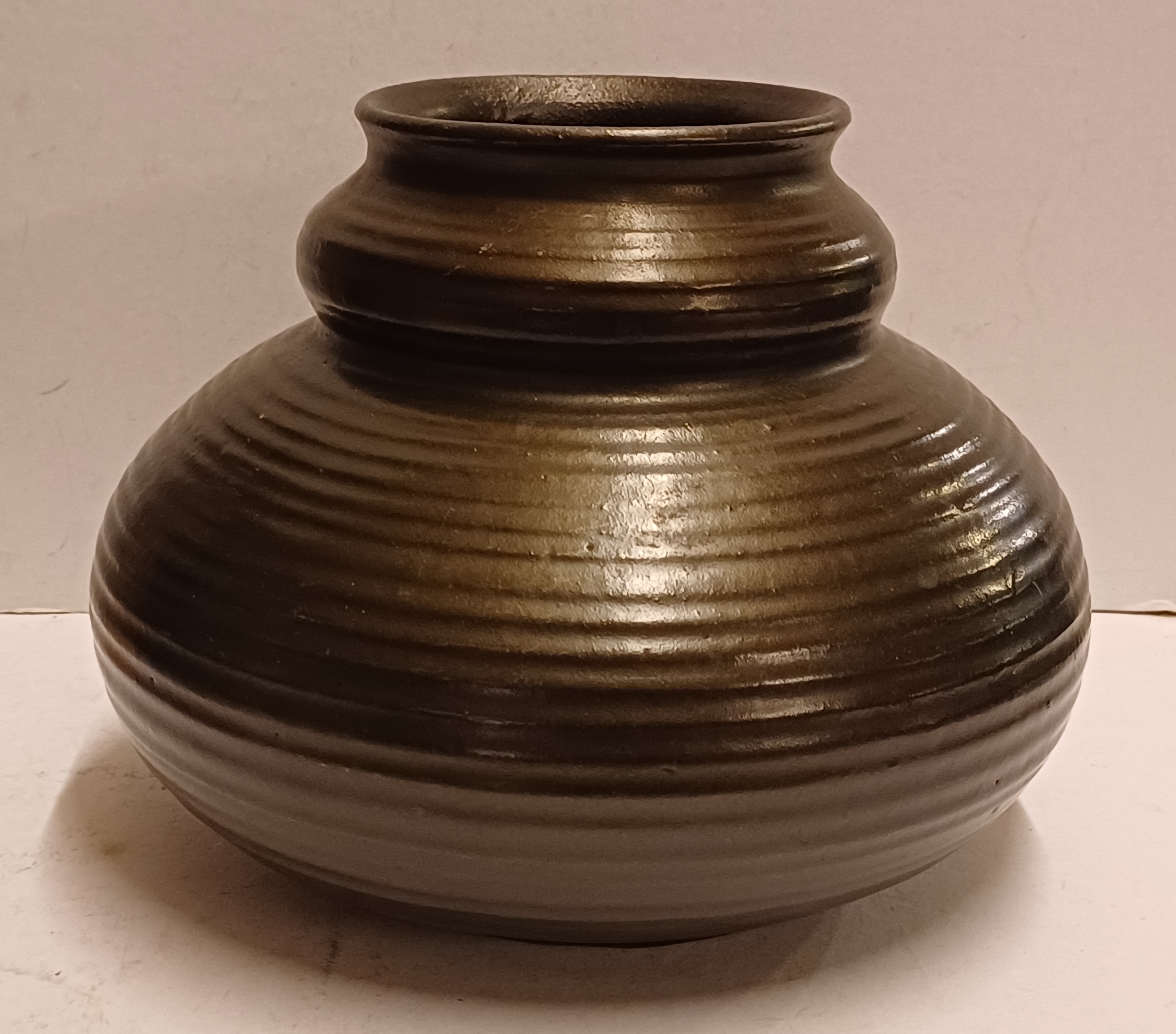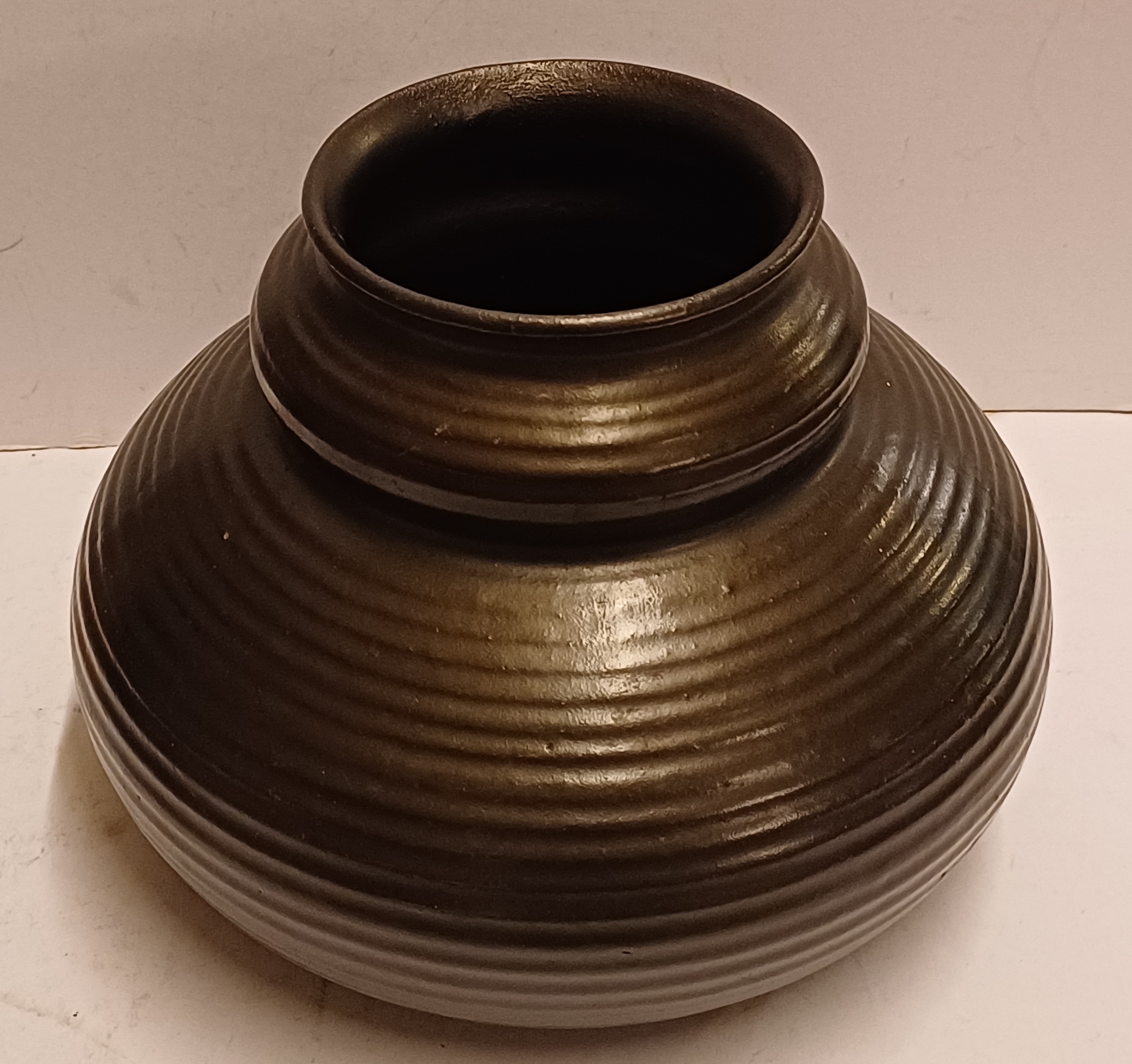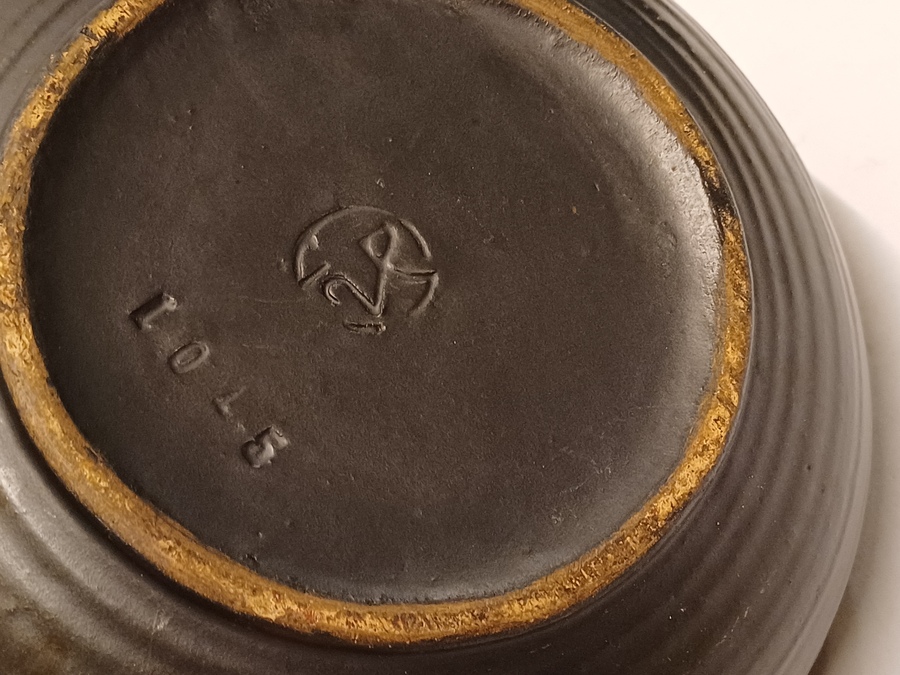 Zwart geglazuurde vaas met ribbel decor. Onderzijde gemerkt met fabrieksmerk en modelnummer.